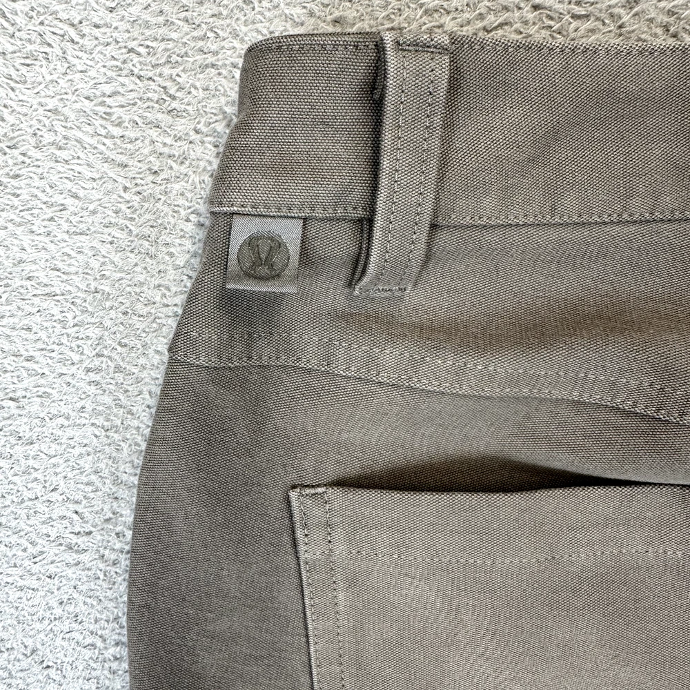 Front Type: Flat Front Color: Gray Vintage: No Fit: Slim Leg Style: Straight Personalize: No Size: 31 Handmade: No Features: Stretch Season: Fall, Spring, Summer, Winter Closure: Button, Zip Department: Men Material: Cotton, Elastolefin, Polyester Rise: Mid (10-12 in) Theme: City, College, Hipster, Logo, Preppy Inseam: 33 in Pocket Type: 5-Pocket Design Type: Pants Size Type: Regular Accents: Five Pocket Design Pattern: Solid Style: Chino Waist Size: 32 in Occasion: Business, Casual, Workwear Product Line: ABC Pant Brand: Lululemon Fabric Type: Canvas Garment Care: Machine Washable