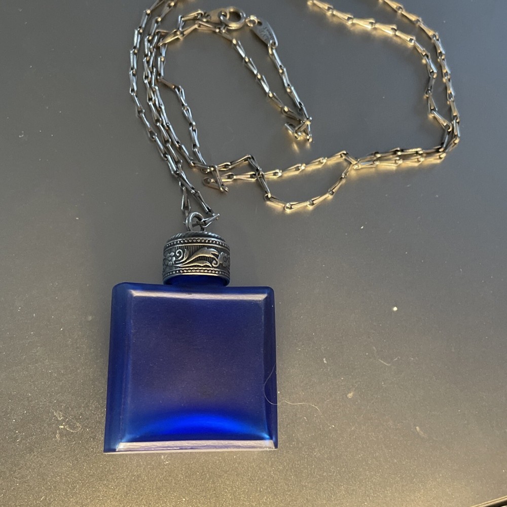This is a LVP La Vie Parisienne France necklace featuring a perfume bottle pendant in cobalt blue. The necklace has a silver tone chain and measures 31 inches in length. It has a vintage vibe and is designed in a style that includes both a chain and a pendant. The pendant is an empty blue perfume bottle, ready to add your favorite scent. Please look at photos, as this is the exact item that you will receive! Pictures are the best description and feel free to ask questions of items before bidding. Please note that vintage items were cherished by a previous owner, and may have been worn. I clean and polish item but remember vintage items are rarely in "mint/perfect" condition. Each vintage item is closely looked at before listed, and it is described as detailed as possible. Please refer to the item pictures to view more about their condition Note that coin or any photo props in the pictures are not included.