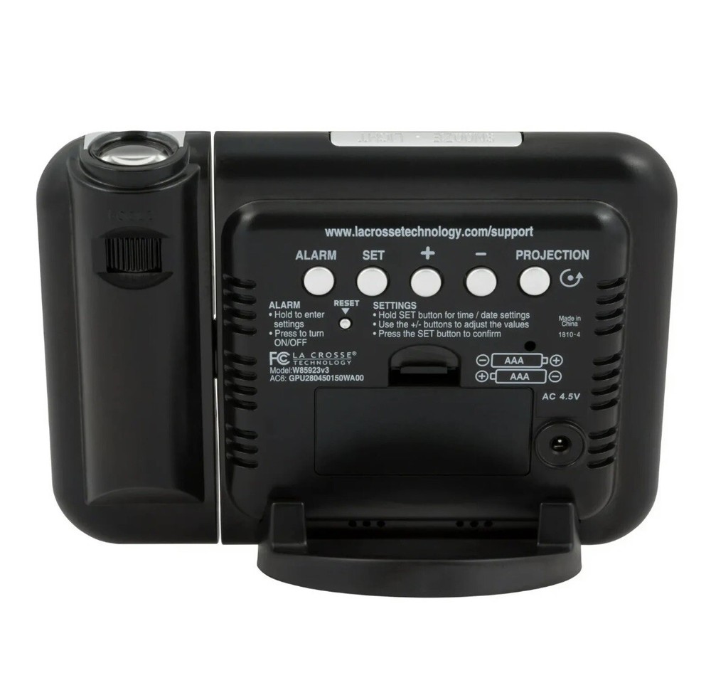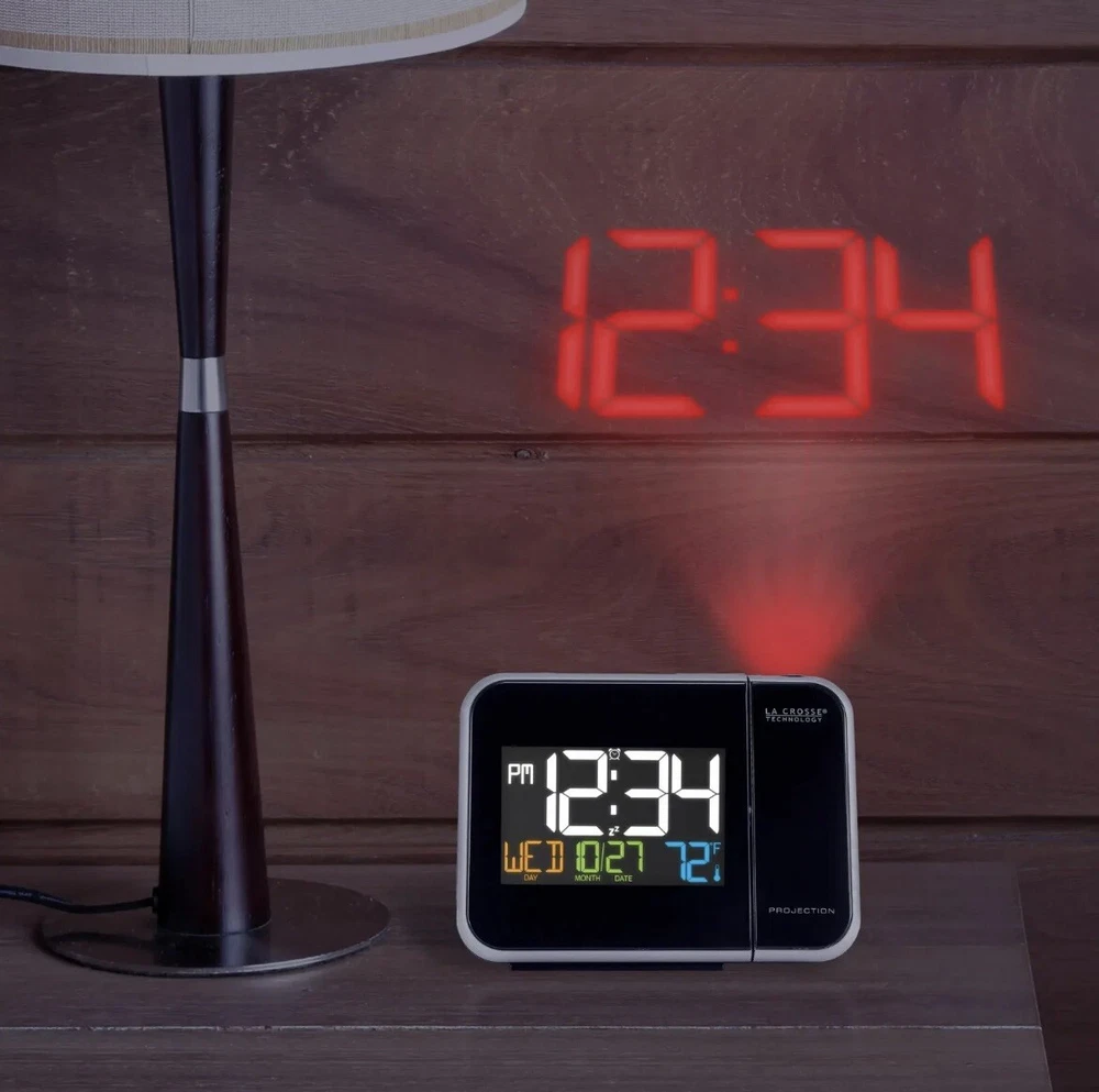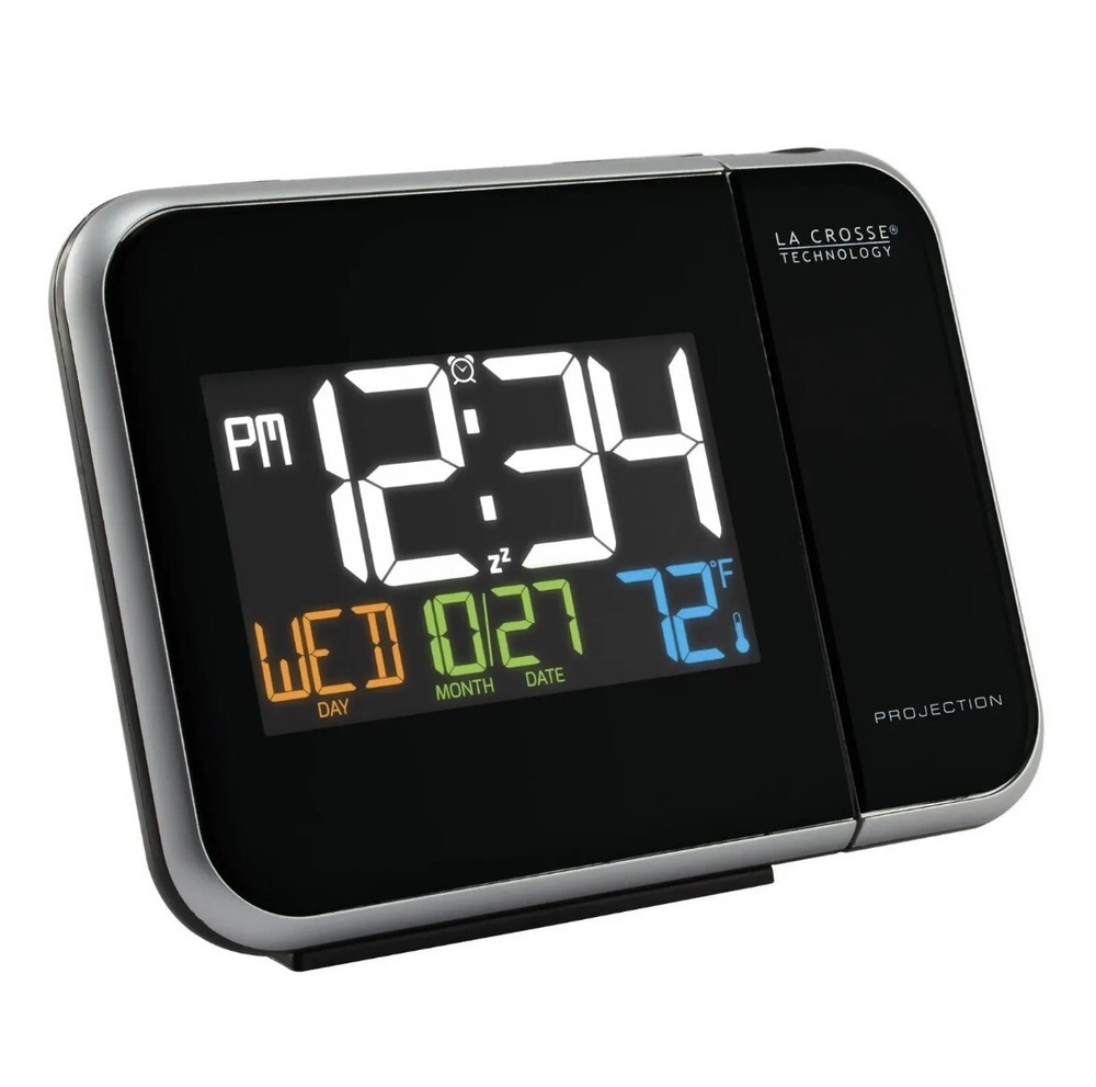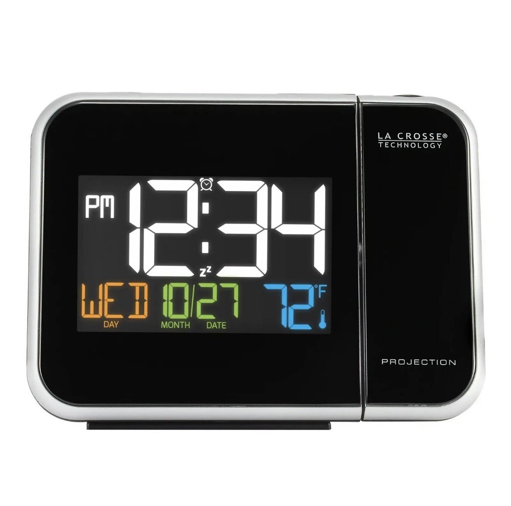 Enhance your bedside experience with the La Crosse Technology W85923 Color Projection Alarm Clock. This sleek device not only displays the time in vibrant colors but also projects it onto your ceiling or wall for easy viewing. Monitor indoor temperatures and stay informed with the integrated calendar feature.  Features: • Projects time onto wall or ceiling with adjustable focus and rotation • Displays indoor temperature in °F or °C • 12/24-hour time formats • Full calendar display: month, date, and weekday • Alarm with snooze function • Backlight with adjustable brightness • Compact design suitable for nightstands or desks     Dimensions: 5.91” L x 2.17” W x 4.33” H