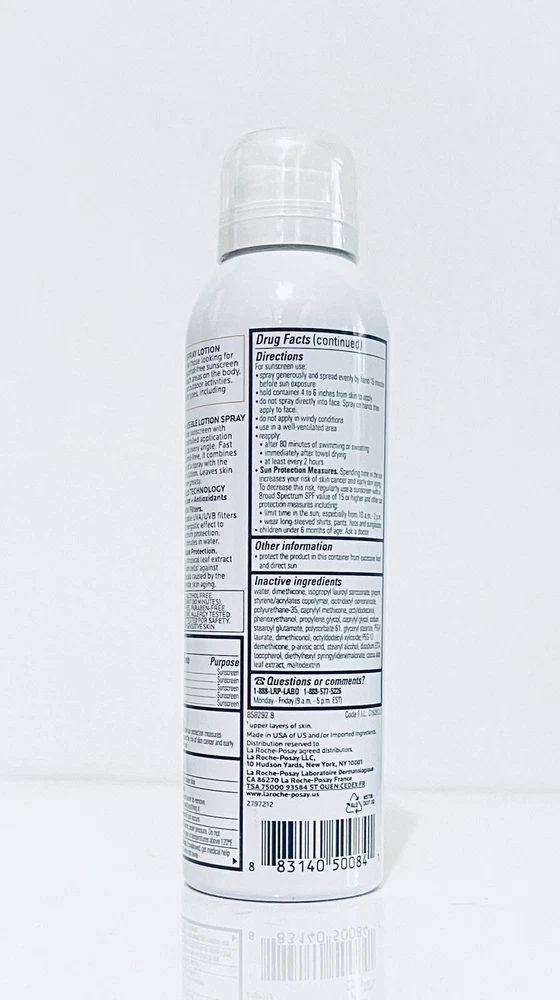 gtin13: 0883140500841 Weight: 0.42lbs. Period After Opening (PAO): 12M Size: 5 fl oz Features: Gluten-Free, Waterproof, Oil-Free, Alcohol-Free, Animal Cruelty-Free, Hypoallergenic, Non-Comedogenic, Unscented, Paraben-Free, Perfume-Free UPC: 0885781068131, 0883140500841 Ingredients: Water, Aloe Vera Type: Physical (Mineral) Sunscreen UVA Protection: UVA (EU Compliant), Broad Spectrum Body Area: Head, Face, Full Body, Leg Formulation: Spray GTIN: 0885781068131, 0883140500841 Product Line: La Roche-Posay Volume: 5 fl oz Sun Protection Factor (SPF): SPF 60 Brand: La Roche-Posay Active Ingredients: Aloe Vera Skin Type: All Skin Types