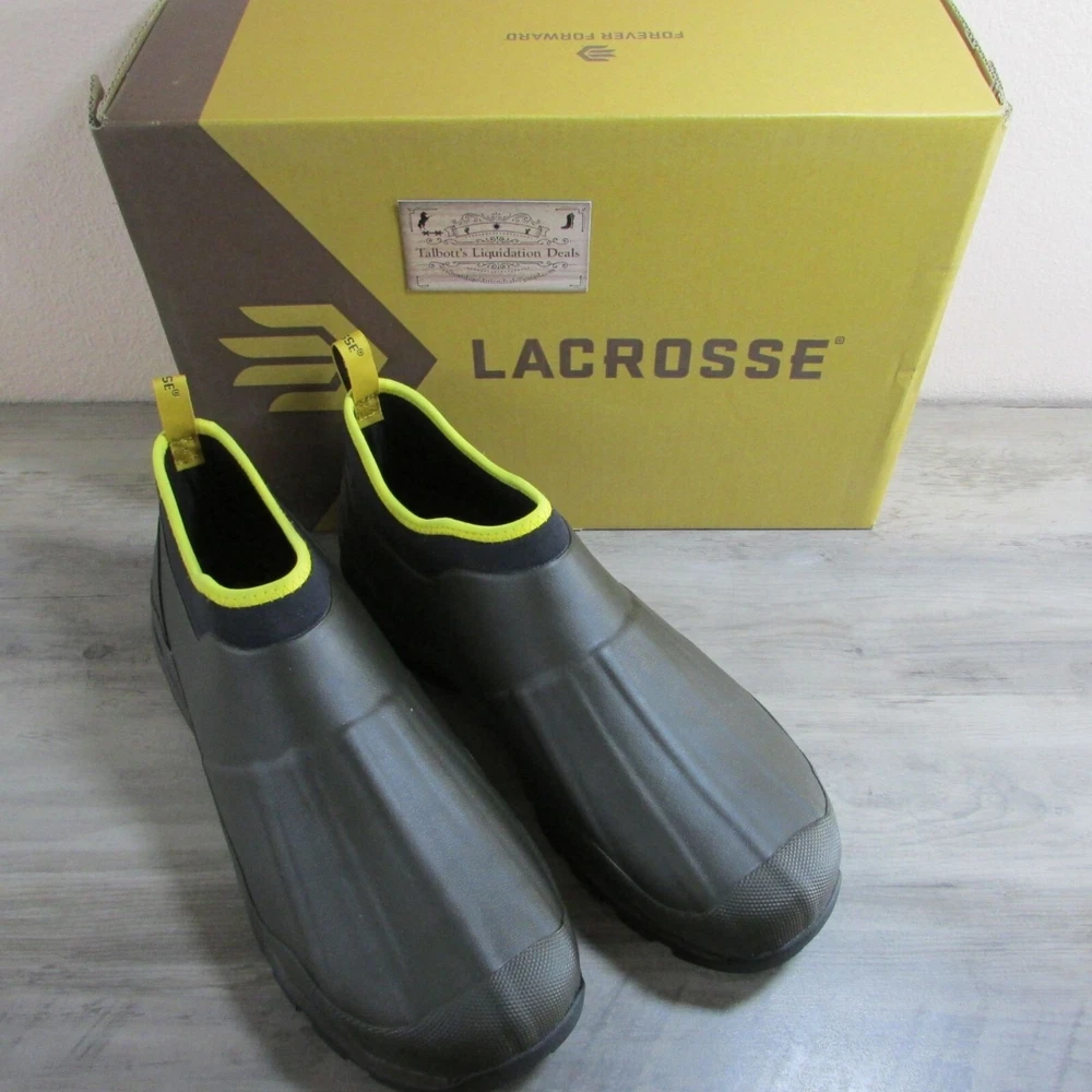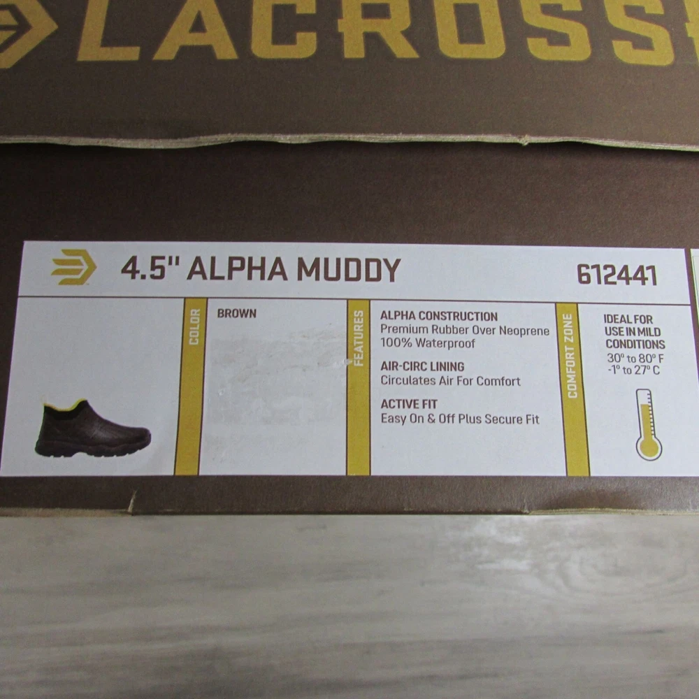 Brand new with tags and Box Men's Size Brand: LaCrosse Footwear Color: Brown Style # 612441 Alpha Muddy 4.5" Rain Garden Clog Boots **Box may have some cosmetic damage/Boots may have been tried on in store**