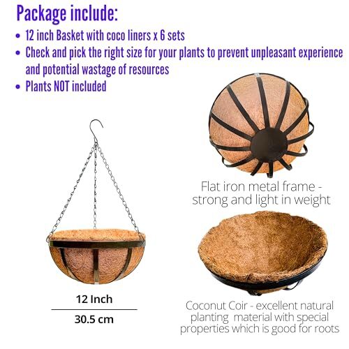 Return Policy Fast Delivery Trusted seller LaLaGreen Outdoor Hanging Baskets for Plants (6 Pack, 12 Inch) Medium Hanging Planter with Coco Liner, Flat Iron Metal Round Plant Flower Pots for Deck Patio Porch Garden Balcony Outside Decoration Product Description 6-PACK SET: 12 inch, medium size. Pick the right size for your plants to prevent unpleasant experience and potential wastage on resources. Flowers and Plants are NOT included. These 12 in hanging baskets for plants are ready to hang with coco liners, metal hanging chain and hook. STRONG AND LIGHTWEIGHT: This hanging planters for outdoor plants is coated with coco liner which prevents it from rusting and is suitable for indoor & outdoor. It is sturdy and is suitable to hold real live plants or artificial (fake or faux) plants for home decorations MATERIAL FROM COCONUT: This hanging basket is filled with coco coir liners, which is excellent planting material for plants as it holds a good deal of water, provides superior drainage and good air ventilation for the roots EASY TO USE: These hanging flower baskets are easy to use and ready to hang. Hooks are included. EXCELLENT DECORATIONS: Rustic and natural style, these hanging plant baskets can create a great indoor or outdoor decorations for a living room, kitchen, patio, garden, balcony, deck, porch, or farmhouse. It also can be used to create a modern and trendy minimalist theme home decoration or even for special venues like wedding Shipping Returns Payment Shipping Shipping is FREE to all addresses other than APO/PO boxes in the lower 48 states. All our stock ships from US-based warehouses. Shipped via USPS or UPS (depending on location and package weight) Unless stated otherwise, all orders will ship within 24-72 hours of your payment being processed. Check our feedback to see the great reviews of FAST shipping we offer. Returns Seller does not accept returns Payment We currently accept payment via eBay managed payments only. Once payment is cleared, we will dispatch your shipment within 1-3 business days. Please refer to the "Shipping" tab for more information regarding shipping speed to your destination.
