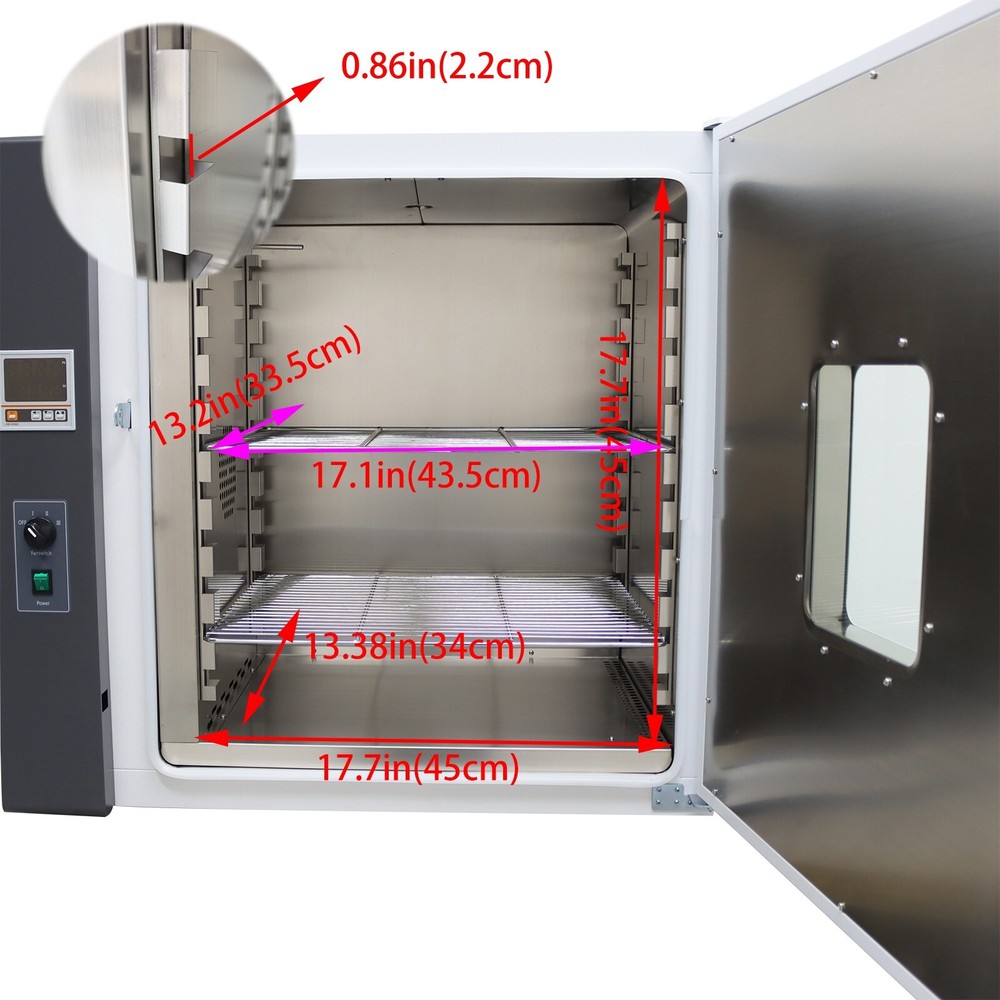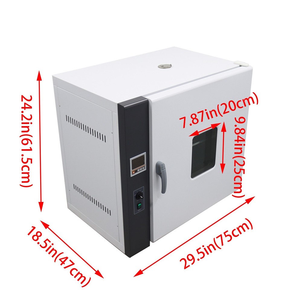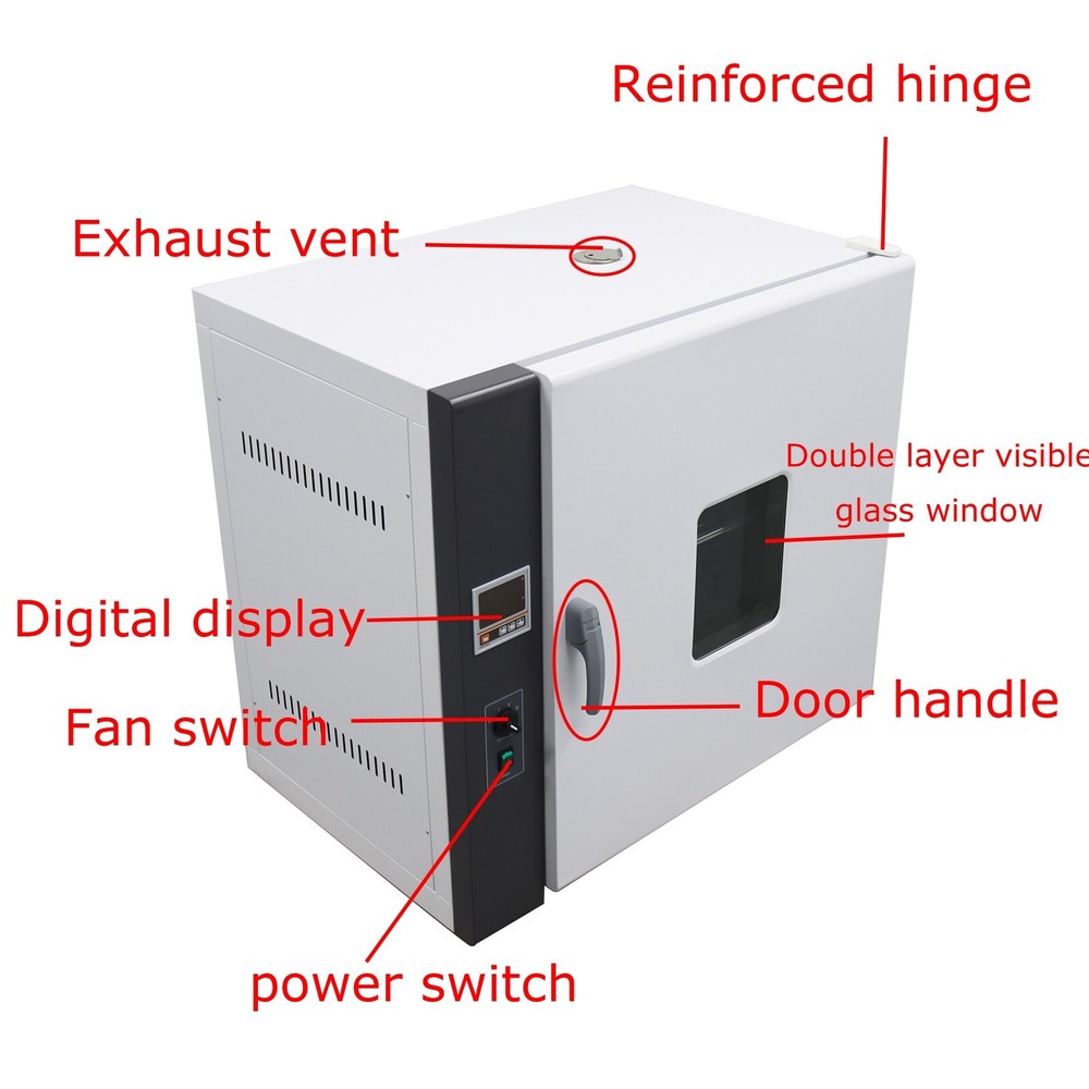 Digital Forced Air Convection Drying Oven Lab Dryer 17.7x13.3x17.7'' 110V 1500W This device is widely used in items drying ,baking and heat treatment in the laboratory of industrial and mining enterprises,colleges and universities, scientific research institutes, Medicine and health care. Product parameters: Model 101-1AB Voltage AC110V Tem.range RT+10-300℃(Idealized maximum: 300℃) Tem.fluctuation ±1℃ Working ambient tem. 5-40℃ Power 1.5KW Inner chamber size (D×W×H) 45*34*45cm/17.7*13.38*17.7nch Exterior size (D×W×H) 75*47*61.5cm/29.5*18.5*24.2inch Inner gallbladder volume: 70L Shelf size 17.1*13.2in(43.5*33.5cm) Product Features: Intelligent temperature control panel. This product is equipped with a fan, which customers can turn on or off according to their needs. Adjustable exhaust port The top is equipped with an adjustable exhaust hole, which can be expanded to remove residual materials such as aging tests. Storage rack slot Adjustable shelf slots allow customers to place partitions according to their needs. 1. The shell is made of high quality cold-rolled steel plate, surface electrostatic spraying. 2. Inner chamber is made of stainless steel or galvanized steel plate. 3. A is galvanized steel inner chamber, AB is stainless steel inner chamber. 4. Intelligent digital display PID temperature controller, with the functions of timing,overtemperature alarm instruction, temperature deviation correction, control temperature self-tuning. 5. Large double layer toughened glass window is convenient to observe the changes of contents in the box. 6. New type synthetic silicone seal, beautiful shape, can run high temperature for long period of time. 7. Hot air circulation system adopts the double air duct circulation of high temperature resistant and low noise fan, ensuring that the fan service life is longer and the temperature in the box is more uniform. 8. The device is equipped with an independent fan switch that can be turn on or off as needed. * Working environment :Temperature 5-40℃,Relative humidity <90%。 Two types of panels are randomly shipped, with only a slight difference in appearance. The buttons and functions are completely identical, and the marked 9000 and 6000 are only numerical differences. Item inclued: 101-1AB Digital Forced Air Convection Drying Oven *1 Item Number: 160316 Shipping & Handling Details Default Shipping Cost or Free Shipping Information: ▲ Default shipping cost or free shipping service is only for the lower 48 United States by UPS Ground or USPS. Other areas or needs other shipping ways, please contact us. ▲ Buyers from Guam, Puerto Rico, Virgin Islands, American Samoa, Alaska, Hawaii, PO Boxes, APO/FPO addresses or other countries/areas, there WILL be extra shipping costs, please contact us for more detailed information. ▲ Please make sure your address is valid for both UPS and USPS services. Any costs incurred because of incorrect or undeliverable address should be undertaken by buyer. HandlingTime: Shipping is usually made in 1-3 business days after payments cleared. Orders are processed from Monday-Friday; Not on the weekends & public holidays. Sales tax/Customs duties: Any sales taxes or Customs duties are not included. If came out, they must be undertaken by the buyer. Damage In Shipping: Email or call us First! We will work with you to get the case resolved in the fastest method. Return / Refund If you are not 100% happy with your purchase, please contact Us. Please don't directly opened a request or case without informing us, or else, we will do some discounts on the warranty and other sales-services later on. Hope for your understanding. Returns & Exchanges ▲ All returns must be made within 30 days of delivery date. Items must be in new, unused condition, with all original materials included with the shipment. A partial refund may be applied for opened or damaged items, depending on the condition. ▲ Items returned under the buyer’s remorse: The return shipping fee must be covered by the buyer; The original shipping cost will also be deducted from the refund. 15% restocking fee of the items purchase price will be charged. ▲ Returns that are the result of our seller's error: Buyer will receive a full refund of the item as well as shipping charges ▲ All returns require a RA (Return Authorization) number that will be given by our seller. Please contact with us at first for more details. Defective & Damaged Products ▲ If product was received damaged or not as described, please send us some pictures or videos, so we could well understand your problem, then solve them for you ASAP. Besides, it's much helpful for us to claim with UPS, remind our related department to pay much more attention to packaging later on. Hope for your understanding. ▲ Replacement or refund of defective or damaged products can only be returned in exchange for the exact same product, or else, the purchase price will be refunded back to your original payment method. ▲ If an item is received damaged, customer service must be contacted within 7 days of receiving your item. All returns require a RA (Return Authorization) number as above. Warranty & Feedback ▲ 6 months' warranty for the machines, not for the consumables. We stand behind our products all the item, so even if your warranty period has expired, you can still seek for service or technical support from us with low cost. ▲ Any warranty shipping cost to us is responsible by buyer. ▲ Any shipping cost to buyer is responsible by the seller. ▲ We committee to the customer satisfaction and want to bring you the best purchase experience. If there is any problems, please contact u s ASAP. If not, please leave us a positive feedback as it's very important for us. Thanks very much. On Jun 25, 2024 at 02:07:48 PDT, seller added the following information: On Dec 20, 2024 at 02:06:54 PST, seller added the following information: