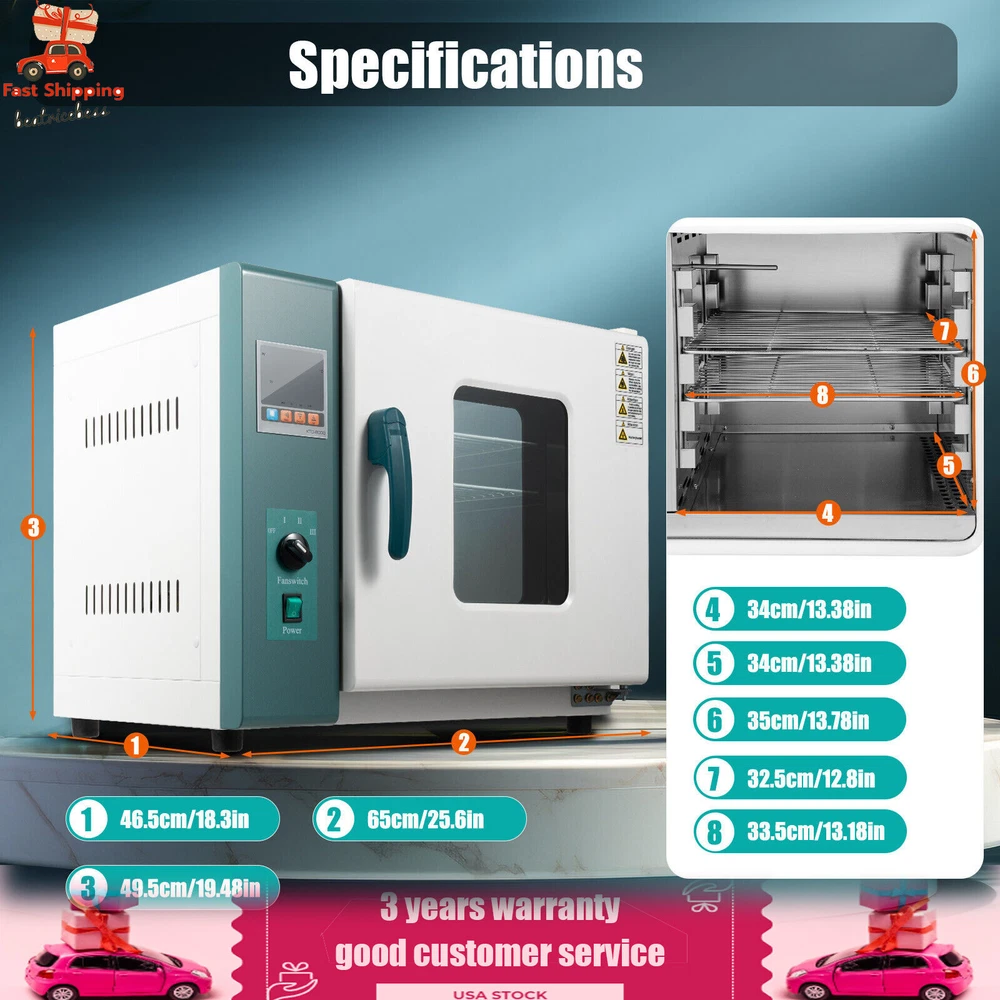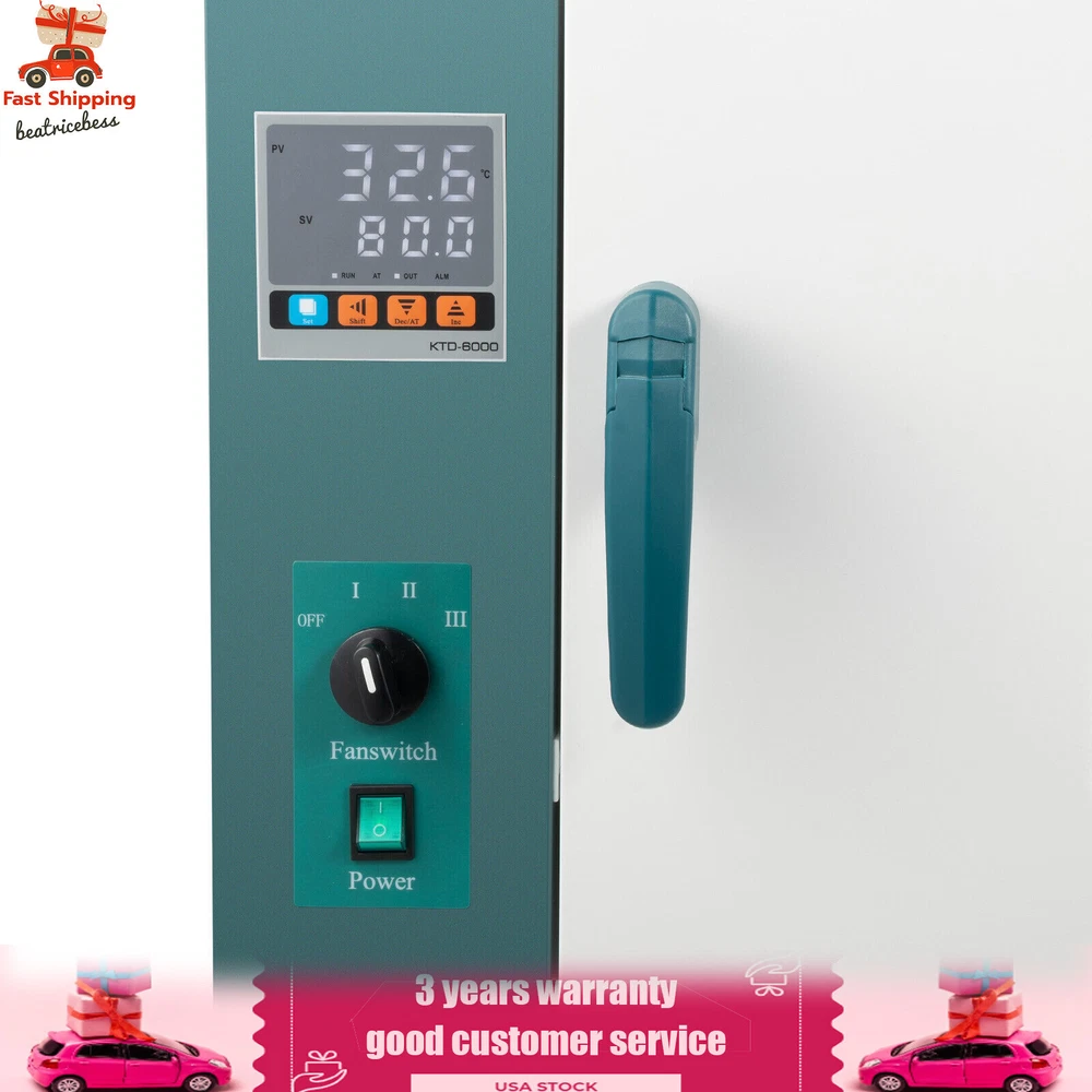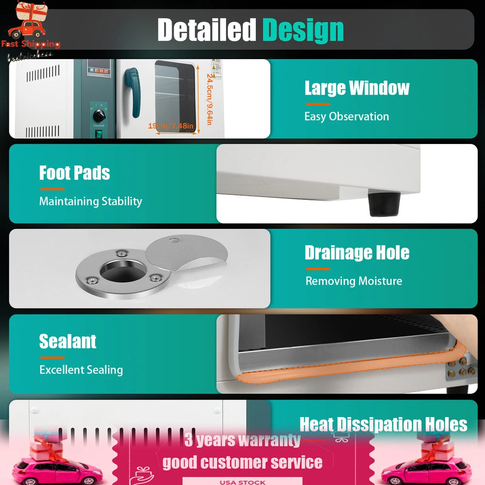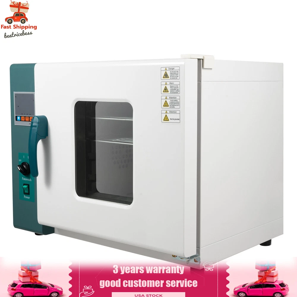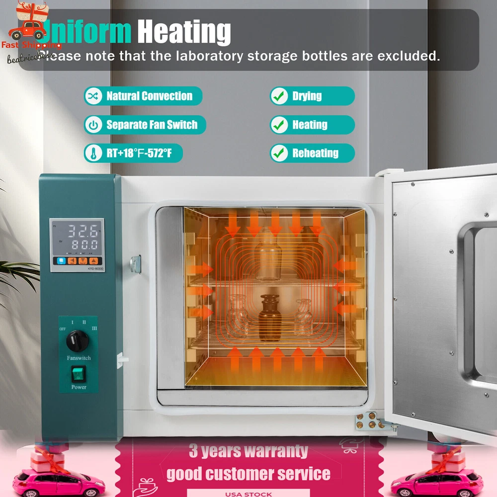Specifications Model: 101-0AB Material: Cold Plate, Stainless Steel Color: White, Green Style: Modern Surface Treatment: Spraying Assembly Required: No Door Style: Side-open Door Control Type: Button Control Power: 1000W Voltage: 110V Capacity: 45L/12Gal Temperature Range: RT+10°C~300°C/RT+18°F~572°F Tray Maximum Loading: 15kg/33lbs Tem. Resolution: 0.1°C/0.18°F Tem. Fluctuation: ±1°C/±1.8°F Gross Weight: 36.35kg/80lbs Net Weight: 32.25kg/71lbs Tray Spacing: 6cm/2.36in Tray Size: 32.5*33.5cm/12.8*13.18in Window Size: 19*24.5cm/7.48*9.64in Product Inner Size: 34*34*35cm/13.38*13.38*13.78in Product Size: 46.5*65*49.5cm/18.3*25.6*19.48in Package Size: 58*60*73.5cm/22.83*23.62*28.93in welcome to beatricebess Description Description Precision experiments have higher requirements for materials and instruments, especially in temperature control. When you need to deal with a cluttered and large amount of materials and instruments that need to be dried but are at a loss, it means you need our horizontal electric blast drying oven! The drying oven designed specifically for laboratory situations can provide you with precise temperature, uniform drying, and sufficient capacity. With it behind your back to help you run errands, you can finally devote more energy to scientific experiments! Key Features Laboratory Helper: With its help, you can efficiently dry various experimental materials or equipment to their ideal state, providing unparalleled convenience for your work. Uniform Heating: It can set the temperature to a maximum of 572°F (minimum 18°F higher than room temperature), adapting to various needs such as drying, heating, reheating, etc. The air circulation promoted by natural convection, combined with a separate fan switch, makes the material dry faster and more evenly. Easy to Operate: You only need to press the button below the display screen to set the temperature and time, which is more convenient and fast, eliminating the short board of touch screen method that cannot get water on your hands. Large Capacity: This 12Gal double-tier drying oven, combined with 2 adjustable trays that can bear a weight of 33 lbs each, allows you to dry more materials or items at once, making a large number of high-performance materials for the laboratory, thereby saving time and improving efficiency. Intelligent Temperature Controller: The digital display PID temperature controller has functions such as timing, over-temperature alarm indication, temperature deviation correction, and temperature self-tuning control. Good Material: The shell is processed and formed with high-quality cold plates treated with spraying technology. The stainless steel inner liner can withstand high temperatures well, ensuring stable and long-term operation. Low Noise: The hot air circulation system adopts a low-noise self-cooling fan, which will not produce more noise during the drying process, avoiding interference with your work or rest. Extensive External Connection: You can also install additional functions such as LCD instrument panel, programmable instrument panel, printer, 485 interface, USB storage, SMS alarm, etc. according to your actual needs (all excluded). Details Observation Window: A large double-tier tempered glass observation window makes it easy to observe changes in the items inside the box. Anti-slip Feet: The anti-slip feet can effectively maintain the stability of the machine and prevent the desktop from being scratched. Drainage Hole: The top drainage hole can quickly remove internal moisture and maintain a good drying effect. Sealant: A new type of synthetic silicone sealant with a beautiful appearance, and excellent sealing performance can operate at high temperatures for long periods. Heat Dissipation Holes: Double-row heat dissipation holes can quickly exhaust the hot air during operation, ensuring long-term stable operation. Application This device is suitable for industrial and mining enterprises, schools, research institutes, pharmaceutical and health industries, laboratories, and other units to carry out drying, baking, wax melting, heat treatment, and other work through a hot air circulation system. Specifications Model: 101-0AB Material: Cold Plate, Stainless Steel Color: White, Green Style: Modern Surface Treatment: Spraying Assembly Required: No Door Style: Side-open Door Control Type: Button Control Power: 1000W Voltage: 110V Capacity: 45L/12Gal Temperature Range: RT+10°C~300°C/RT+18°F~572°F Tray Maximum Loading: 15kg/33lbs Tem. Resolution: 0.1°C/0.18°F Tem. Fluctuation: ±1°C/±1.8°F Gross Weight: 36.35kg/80lbs Net Weight: 32.25kg/71lbs Tray Spacing: 6cm/2.36in Tray Size: 32.5*33.5cm/12.8*13.18in Window Size: 19*24.5cm/7.48*9.64in Product Inner Size: 34*34*35cm/13.38*13.38*13.78in Product Size: 46.5*65*49.5cm/18.3*25.6*19.48in Package Size: 58*60*73.5cm/22.83*23.62*28.93in Package Included 1*Horizontal Electric Blast Drying Oven 1*English Manual All Accessories for Assembly Notes 1. Please carefully read the manual and strictly follow the precautions to have a better experience. 2. Please allow the slight color difference caused by the shooting light and 1-3cm error due to manual measurement, and make sure you do not mind before you order. Note: The door is not completely tight to the cabinet because of the thick sealing strip. Generally, the door is parallel to the cabinet with a significant gap between them, which is normal. Payment Delivery details Terms of sales About us Contact us Payment We accept ebay payment 。 Fees such as import duties, taxes are not included in the item price or shipping costs. These charges are the buyer's responsibility. Delivery details Shipping: 2-9 working days to: USA Terms of sales We maintain high standards of excellence and strive for hundred percent customer satisfaction. Feedback is very important to us. We hope that you contact us immediately before you give neutral or negative feedback, so that we can address your concerns. It is i