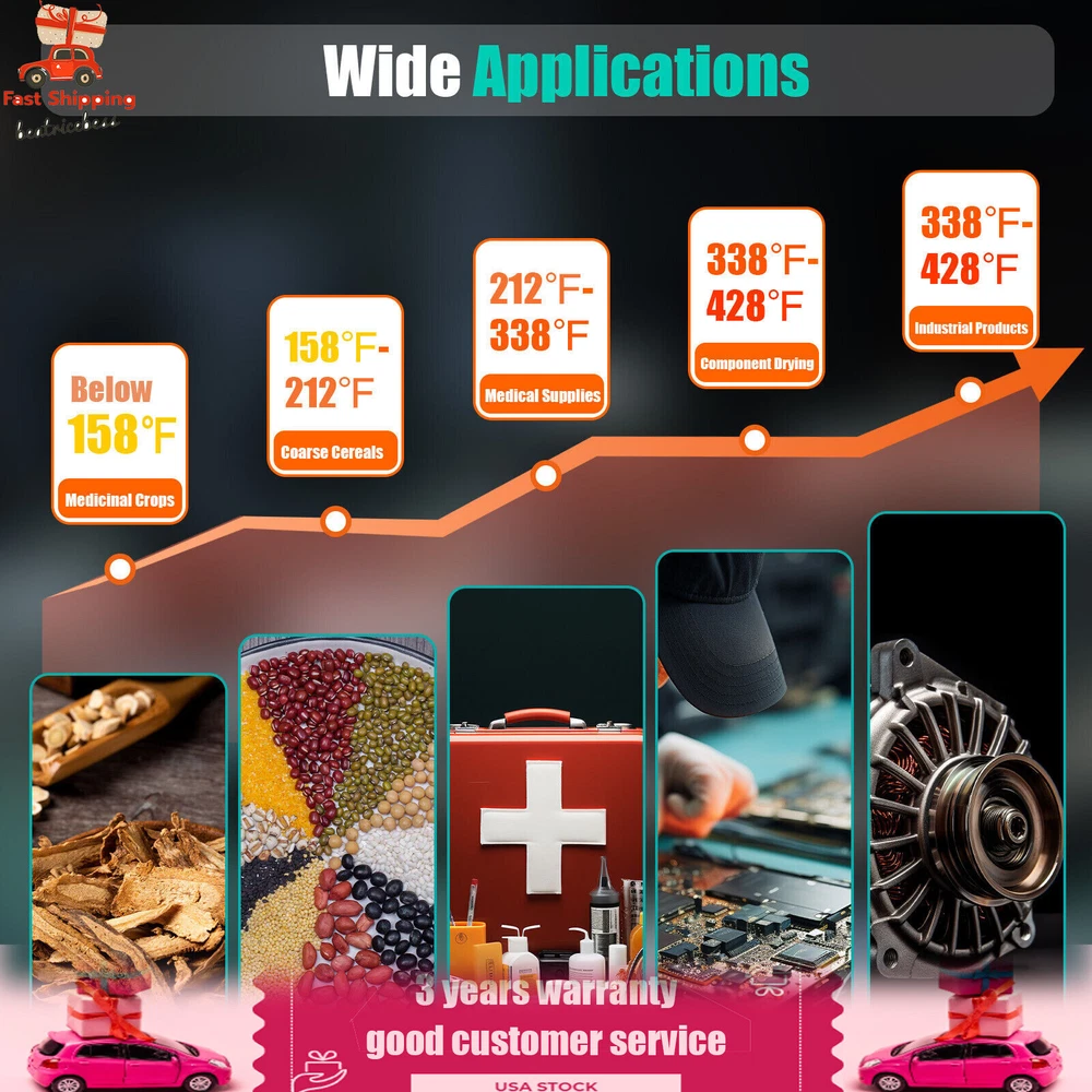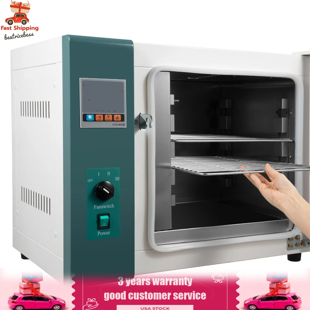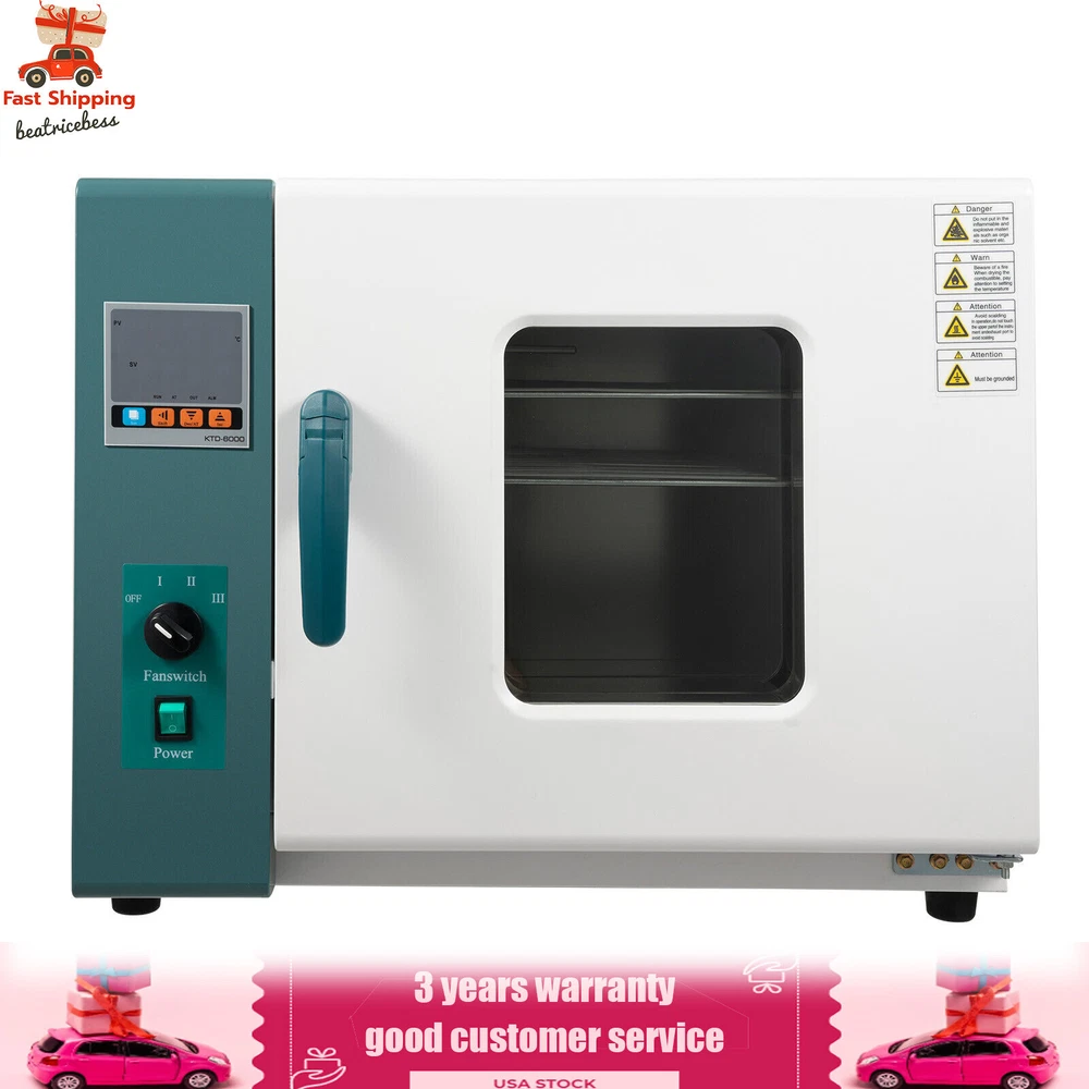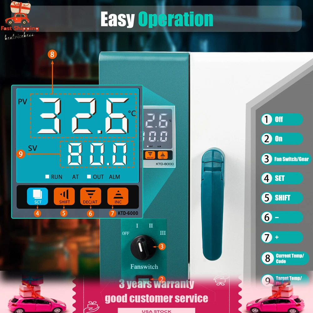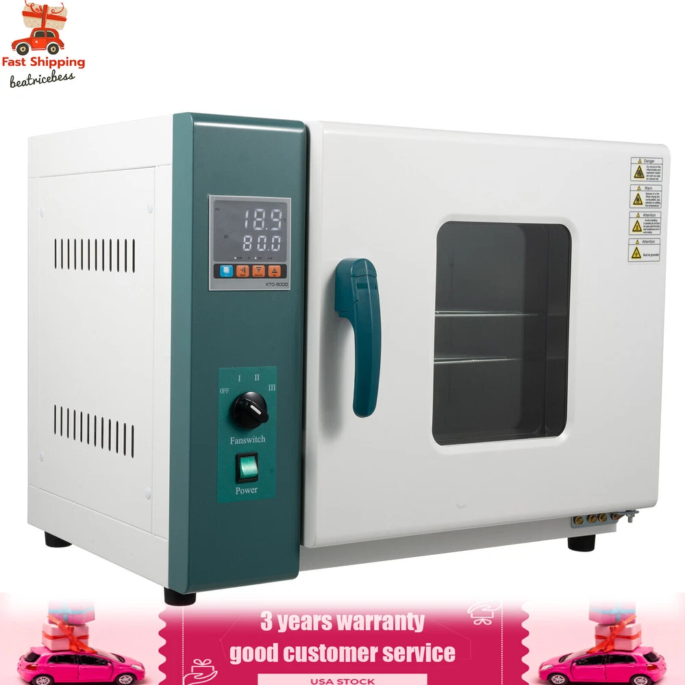Specifications Model: 101-0AB Material: Cold Plate, Stainless Steel Color: White, Green Style: Modern Surface Treatment: Spraying Assembly Required: No Door Style: Side-open Door Control Type: Button Control Power: 1000W Voltage: 110V Capacity: 45L/12Gal Temperature Range: RT+10°C~300°C/RT+18°F~572°F Tray Maximum Loading: 15kg/33lbs Tem. Resolution: 0.1°C/0.18°F Tem. Fluctuation: ±1°C/±1.8°F Gross Weight: 36.35kg/80lbs Net Weight: 32.25kg/71lbs Tray Spacing: 6cm/2.36in Tray Size: 32.5*33.5cm/12.8*13.18in Window Size: 19*24.5cm/7.48*9.64in Product Inner Size: 34*34*35cm/13.38*13.38*13.78in Product Size: 46.5*65*49.5cm/18.3*25.6*19.48in Package Size: 58*60*73.5cm/22.83*23.62*28.93in welcome to beatricebess Description Description Precision experiments have higher requirements for materials and instruments, especially in temperature control. When you need to deal with a cluttered and large amount of materials and instruments that need to be dried but are at a loss, it means you need our horizontal electric blast drying oven! The drying oven designed specifically for laboratory situations can provide you with precise temperature, uniform drying, and sufficient capacity. With it behind your back to help you run errands, you can finally devote more energy to scientific experiments! Key Features Laboratory Helper: With its help, you can efficiently dry various experimental materials or equipment to their ideal state, providing unparalleled convenience for your work. Uniform Heating: It can set the temperature to a maximum of 572°F (minimum 18°F higher than room temperature), adapting to various needs such as drying, heating, reheating, etc. The air circulation promoted by natural convection, combined with a separate fan switch, makes the material dry faster and more evenly. Easy to Operate: You only need to press the button below the display screen to set the temperature and time, which is more convenient and fast, eliminating the short board of touch screen method that cannot get water on your hands. Large Capacity: This 12Gal double-tier drying oven, combined with 2 adjustable trays that can bear a weight of 33 lbs each, allows you to dry more materials or items at once, making a large number of high-performance materials for the laboratory, thereby saving time and improving efficiency. Intelligent Temperature Controller: The digital display PID temperature controller has functions such as timing, over-temperature alarm indication, temperature deviation correction, and temperature self-tuning control. Good Material: The shell is processed and formed with high-quality cold plates treated with spraying technology. The stainless steel inner liner can withstand high temperatures well, ensuring stable and long-term operation. Low Noise: The hot air circulation system adopts a low-noise self-cooling fan, which will not produce more noise during the drying process, avoiding interference with your work or rest. Extensive External Connection: You can also install additional functions such as LCD instrument panel, programmable instrument panel, printer, 485 interface, USB storage, SMS alarm, etc. according to your actual needs (all excluded). Details Observation Window: A large double-tier tempered glass observation window makes it easy to observe changes in the items inside the box. Anti-slip Feet: The anti-slip feet can effectively maintain the stability of the machine and prevent the desktop from being scratched. Drainage Hole: The top drainage hole can quickly remove internal moisture and maintain a good drying effect. Sealant: A new type of synthetic silicone sealant with a beautiful appearance, and excellent sealing performance can operate at high temperatures for long periods. Heat Dissipation Holes: Double-row heat dissipation holes can quickly exhaust the hot air during operation, ensuring long-term stable operation. Application This device is suitable for industrial and mining enterprises, schools, research institutes, pharmaceutical and health industries, laboratories, and other units to carry out drying, baking, wax melting, heat treatment, and other work through a hot air circulation system. Specifications Model: 101-0AB Material: Cold Plate, Stainless Steel Color: White, Green Style: Modern Surface Treatment: Spraying Assembly Required: No Door Style: Side-open Door Control Type: Button Control Power: 1000W Voltage: 110V Capacity: 45L/12Gal Temperature Range: RT+10°C~300°C/RT+18°F~572°F Tray Maximum Loading: 15kg/33lbs Tem. Resolution: 0.1°C/0.18°F Tem. Fluctuation: ±1°C/±1.8°F Gross Weight: 36.35kg/80lbs Net Weight: 32.25kg/71lbs Tray Spacing: 6cm/2.36in Tray Size: 32.5*33.5cm/12.8*13.18in Window Size: 19*24.5cm/7.48*9.64in Product Inner Size: 34*34*35cm/13.38*13.38*13.78in Product Size: 46.5*65*49.5cm/18.3*25.6*19.48in Package Size: 58*60*73.5cm/22.83*23.62*28.93in Package Included 1*Horizontal Electric Blast Drying Oven 1*English Manual All Accessories for Assembly Notes 1. Please carefully read the manual and strictly follow the precautions to have a better experience. 2. Please allow the slight color difference caused by the shooting light and 1-3cm error due to manual measurement, and make sure you do not mind before you order. Note: The door is not completely tight to the cabinet because of the thick sealing strip. Generally, the door is parallel to the cabinet with a significant gap between them, which is normal. Payment Delivery details Terms of sales About us Contact us Payment We accept ebay payment 。 Fees such as import duties, taxes are not included in the item price or shipping costs. These charges are the buyer's responsibility. Delivery details Shipping: 2-9 working days to: USA Terms of sales We maintain high standards of excellence and strive for hundred percent customer satisfaction. Feedback is very important to us. We hope that you contact us immediately before you give neutral or negative feedback, so that we can address your concerns. It is i