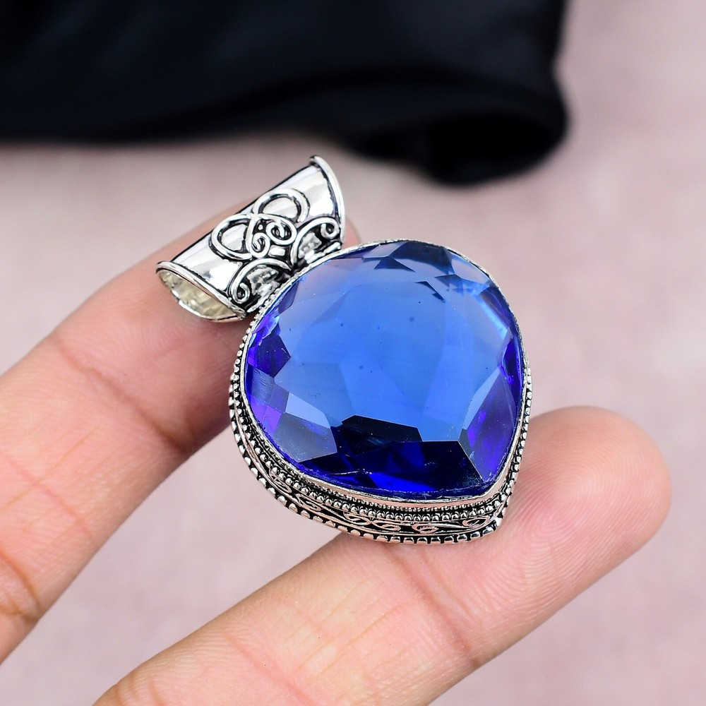 Lab-Created Blue Sapphire Sterling Silver Pendant Handmade Jewelry
