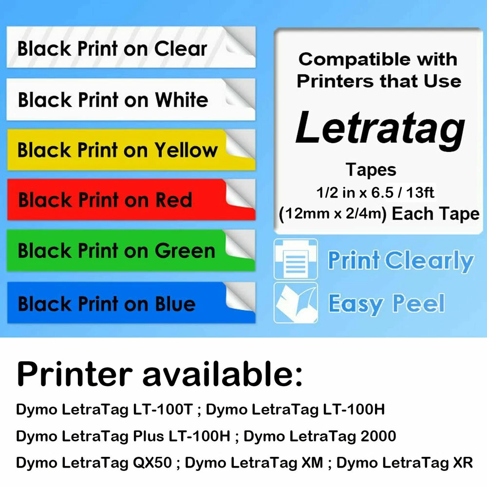 Material Length Colour 12mm Compatible with USA/CA DE UK CZ Paper 4m Black on White A91330 A91220 A91200 A59421 Dymo LetraTag LT-100T Dymo LetraTag LT-100H Dymo LetraTag Plus LT-100H Dymo LetraTag 2000 Dymo LetraTag QX50 Dymo LetraTag XM Dymo LetraTag XR Plastic Black on Clear A16952 A16951 A12267 A12268 Black on White A91331 A91221 A91201 A59422 Black on Yellow A91332 A91222 A91202 A59423 Black on Red A91333 A91223 A91203 A59424 Black on Green A91334 A91224 A91204 A59425 Black on Blue A91335 A91225 A91205 A59426 Fabric Iron-on 2m Black on White A18771 A18768 A18769 A18770 Tips Before installing the tape cassettes, please rotate the axle according to the arrow , to make sure the front-end PET film in tension, to avoid the fracture of loose PET film. How to confirm whether the tape fit for your printer or not 1. Check suitable tape width on printer. 2. Check printer in our listing's description. 3. Contact us before make order. Contact us Please contact us for any question or concern so that we can satisfactorily address your concerns. -Please email us first in the following situations: 1.The item can't work properly. 2.The item broken on the post. 3.You bought or received the wrong items. 4.You have not received your shipment within the period. 5.Before you give us Negative feedback. 6.Before you open a case/return on eBay. All questions will be replied within 24 hours (Except Saturday and Sunday). Compatible with Brother P-Touch TZ TZe Label Tape Laminated Ribbon Cartridge Cassette Return Policy If bought wrong items, buyer is responsible for the return shipping fee and 20% charges on order price to cover our lost on the previous shipping and management. We will provide shipping label for return in the following situations: 1. Wrong items sent. 2. Product quality issues. 3. The product can't be recognized. (Except for non-recognition caused by the buyer buying the wrong size) Delivery Details It will take about 2-7 business days(Except weekend or public holidays)shipped from California via USPS / FedEX for delivery. On Apr 11, 2024 at 04:17:01 PDT, seller added the following information: