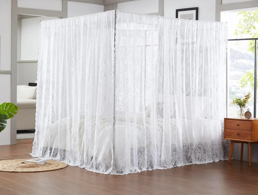 ✅ EXCLUSIVE LACE CANOPY BED CURTAINS - Warm Home Designs Exclusive Lace Bed Canopy Curtains are Perfect Addition to Your Bedroom. Our English Rose Adorned White Canopy Bed Curtains Come in 8 Piece Lace Curtain Set. Each Curtain Measures 48 Inches Wide by 72 Inches (6 Feet) Long and Come with Matching Tie-Backs. Linen Bed Canopy Curtains and Black Bed Canopy Curtains Are Available as Well. ✅ KEEP THEM CLOSED, OPEN OR TIED - Our Bed Canopies & Drapes Look Great No Matter How You Planning to Use Them. Want To Keep Your Canopy for Bed Closed For Privacy or To Stop Mosquitoes? You Can Do That. Want to Open Bed Tent Up for Sunshine or Tie Lace Curtains to The Bed Posts? They Look Great That Way As Well. Browse All Our Photos or Videos for an Inspiration that Fit Your Bedroom Style, Not Someone Else's. ✅ PERFECT FOR QUEEN OR KING CANOPY BED - We Offer Curtains for Full Canopy Bed, Bed Canopy Queen Size or King Size Canopy Bed Frame. Our Canopy Drapes are Even Big Enough To Fit California King Canopy. Looking for Kids Canopy, Canopy for Girls Room or Twin Canopy Bed Curtains? Just Remove Couple of Lace Canopy Curtains and You Have a Perfect Bed Canopy Twin Curtains. ✅ MATCHES VARITEY OF DECORS - Our Luxury Bed Curtain Is Perfect Addition to Coquette Room Decor, Girls Bedroom Decor, Victorian Decor, Room Decor For Women, Vintage Decor or Farmhouse Decor. Our Black Bed Canopy is Also Perfect for Gothic Decor, Goth Decor or Emo Decor and Matches Great with Gothic Bedding. Bed Curtains from Ceiling Can Bed Also Used As Mosquito Net for Bed, Bed Canopy for Girls, Bed Tent for Kids, Girls Canopy, or Princess Bed Canopy. ✅ EASY TO CLEAN AND MAINTAIN - Most Queen Canopy Bed Curtains or King Canopy Bed Curtains Are Either Too Delicate Or Too Cheaply Made To Machine Wash. We Made Ours with 100% Premium Polyester, So Our Quality Cortina con Dosel de Cama Are Durable Enough To Withstand Many Machine Washes On Cold Cycle And Tumble Drying on Low. They Can Even Be Ironed with Cool Iron. Product Description Luxurious Lace Canopy Bed Curtains Set: Create and Enchanting Atmosphere in Your Bedroom with WARM HOME DESIGNS Luxury Lace Bed Canopy Curtains. Our Canopy Bed Curtains Set Includes Eight Elegant Lace Curtain Panels with Matching Tie-Backs Designed to Transform Your Sleeping Space into a Luxurious Escape. Available in Black, Linen, and White Colors, Our Canopy Curtains Cater to a Variety of Decor Styles, from Gothic Decor to Coquette Room Decor, to Victorian Decor Making Them a Delightful Addition to Girls' Bedroom, Vintage Bedroom or Gothic Bedroom. Whether You Queen Canopy Curtains or Kind Canopy Curtains Our Lace Drapes are Perfect for Any Bed Frame. Subtracting Couple of Lace Panes Can Turn Them Into Twin Canopy Bed Curtains So They Match Any Bed Size. 8 Panel Lace Canopy Set in 3 Colors: Black Canopy Bed Curtains 8 Panels Included in Each Set Each Panel is 48" x 78" Inches in Size Include 8 Lace Tie-Backs Can Be Used for Twin, Full, Queen or King Size Bed. Great for Farmhouse, Traditional, Vintage or Gothic Decor Linen Canopy Bed Curtains 8 Panels Included in Each Set Each Panel is 48" x 78" Inches in Size Include 8 Lace Tie-Backs Can Be Used for Twin, Full, Queen or King Size Bed. Great for Farmhouse, Traditional, Vintage or Gothic Decor White Canopy Bed Curtains 8 Panels Included in Each Set Each Panel is 48" x 78" Inches in Size Include 8 Lace Tie-Backs Can Be Used for Twin, Full, Queen or King Size Bed. Great for Farmhouse, Traditional, Vintage or Gothic Decor WARM HOME DESIGNS English Rose Curtains, Patio Door Curtains, Bed Canopy Curtains, Tablecloths, French Door Curtains and Shower Curtains Find Matching Home Decor Items for the Whole Home: