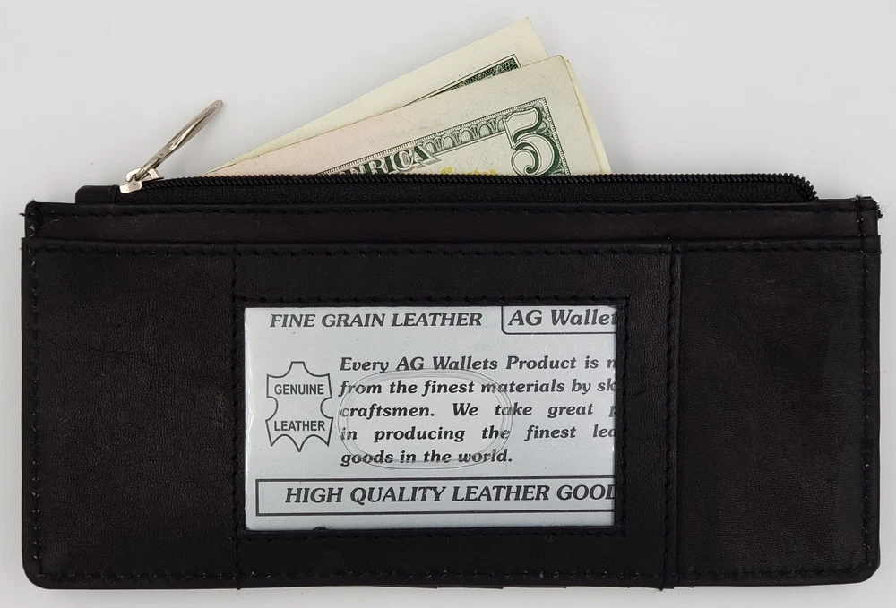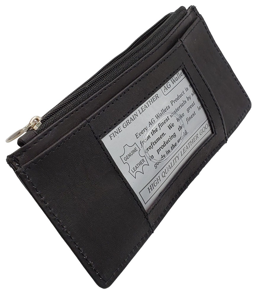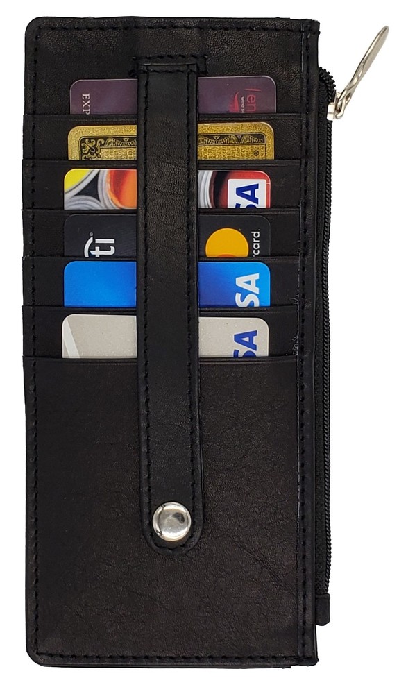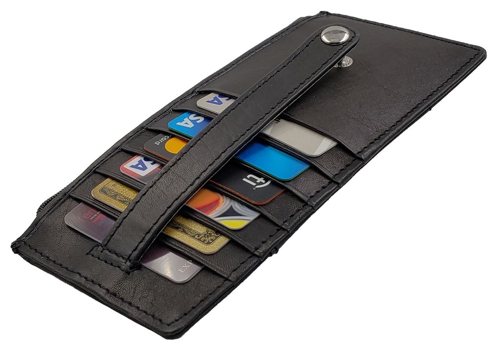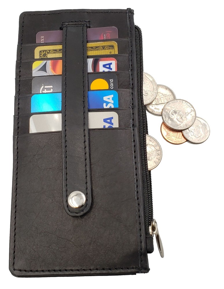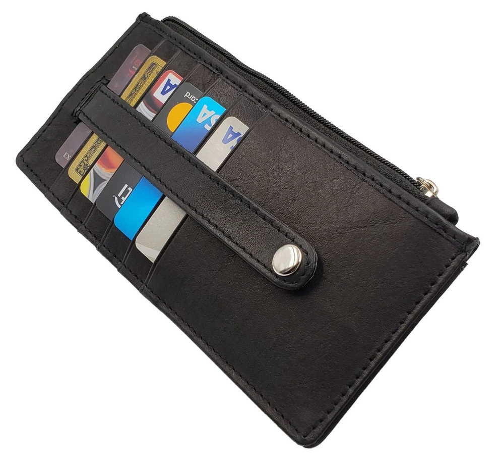Genuine Leather Slim Front Pocket 6 Credit Card Slot with Secure Side Strap Snap with ID Wallet Genuine Cowhide Leather Dimensions (LxW) : 6.75 in x 3 in Six Credit Card Slots And One ID Window Safety Leather Strap With Snap Closure Side Zippered Compartment