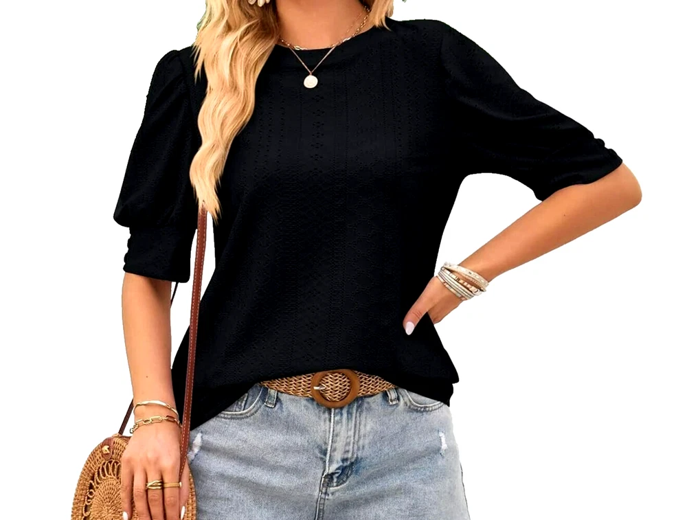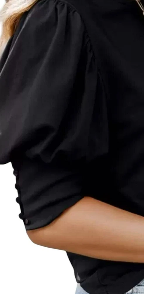 Women's top Black Stretch knit 72% Polyester, 25% Cotton, 3% Spandex Puff Sleeves Elastic button-accent cuffs Follow The Style Outpost for more deals! Big Deal: Buy 2 or more items for EXTRA savings! FREE 60 day returns! 10% restocking fee applies.