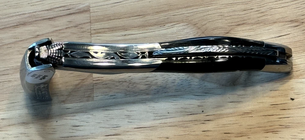 Laguiole en Aubrac Corkscrew. Buffalo Horn handles. Guilloche Deluxe Model. Hand Carved Bee. Made in France. New with Box & Certificate.