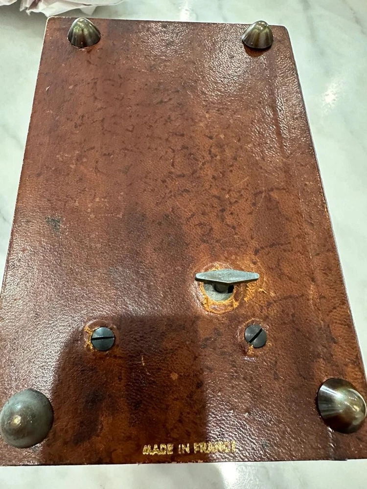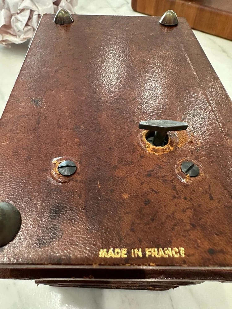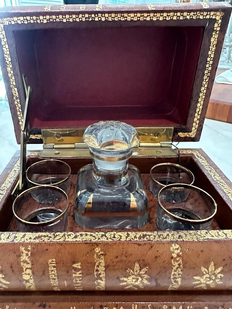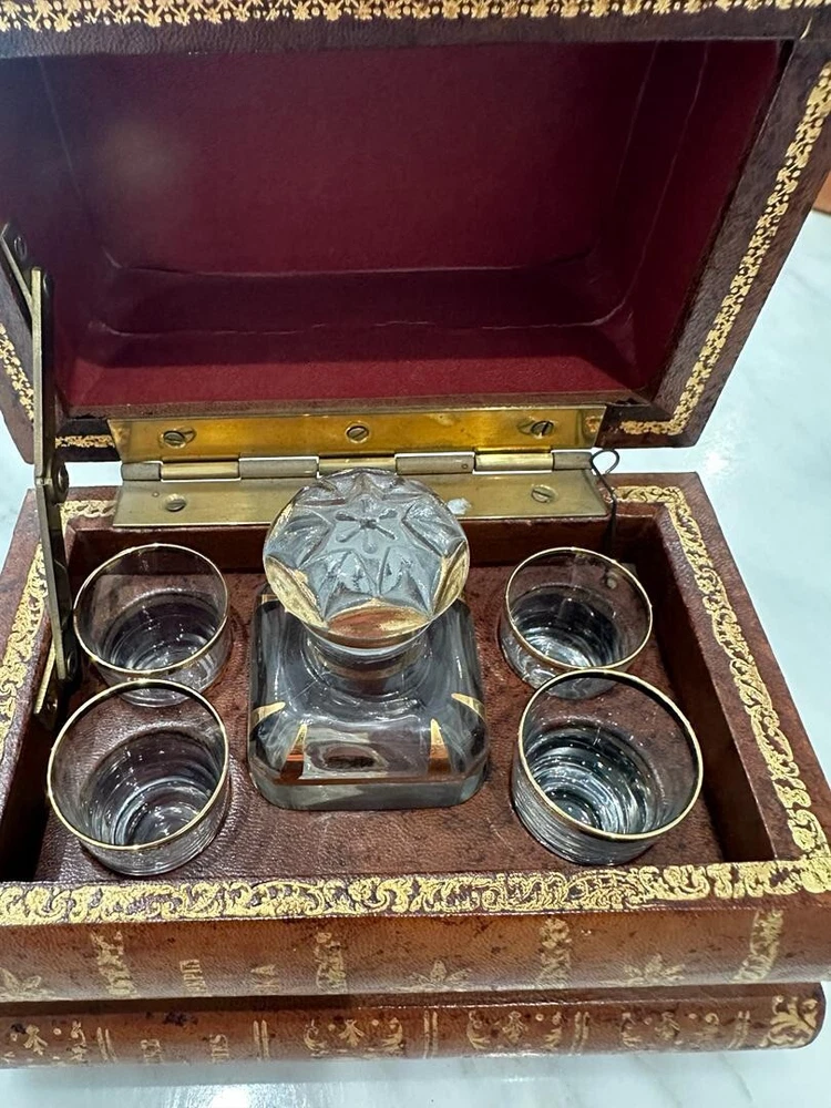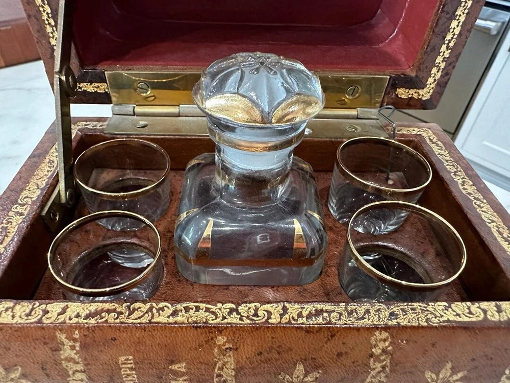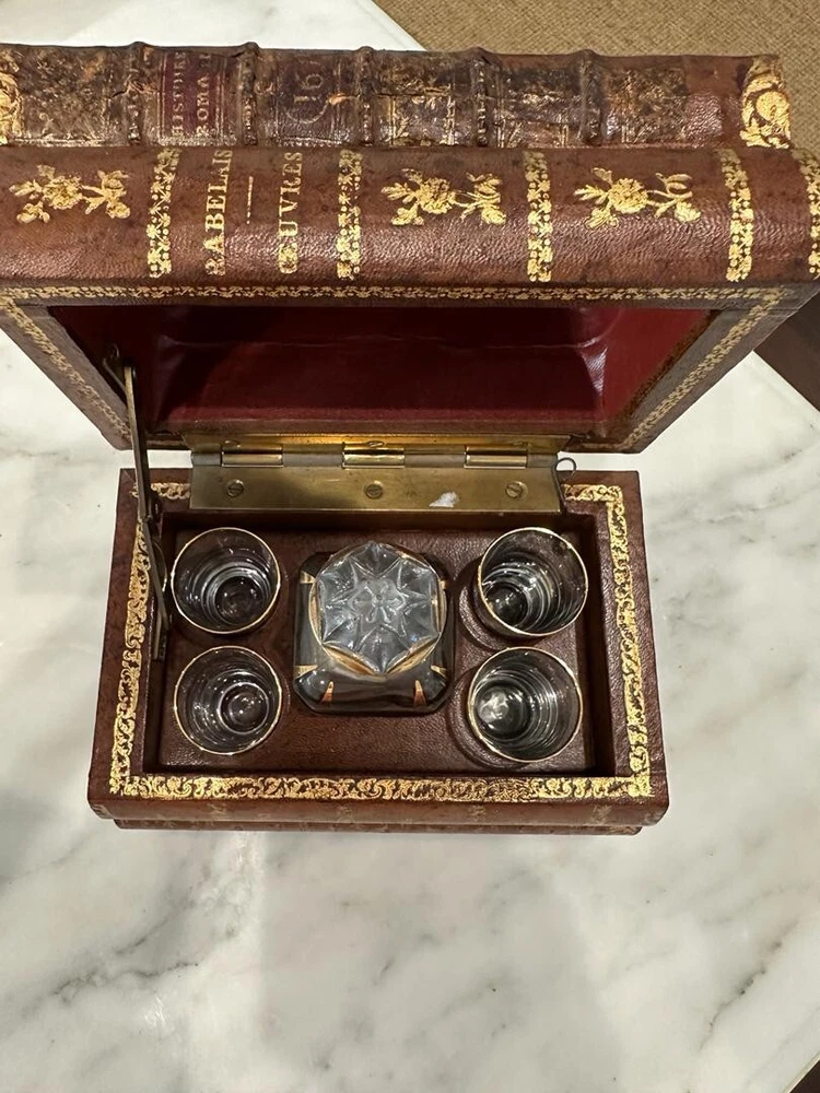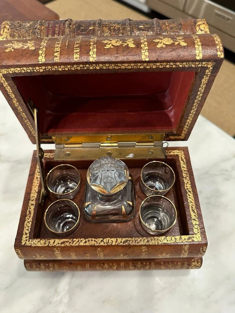 This is an incredible French music box with a Swiss musical movement. Its from the late 1800’s and is in gray condition for its age. It is also in working condition and has a beautiful melody. I bought this in L’isle sur la sorgue in France. This musical box looks on the outside like a set of leather French books. Once you open the box the music plays and inside of the box you have a small bottle for cognac decanter and some glasses. Measurements Box 6 3/4 inches wide x 4 inches deep x 5 1/2 tall Liquor bottle 1 3/4 wide 4 glasses 2 inch tall x 1 1/4 wide NO returns please ask all questions before bidding. Thank you!