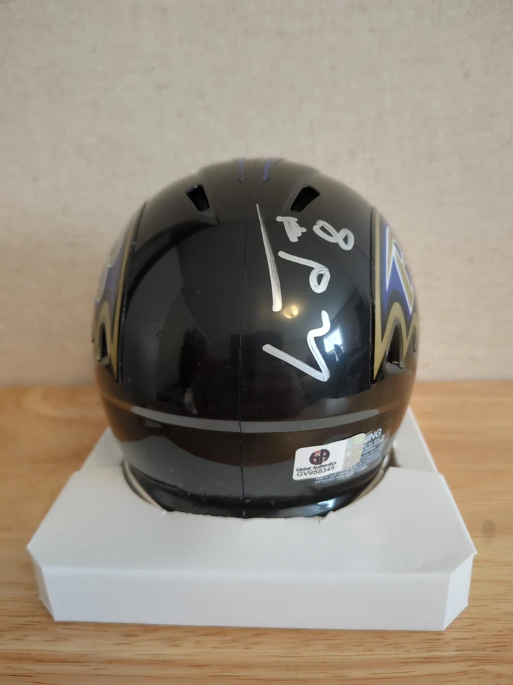 This is a Baltimore Ravens mini helmet signed by Lamar Jackson. It comes with a Certificate of Authenticity from Global Authentics.