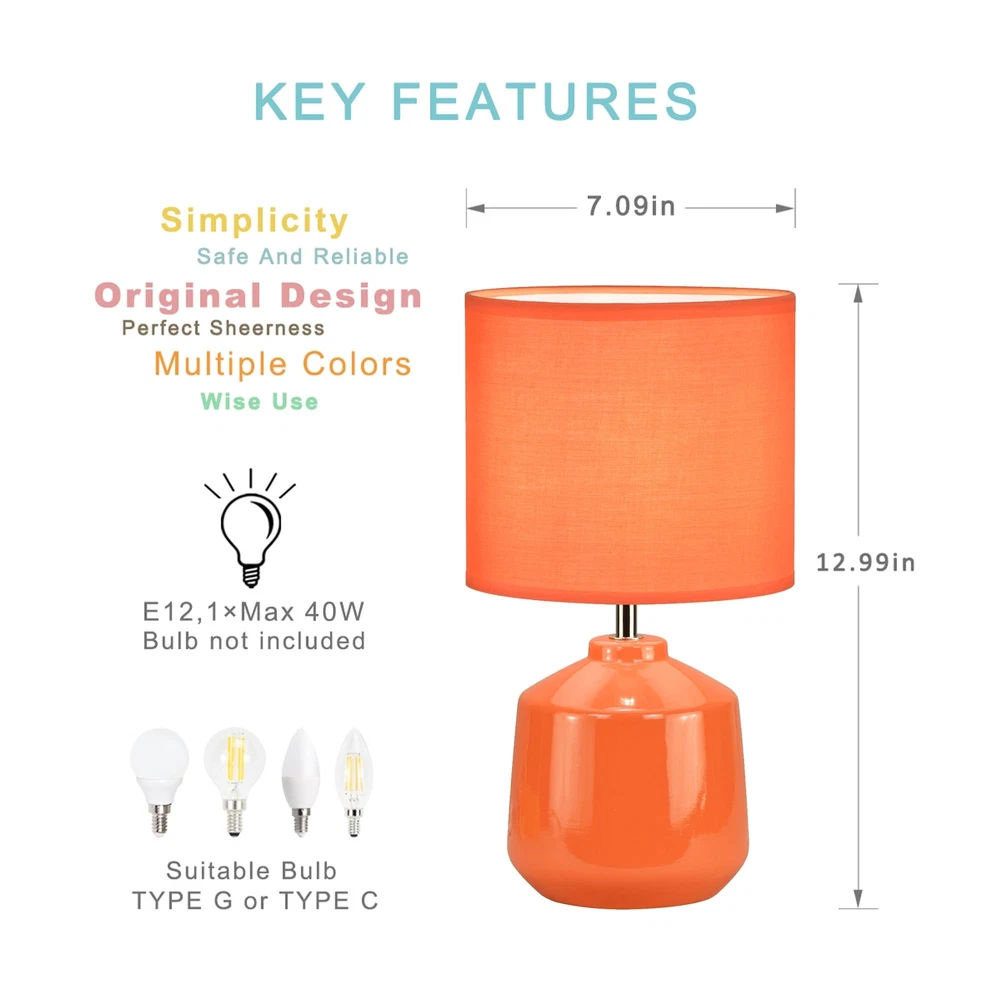 SMALL TABLE LAMP:Φ7.09×H12.99IN.This small table lamp is with handmade ceramic base and fabric lampshade. ORIGINAL DESIGN:This ceramic table lamp is designed by our professional designers.With it's simplicity,shiny finish and popular color,it is perfect as a small table lamp for living room and a bedside table lamp for bedroom.This modern table lamp is also nice as a kids table lamp and a night table lamp. SAFE AND GOOD QUALITY:This small table lamp is with ETL certificate approved by INTERTEK lab.It is very safe for our customers to use this small table lamp in terms of both safety regulations and materials.With continuous strict quality supervision processes,we strive to guarantee that all of our table lamps have good quality. EASY TO INSTALL:Use socket nut to fix the lampshade.Use one E12 Max 40W TYPE G or TYPE B candelabra base bulb(not included). Recommended to use 4W LED bulb. WARRANTY:12 months warranty for manufacturer's defects.If you have any problem,please contact us by email.