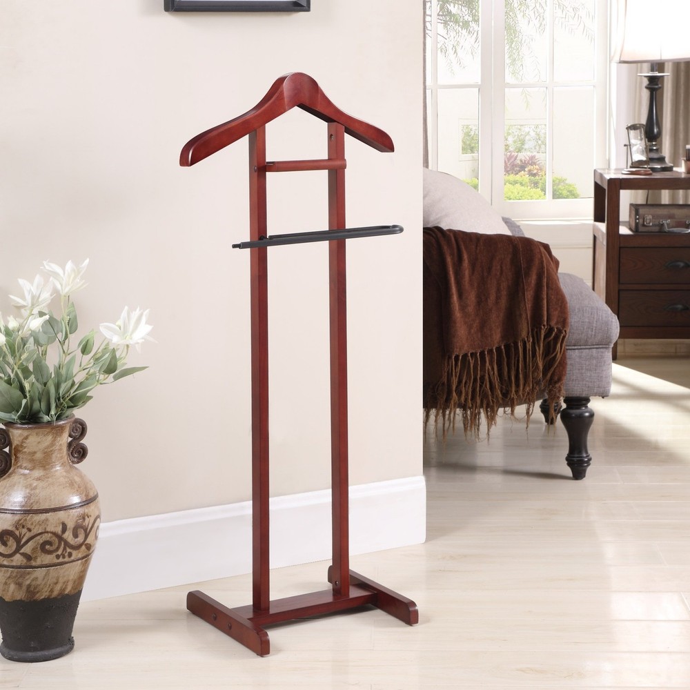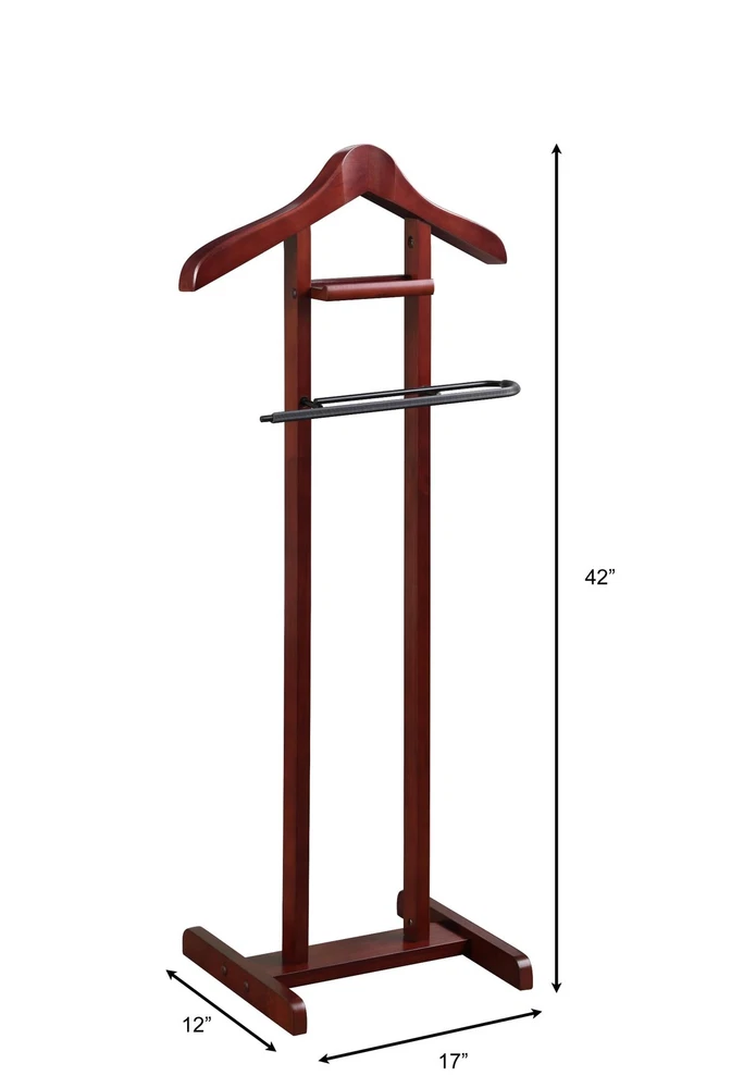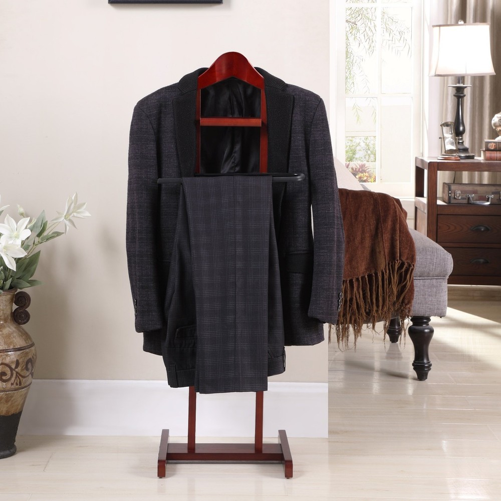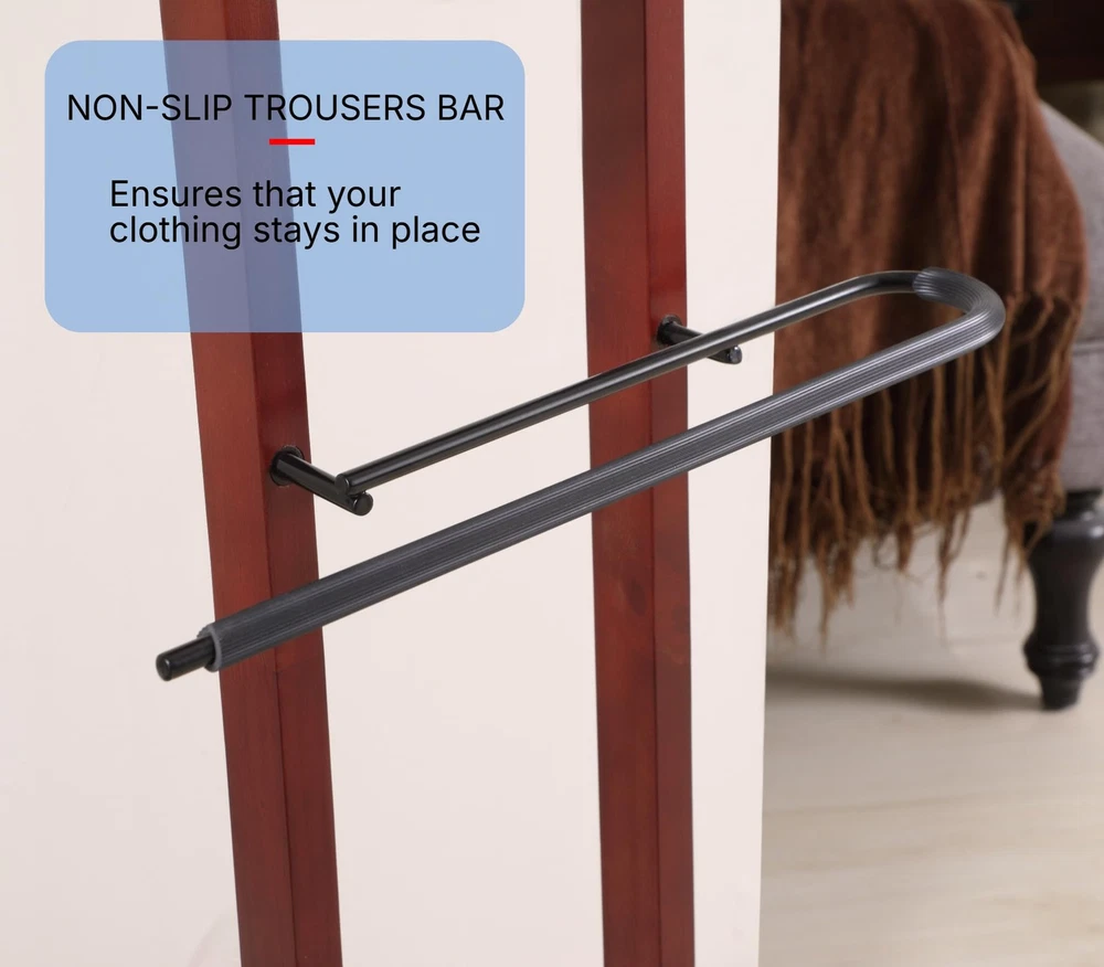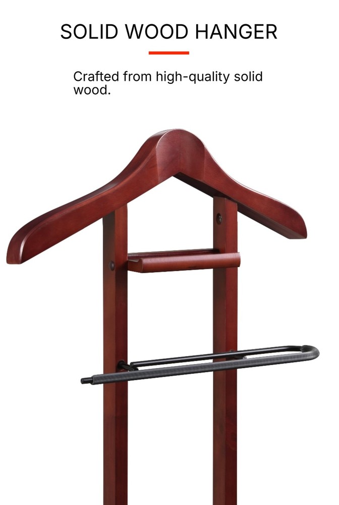 【Product Dimensions】17" W x 12" D x 42"H, Weight: 5 lbs 【Solid Wood Hanger】Crafted from high-quality solid wood, the hanger is not only durable but also adds an element of sophistication to your clothing organization. Its smooth finish and elegant design make it a stylish addition to any room. 【Non-Slip Trousers Bar】 A non-slip trouser bar that offers a secure and organized way to hang your pants, ties, and belts. The non-slip design ensures that your clothing stays in place, eliminating the frustration of garments slipping off and becoming wrinkled or creased. 【Tray】The stand features a tray for holding your wallet, keys, and other small personal items 【Hight Quality Solid Wood Construciton】The meticulous craftsmanship and durable construction of this valet stand ensure that it will withstand the test of time, providing you with a reliable and stylish storage solution for years to come. Its sturdy construction also offers stability, ensuring that your clothing and personal belongings are secure and organized. 【Easy To Assemble】Designed for easy assembly and simple maintenance, making it a hassle-free addition to your home. With its user-friendly design, you can have this valet stand up and running in no time, with minimal effort required.