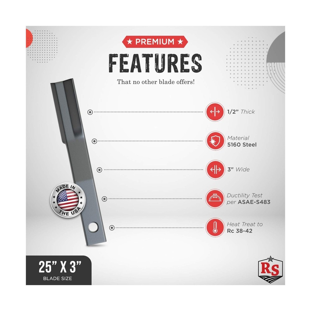 Replacement Land Pride Rotary Cutter Blades, 820-198C Lawn Mower Blades and Compatible Rotary Replacement Blades for Brush Mowers (2 Blade Set) Description Features: High Quality: These rotary cutter blades are made of high-quality steel for the durability you need to get back to work. Dimensions: This rotary blade is 3 in. x 25 in. x 1/2 in. with a 1-1/2 in. bolt hole. Replaces: 820-198C Fits: RCF 2060, RCR1560, RCR1260, RCR1860, RCR2512CTR USA Made: Rancher Supply always has what you need to get the job done right the first time and the second time, and the third time too. Trust us to help complete your projects with quality products each and every day. Product Details: Package Dimensions: 28.27 x 6.54 x 3.7 inches Item Weight: 21.3 pounds Manufacturer: Rancher Supply