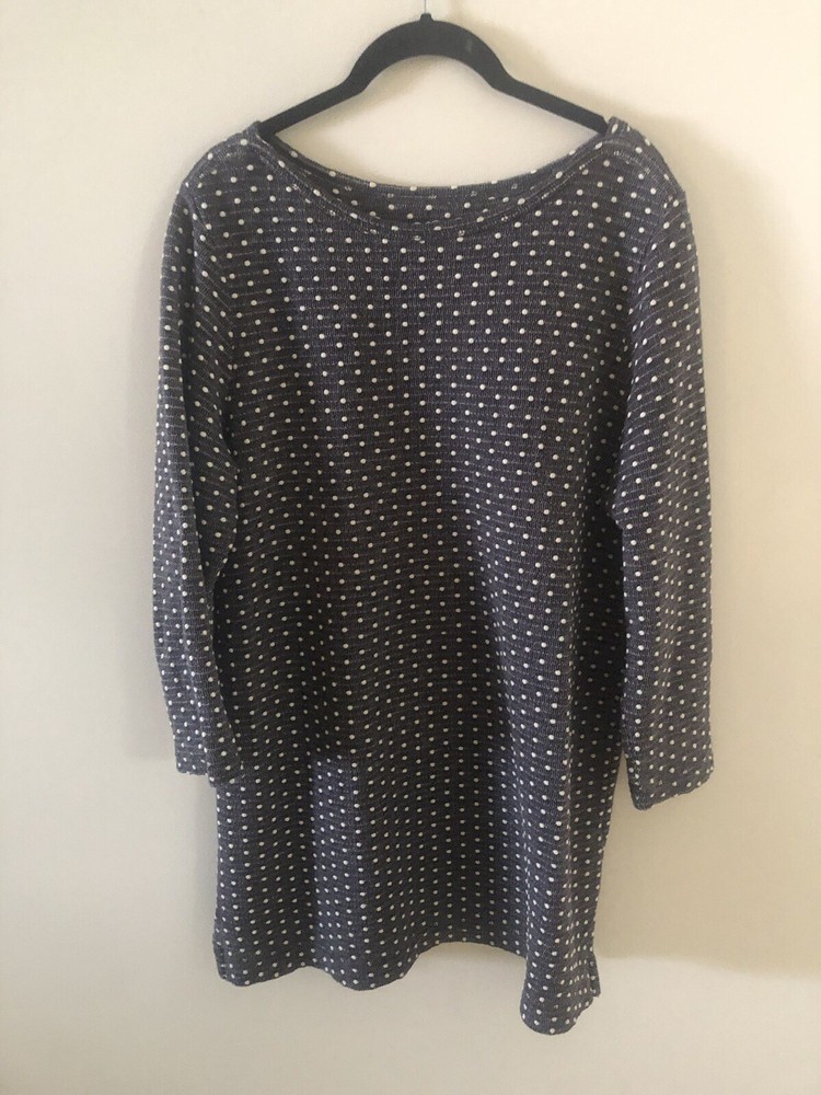 Excellent condition……. This Lands' End tunic shirt is a versatile addition to any wardrobe. The polka dot pattern adds a touch of playfulness to the gray and white color combination, making it suitable for travel, casual outings, or even business meetings. The shirt is made of 100% cotton fabric, ensuring comfort and easy maintenance with machine washable garment care. The casual sleeve type make it suitable for all seasons, whether it's winter, summer, fall, or spring. The round neckline and pullover closure add to its easy wearability, while the regular fit and size type ensure a comfortable and flattering fit for women's size L (14/16). This tunic shirt is a must-have for any fashion-conscious woman looking for a stylish and practical addition to her wardrobe.