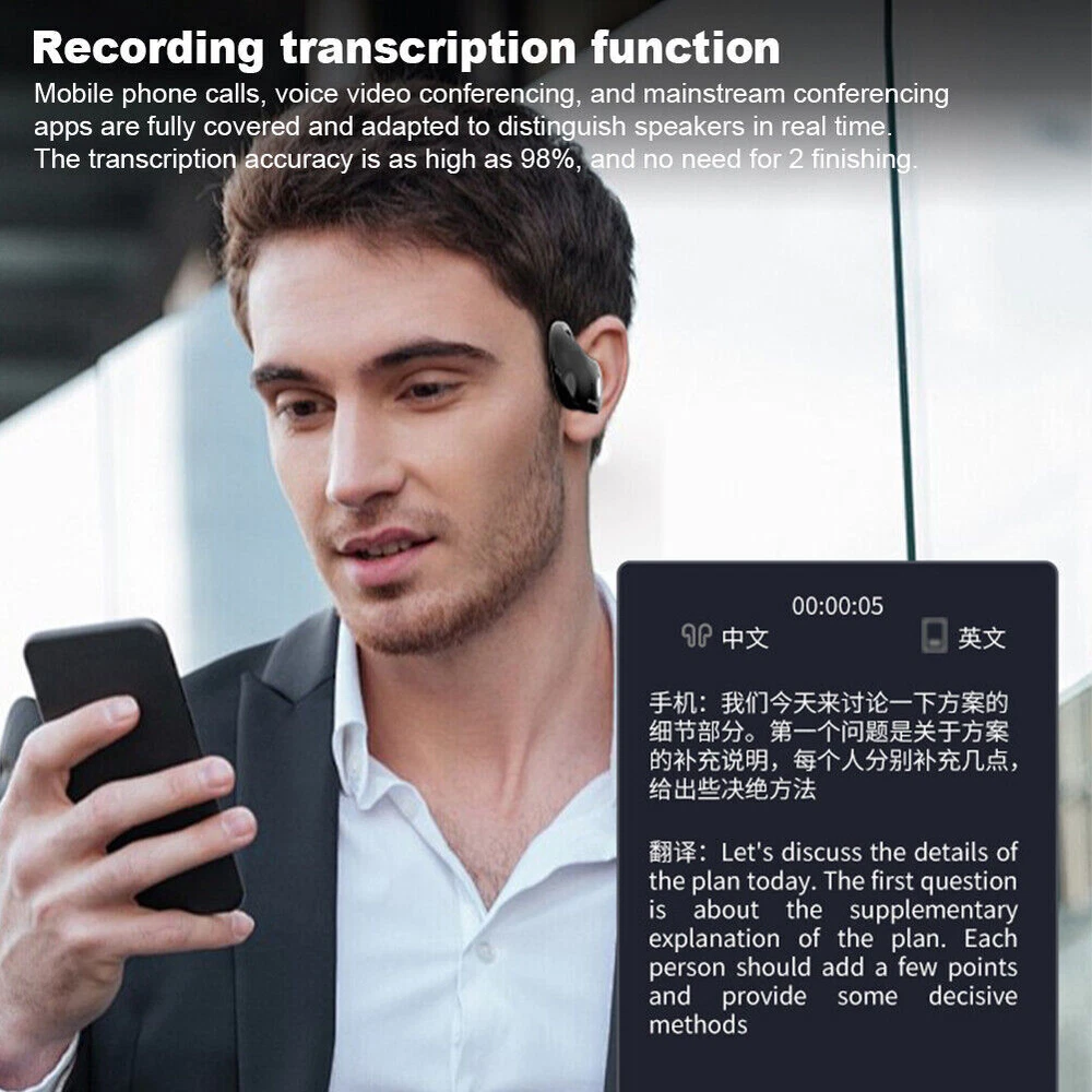 Product Description Feature: - Effortless Multilingual Communication:Break language barriers with these earbuds, supporting 70+ languages for smooth conversations anywhere. - Perfect for Travel & Work:Ideal for travelers and professionals, these earbuds ensure clear communication in any situation. - High-Accuracy Translations (98% Accuracy):Enjoy fast, accurate translations with features like voice recording, translation, and speech. - Smart AI Features:Built-in AI enhances translations and offers extra functions like AI chat for more versatile use. - Crystal-Clear Sound:Experience high-quality, clear audio during translations, calls, or gaming with no interference. Specification: Size: 50.00x44.00x24.00mm/1.97x1.73x0.94inch BT version: 5.3 Speaker specification: 13MM Earphone battery capacity: 50mAh Charging case battery capacity: 250mAh Single use time: about 4 hours Interface type: Type-C Waterproof and dustproof level: IPX4 Real-time translation: 70+ languages Package Included: 1 x Earphones 1 x Lanyard 1 x Wireless Charging Case 1 x Type-C Charing Cable 1 x User Manual
