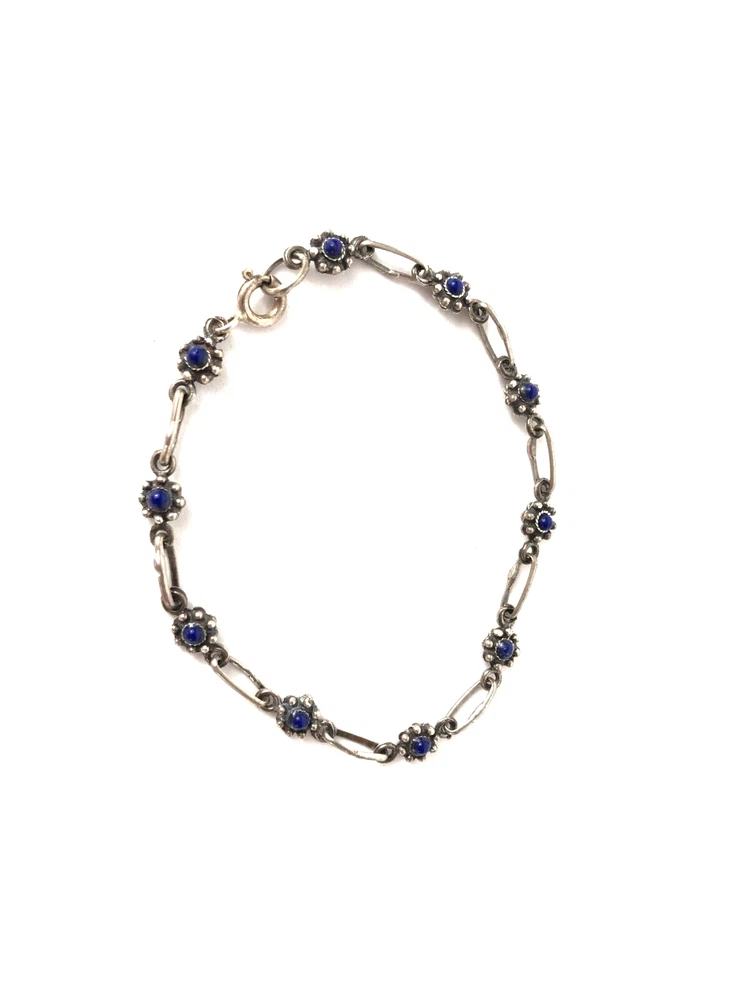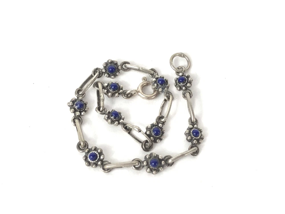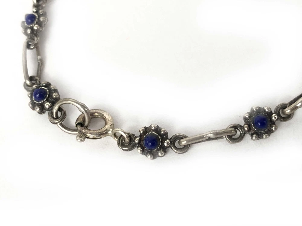 Lapis Lazuli Minimalist Link Bracelet Sterling Silver 925 Fine Jewelry 6.75" Type: Bracelet Stone: Lapis Lazuli Length: 6.75" Width: 4.2 mm Height: n/a Weight: 3.5 gr Clasp: Spring Ring Hallmark: 925 Condition: Scattered scratch and patina, could use a good polishing, stones are fine Comments: A very delicate bracelet, the stones are well matched in color Please see all photos for details