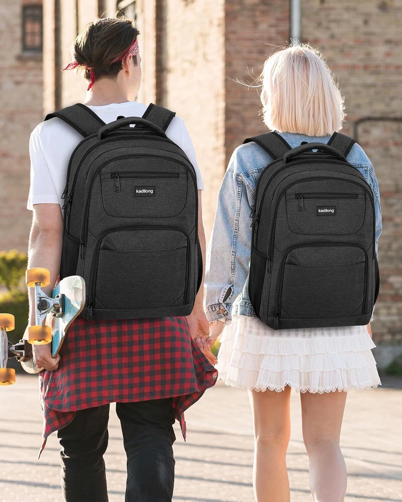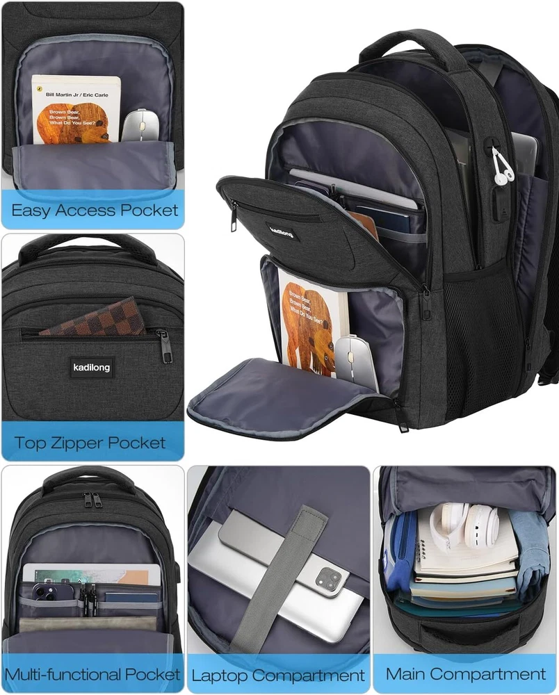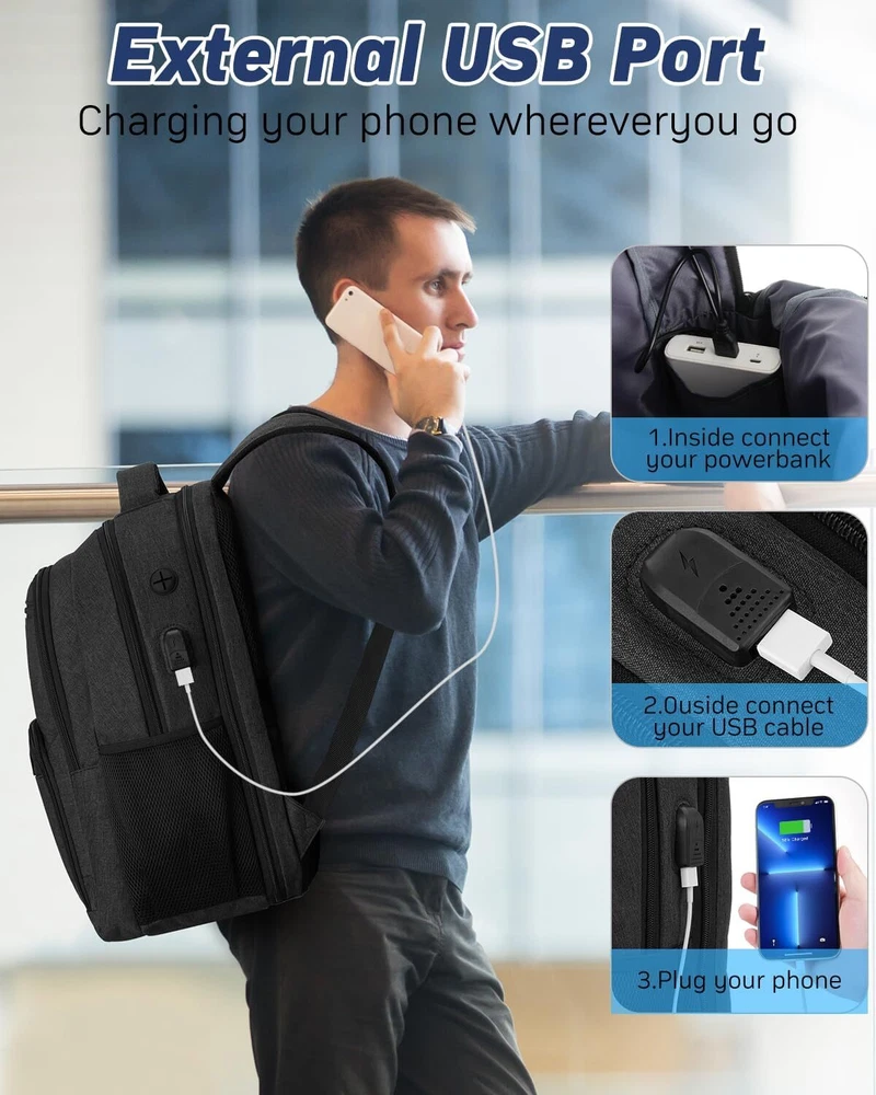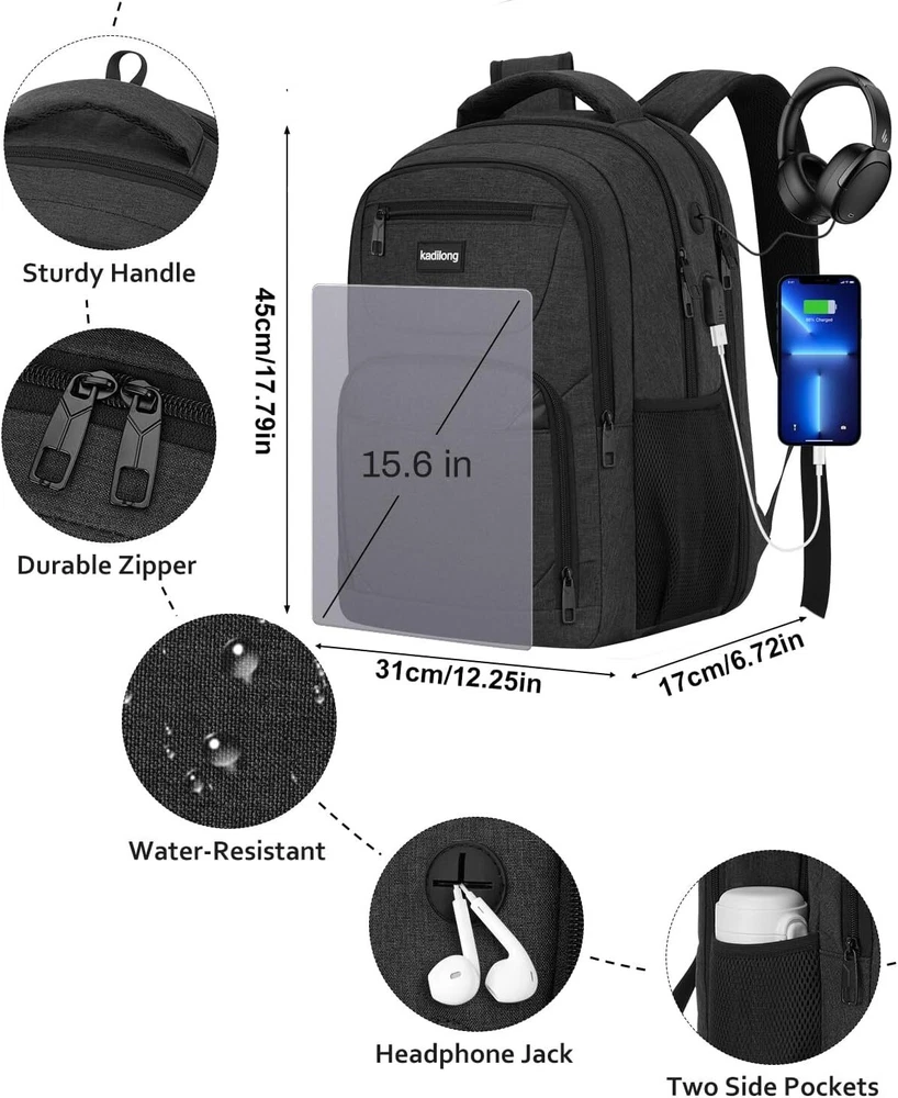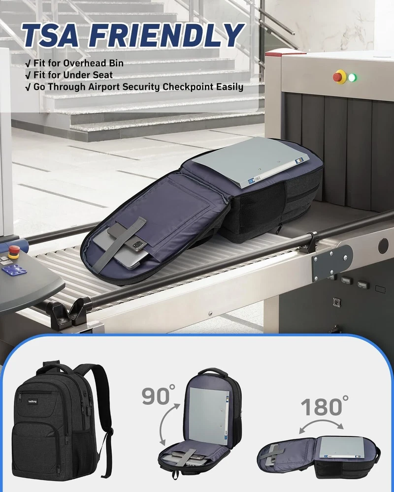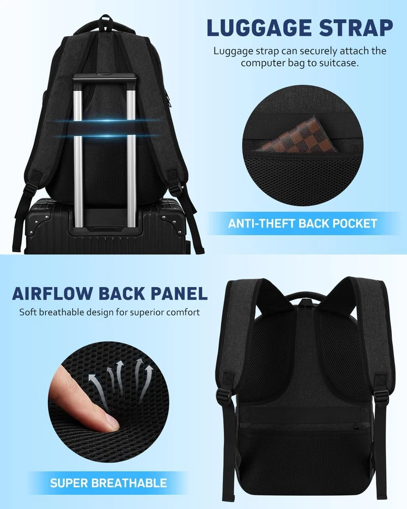 Laptop Backpack for Men, School Bookbag Gift Teens Boys 15,6 inch, Black Product Details LARGE CAPACITY & ORGANIZED: men backpack owns many pockets for large storage and organization for small items. One separate laptop compartment hold 15.6 Inch Laptop as well as 15 Inch,14 Inch and 13 Inch Laptop. One spacious packing compartment can accommodate lots of stuffs like college supplies, daily necessities, clothes, stationery, notebook, cord organizer. Side elastic net pockets conveniently hold travel gear umbrellas or water bottles. EASY FOR TRAVEL: Unfolds the laptop backpack freely 90-180 degree, exclusive designed for airplane traveling, allowing you to quickly pass through airport security and keep things tidy. Served as durable business work bag, laptop bag or spacious college backpack, you can use it at anywhere for work backpack, school backpack and travel backpack . USB PORT&HEADPHONE HOLE: With built in USB charger and headphone hole design,this school computer backpack offers you a more convenient way to charge your phone and enjoy the music while walking. As a school backpack for men and women, high school college bookbag, computer knapsack. FUNCTIONAL&SAFE: A luggage strap allows backpack fit on luggage/suitcase, slide over the luggage upright handle tube for easier carrying. With a hidden anti theft pocket on the back protect your valuable items from thieves. making your journey and travelling more convenient wherever you go. STURDY MATERIAL&SOLID: Made of water rsistant and sturdy polyester fabric with durable metal zippers. Ensure a secure & long-lasting usage everyday & weekend. Serve you well as professional office work bag,computer bagpack, back to college back to school backpacks.(Age: above 3 years old)