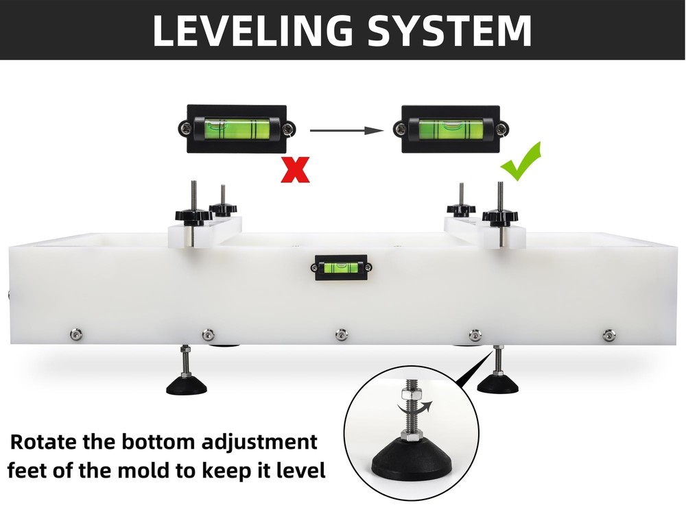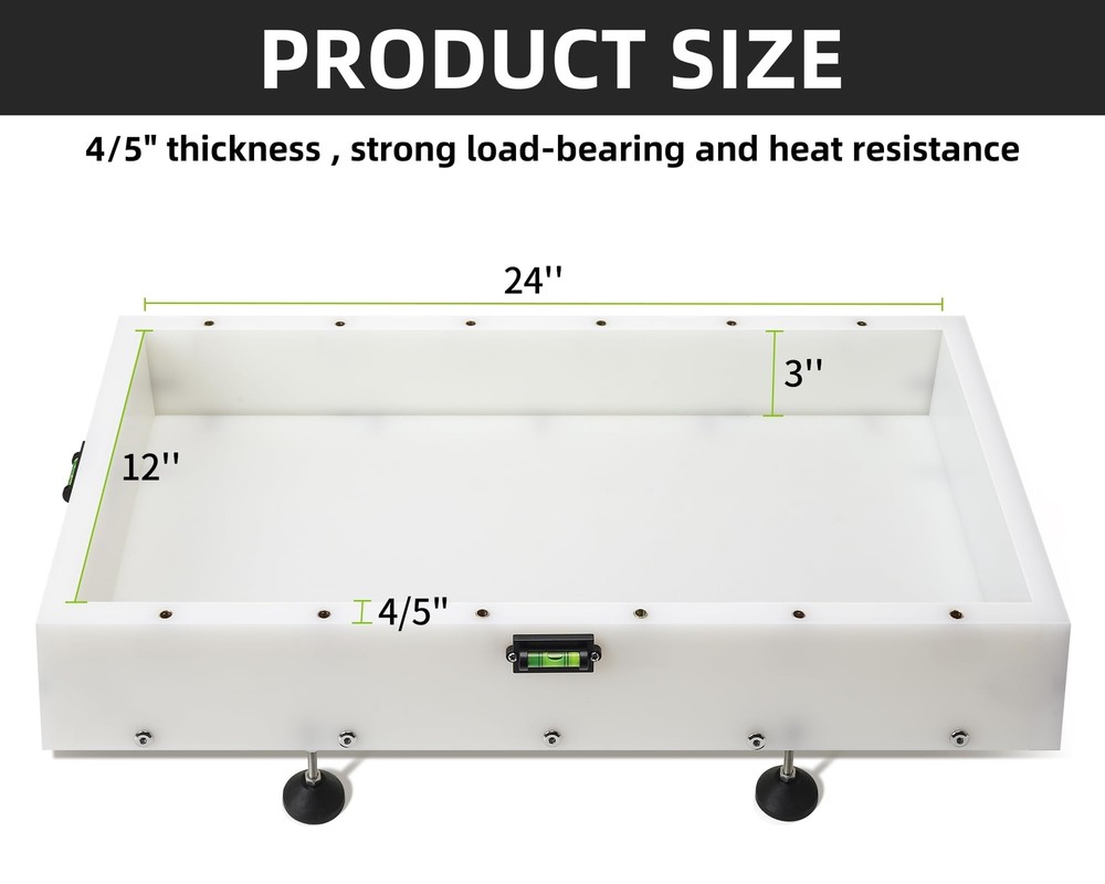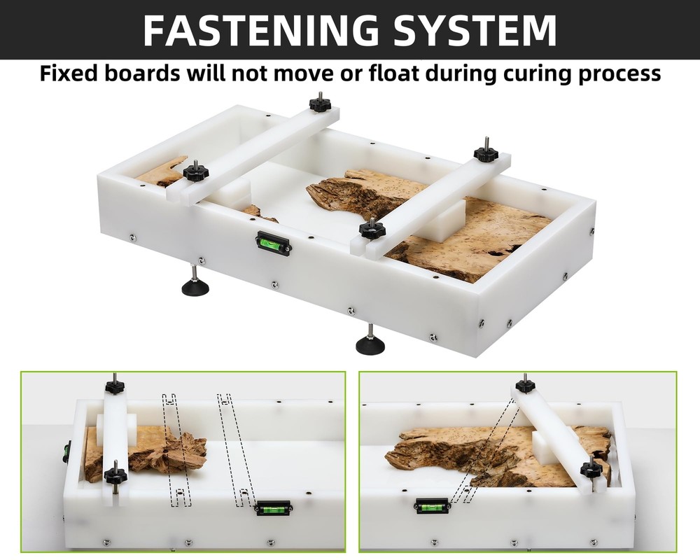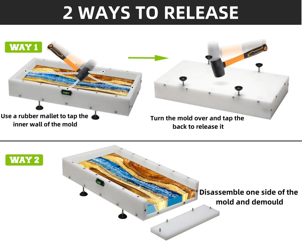 Reusable Epoxy Resin Mold 24x12x3 Inches, Adjustable Fastening and Leveling, Heavy Duty Large Resin Mold for River Tables, Coffee Tables, Trays, Cutting Boards, DIY Resin Art Etc. HEAVY-DUTY EPOXY RESIN MOLD - These molds are made from 4/5 inch (2cm) thick HDPE material. Compared to silicone molds and other lightweight resin molds, they can withstand high temperatures and pressures during the resin curing process without deformation. For users who frequently create resin artworks, this reusable mold is an excellent investment. CNC PROCESS - Our large resin molds are cut and drilled using precision CNC equipment, and each panel is tightly connected with stainless steel bolts and threaded inserts to ensure a solid structure. This design makes the inner wall of the mold vertical, avoiding the protruding weld lines common in one-piece no seal molds, ensuring a neat appearance of the final product, and reducing post-finishing work and resin waste. LEVELING AND FASTENING SYSTEM - This resin mold features 2 levels and 4 adjustable feets for real-time level monitoring and adjustment, 2 adjustable pressure bars and 4 clamping blocks to easily secure the wood blank without the need for additional fixing tools. Whether you are making cutting boards, trays, river tables or coffee tables, our resin table molds can help you better complete various projects. EASY DEMOULDING - Since this large epoxy resin mold is made of HDPE material, which has self-lubricating properties and the resin does not easily adhere to its surface. Easily release by tapping it with a rubber mallet or taking apart the short sides of the mold. Easily handle various demoulding challenges. PRE-ASSEMBLED SHIPPING - Our resin mold bodies are pre-assembled before shipping, no complex assembly issues (please note: silicone sealing of the seams is required before pouring resin). Additionally, we have an after-sales service center in California. Our support team can provide timely post-sales support. About Resin Molds Our molds incorporate advanced CNC machine technology and high-quality 304 stainless steel screws to ensure precision and durability. Additionally, each set of products undergoes pre-assembly before shipping, guaranteeing strict quality control standards. These molds are particularly suitable for creating heavy-duty and large-scale resin crafts such as river tables, coffee tables, trays, cutting boards, and DIY resin art. In terms of materials, our molds are the only ones on the market that utilize 4/5-inch thick HDPE heavy-duty material with easy demolding properties. They possess robust resistance to deformation and heat, ensuring long-lasting durability and preventing resin wastage caused by cheap and inferior molds. If you are considering purchasing a set of resin molds, why not give our heavy-duty molds a try? They are undoubtedly a worthy investment. Shipping We offer FREE shipping on all orders! We ship within Three business days of payment, usually sooner. We use a selection of shipping services such as UPS, FedEx, USPS etc. We only ship to the lower 48 states, no APO/FPO addresses or PO Boxes allowed. Local pickups and combined shipping options are not provided at this time. Return You can return a product for up to 30 days from the date you purchased it. Any product you return must be in the same condition you received it and in the original packaging. Please keep the receipt. Payment We accept payment by any of the following methods: PayPal Please pay as soon as possible after winning an auction, as that will allow us to post your item to you sooner! Feedback Customer satisfaction is very important to us. If you have any problem with your order, please contact us and we will do our best to make you satisfied. Contact Us If you have any queries, please contact us via ebay. We usually respond within 24 hours on weekdays. Please visit our eBay store to check out other items for sale! Thank you for shopping at our store.