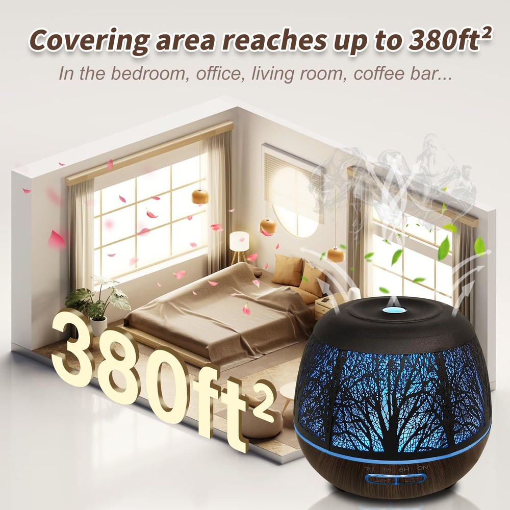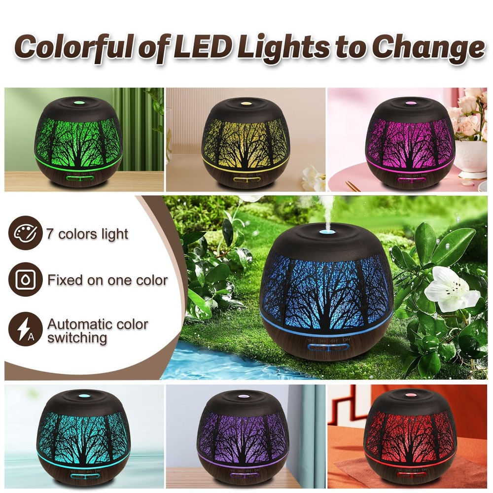 【Metal Hollow Design & R/C】:Diffusers for home is large area hollowed out,forest pattern,scented oil diffusers,more realistic,essential oils diffuser,with 7-color color change,oil diffuser large room,the atmosphere is good,diffusers for essential oils is a newly upgraded product with a remote control,fragrance diffuser,you can use remote control in the big room,400ml essential oil diffuser meets your daily needs,hotel collection diffuser,light diffuser convenient and fast. 【Low Noise & 400ML Large Capacity】:Metal Essential oil diffusers,low noise,sleep better,aromatherapy diffuser is water tank is 400ml,essential oils for diffusers for home is enough to use all night,diffusers are avoid frequent water addition,wide coverage,scent diffuser is used in large rooms,oil diffuser essential oils uses ultrasonic technology,the fog is delicate,aroma diffuser,relieving room dryness,humidifier and diffuser,adding favorite essential oils,air diffuser create a comfortable atmosphere 【Matte Metal Hollow Design & R/C】:Diffusers for home is made of matte metal material,large area hollowed out,forest pattern,scented oil diffusers,more realistic,essential oils diffuser,with 7-color change,Metal oil diffuser large room,the atmosphere is good,diffusers for essential oils is a newly upgraded product with a remote control,fragrance diffuser,you can use remote control in the big room,400ml essential oil diffuser meets your daily needs,hotel collection diffuser,light diffuser convenient. 【3 Spray Modes & 7 Colors Changed】:Essential oils for diffuser has 3 fog modes,light fog,intermittent spray,heavy fog,fragrance diffuser,adjusting as needed,7 colored lights have 2 modes,cyclic display,one color is fixed,room diffuser,hollow design shows the beauty of lights,air diffuser for essential oils,enhancing the atmosphere of the room,light diffuser,as night light,aroma ultrasonic diffuser,diffuser,decorations for bedroom,essential oil diffusers for home 【1/3/6 Timers & Waterless Auto-off】: Essential oil diffusers large room has 3 timing modes, 1/3/6H, travel diffuser,for yoga, SPA, office, sleeping, and has waterless auto-off at the same time, oil diffusers,you don't have to worry about the circuit damaged due to lack of water, using scent diffusers for home with peace of mind, ultrasonic diffuser,diffuser for essential oils,large room diffuser,multiple functions to meet daily needs 【Perfect Gifts】:Diffuser for large room is suitable for birthdays,anniversaries,holidays,weddings,Father's Day,Mother's Day,Valentine's Day,Christmas,Thanksgiving,Halloween.Cute diffuser can be used as gifts for children,friends,family and colleagues.Diffuser oils scents for home is suitable for bedroom desk decoration,easy to clean,large water inlet,essential oils for diffusers,not easy to spill when adding water 【Sales Service】: 400ml of water is suitable for adding more than 4 drops of essential oil, which will smell better. The applicable range is 20-35 square meters. Since the essential oil used for a long time will block the atomizing plate, resulting in no spray, it should be cleaned regularly.Remote control range is within 15m, and the insulation sheet must be removed before use.If you have any questions, please contact us and I will provide you with quality service. Operation instructions: Timer mode: Press the MIST key for the first time to set the timer for 1H; Press the MIST key for the second time to set the timing 3H, press the MIST key for the third time to set the timing 6H, and press the MIST key for the fourth time to set the continuous spray. Adapter specifications:Input: 100-240V-50/60Hz 0.4A;Output: 24V---0.5A