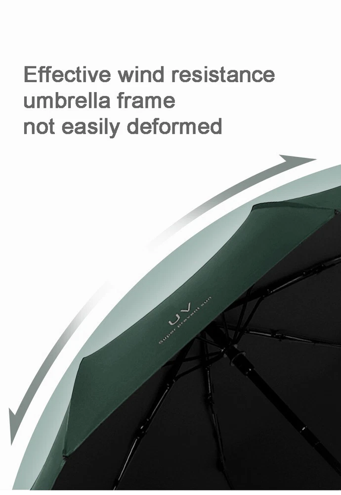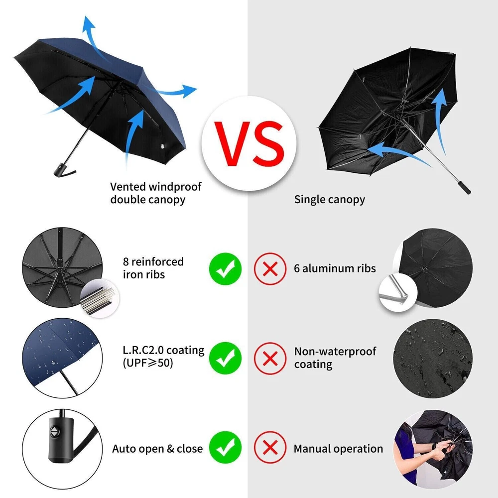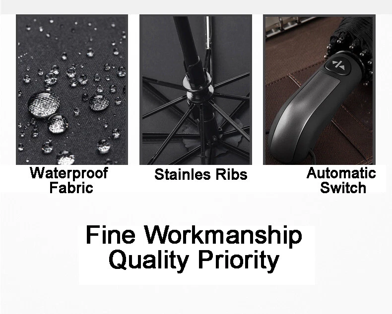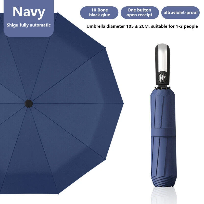 Automatic Open & Close Foldable Umbrella Wind Resistant Compact Umbrella 10 Ribs Small Portable Umbrella Stormproof for Rain Features: 1.Sturdy and Windproof: Experience the unbeatable wind resistance of our travel umbrella. Designed with strengthened umbrella ribs, this umbrella is built to last and offers exceptional durability. It effectively withstands strong winds, providing reliable protection even in challenging weather conditions. Enjoy the confidence and peace of mind that comes with owning a sturdy and windproof travel umbrella that can stand up to the elements. 2.Quick-Drying Canopy: Our folding umbrella features a canopy made of impact fabric with lotus leaf effect, ensuring quick drying and water repellency. With just a single shake, the folding umbrella instantly dries off, preventing water from adhering to the surface. Stay dry and comfortable, even during sudden showers, as the canopy efficiently repels water, keeping you sheltered without the hassle of a wet umbrella. 3.Fully Automatic Operation: Embrace the convenience of our foldable umbrella, designed for effortless operation. With just one press of a button, the umbrella opens and closes smoothly, making it easy to deploy or stow away. No more struggling with manual mechanisms or getting caught in the rain while fumbling to open your umbrella. Enjoy the simplicity and ease of using our foldable umbrella, allowing you to stay protected with minimal effort. 4.Compact and Lightweight: Our compact umbrella is not only functional but also highly portable. It folds down into a compact size, making it convenient to carry and store in your bag, backpack, or car. The lightweight design adds to its portability, ensuring that you can take it with you wherever you go. Stay prepared for unexpected rain or sun with our compact umbrella, always ready to provide shade or shelter at a moment's notice. 5.Reinforced Double Canopy: Discover the added strength and durability of our double-layered canopy design. The reinforced double canopy structure enhances the small portable umbrella's resistance to strong winds, offering extra stability during storms. This innovative design combines functionality with style, making our small portable umbrella a reliable and fashionable accessory for any occasion. Embrace the benefits of a reinforced double canopy umbrella that provides both protection and elegance. Specification: Origin: Mainland China Umbrella Fabric Material: Impact Cloth Umbrella Handle Material: Rubber Umbrella Cloth Density: 210t Number Of Umbrella Bones: Ten Umbrella Material: Black Gold (Iron) Opening And Closing Mode: Automatic Suitable Number: 1~3 People Weight: 420 Grams Size: Under The Umbrella Diameter 105cm, Open Height 65cm, Close Height 33cm Product Size: 1050.00 X1050.00 X650.00 mm / 41.34 X41.34 X25.59 inch Note: Due to the different monitor and light effect, the actual color of the item might be slightly different from the color showed on the pictures. Thank you! Please allow 1-2cm measuring deviation due to manual measurement.