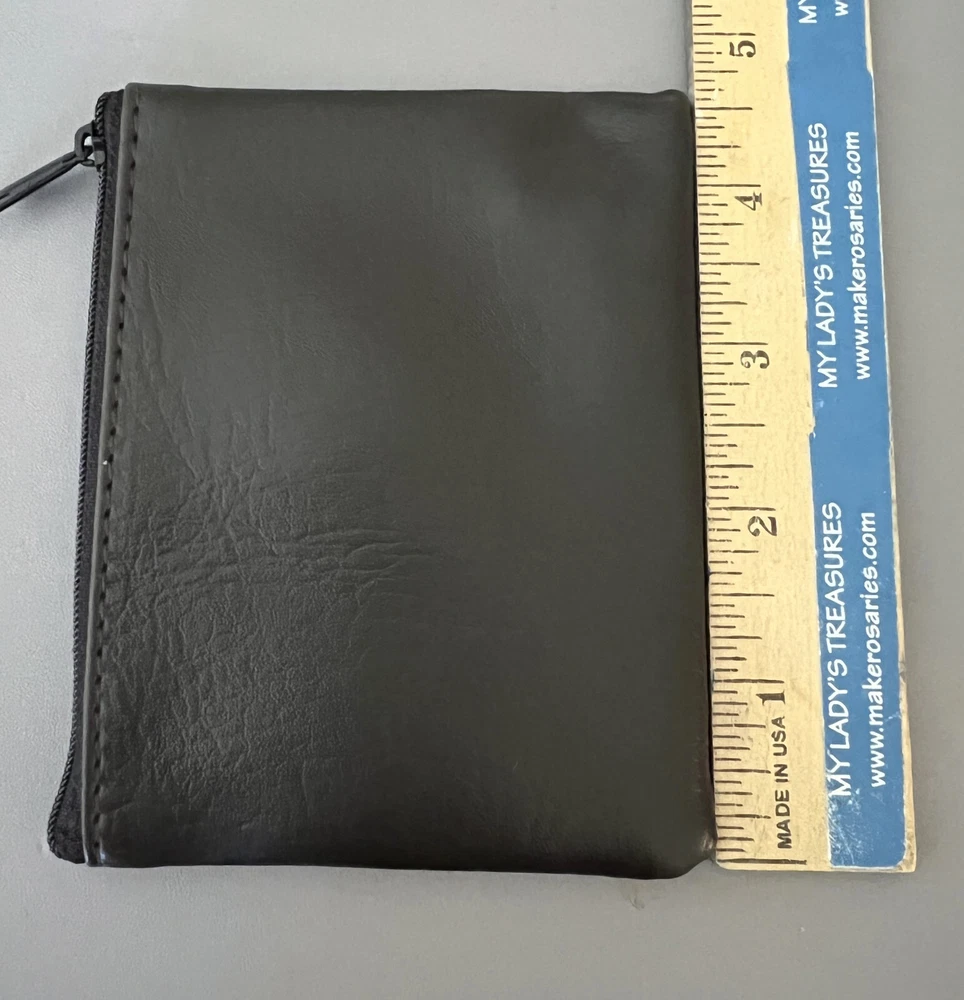 Great rosary pouch for a Large rosary! ♦ Black Imitation Leather ♦ Large size case is 4.5 W x 3.5" H ♦ Zipper Closure ♦ Case is Lined ♦ Cross Design on Front Add another item with NO additional shipping; just use cart to check out Orders over $39 ship for FREE