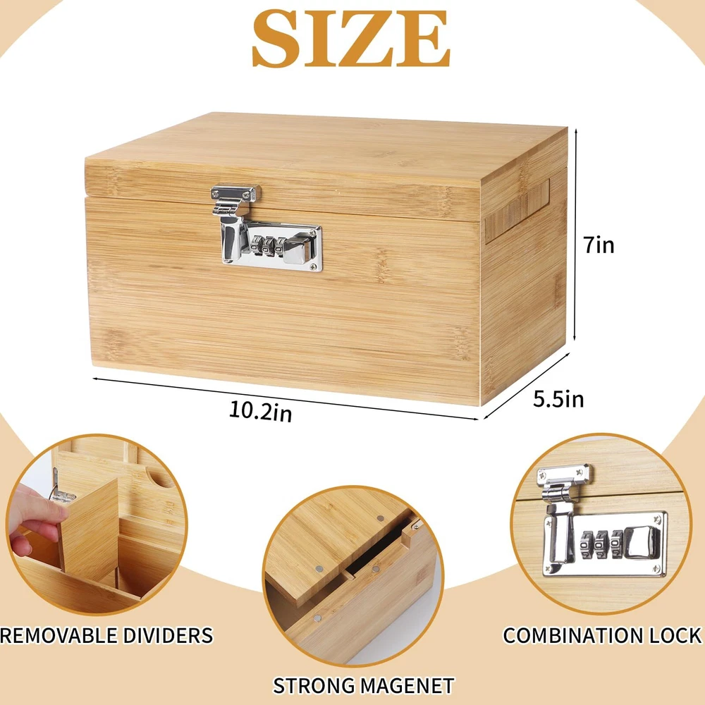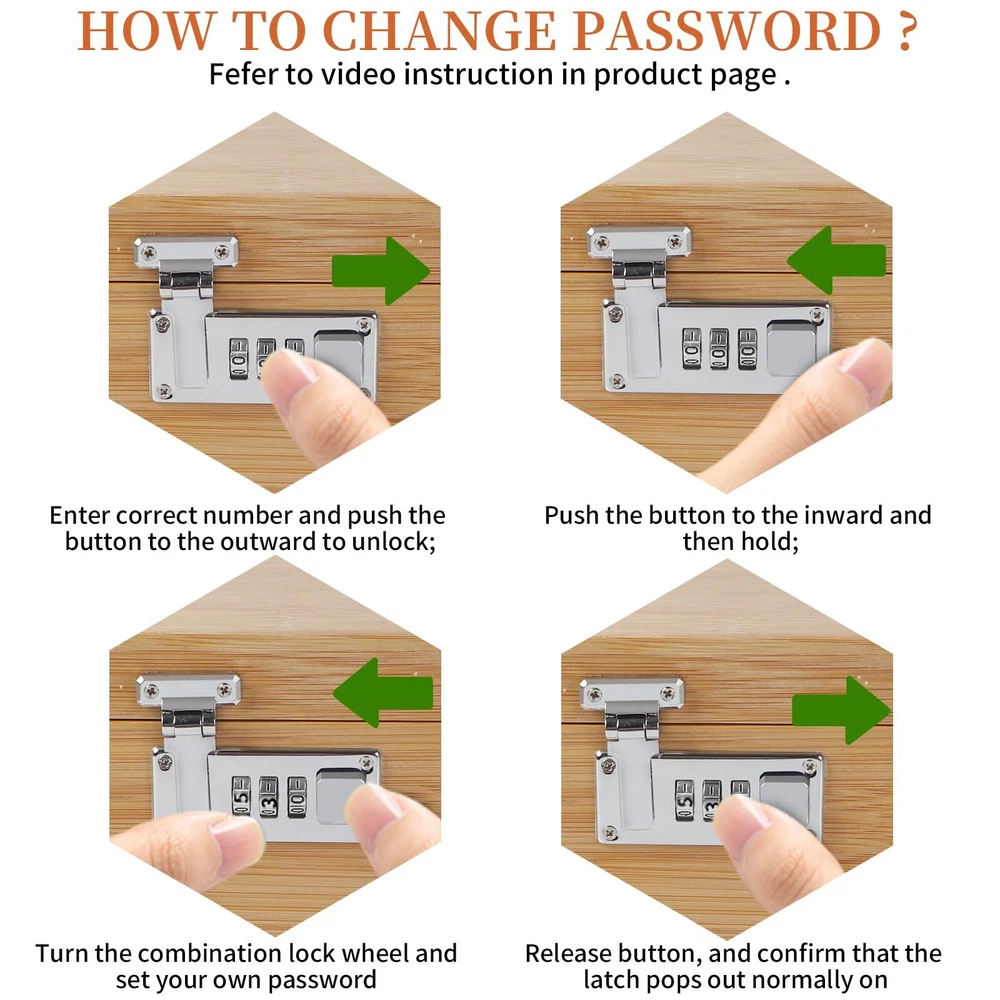 πBOX DIMENSION :The storage box measures 10.2''(L) Γ 7β'(H) Γ 5.5''(W) ,the whole kit comes with glass jars Γ 3οΌcleaning brushes Γ 3 , sufficient accessories satisfy your needs. πPREMIUM NATURAL BAMBOO BOX : The decorative box is made of premium sustainable bamboo., heavy-duty Bamboo thatβs strong enough to keep them study and safe. Bamboo Box is definitely a home essentials organizing choice. π₯SLIDING TRAY & REMOVABLE COMPARTMENT - The sliding out tray offers a customizable layout for your stored items. Adjust the detachable compartments to accommodate different sizes and types of belongings, providing you with a versatile and adaptable storage solution. ππππππππππππ ππππ ππππ ππππ πππππππ: Default password is 0-0-0 of combination lock ,we have video instruction of code setting in the product page and manual instruction in the package to ensurr that you can quickly establish a secure combination without any complicated procedures. Creat a private space and enjoy a straightforward/user-friendly experience πOUTSTANDING DETAILS -The bamboo box is crafted well by master craftsman . Strong hinges ensure easy opening and closing of the lid.Bambo surface ismooth and well polished.In addition ,there are four rubber mat on the bottom to protect the box. πA GREAT GIFT FOR ENTHUSIASTS - . What could be better than to help them preserve the essentials meanwhile keeping everything neat and organized?