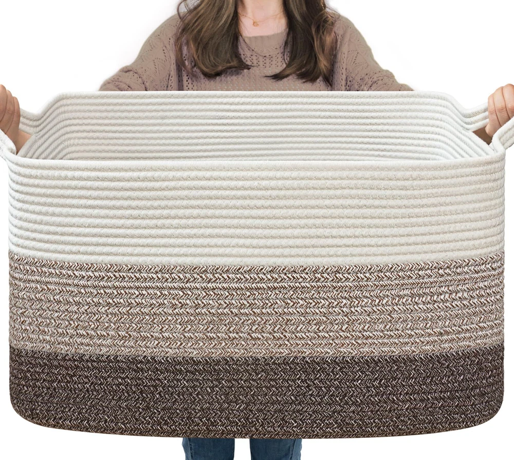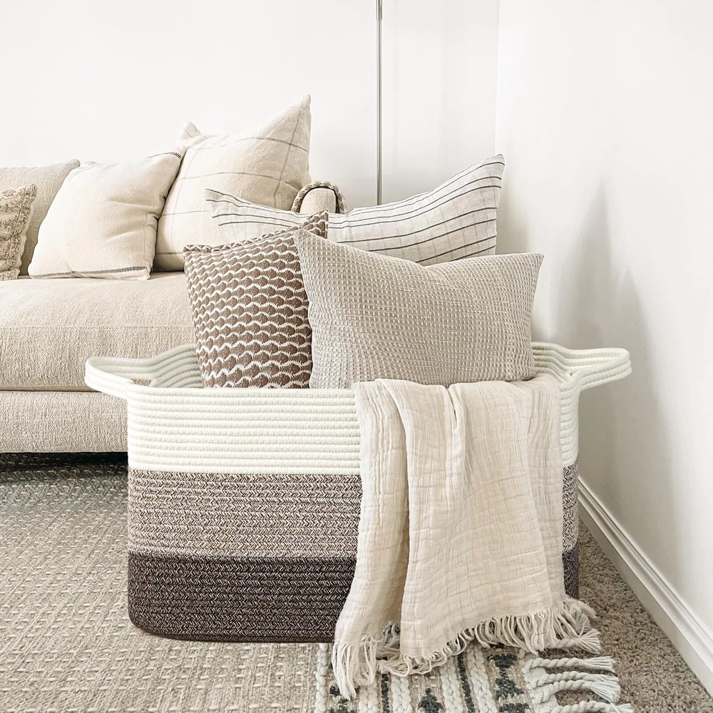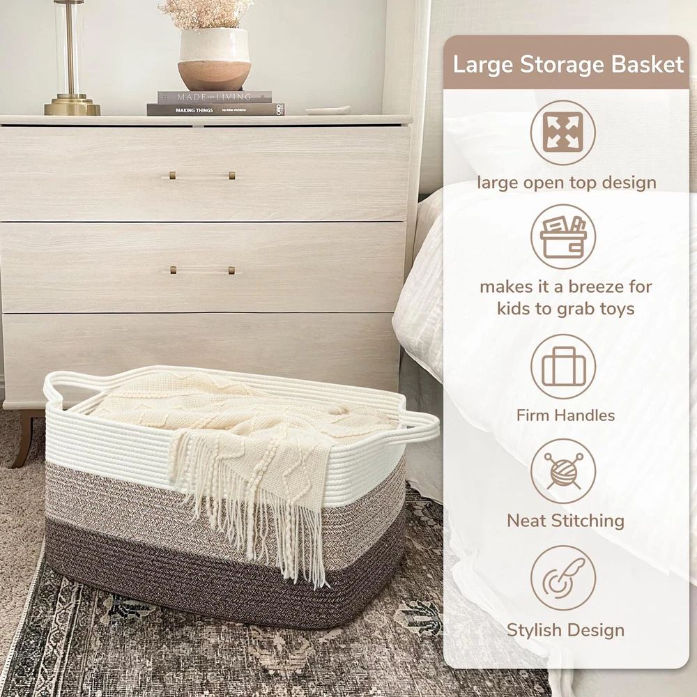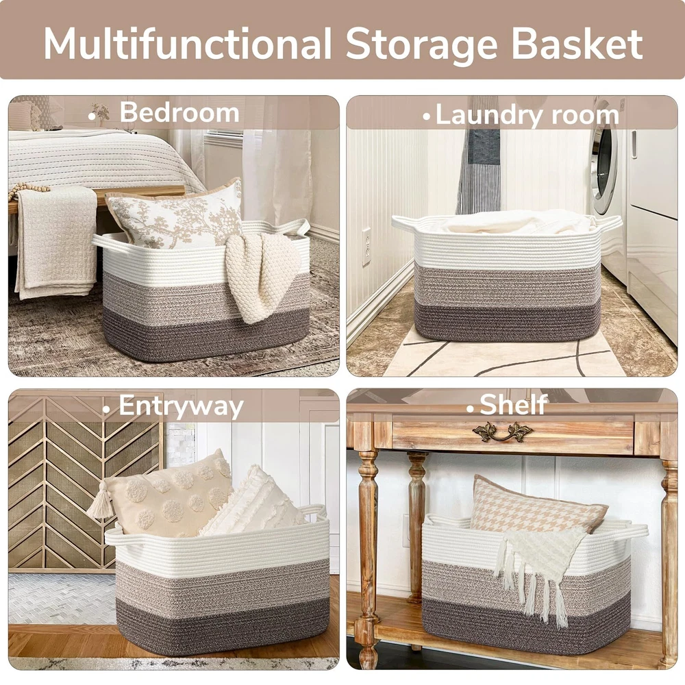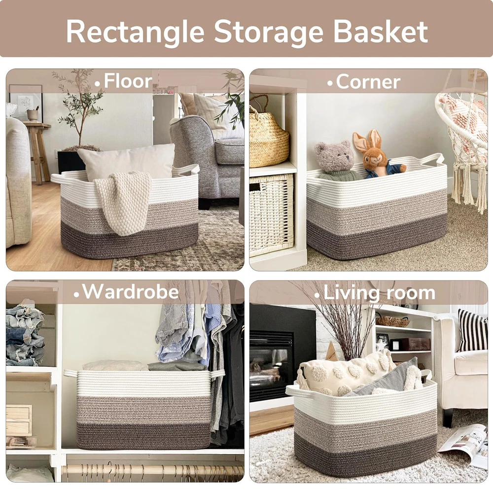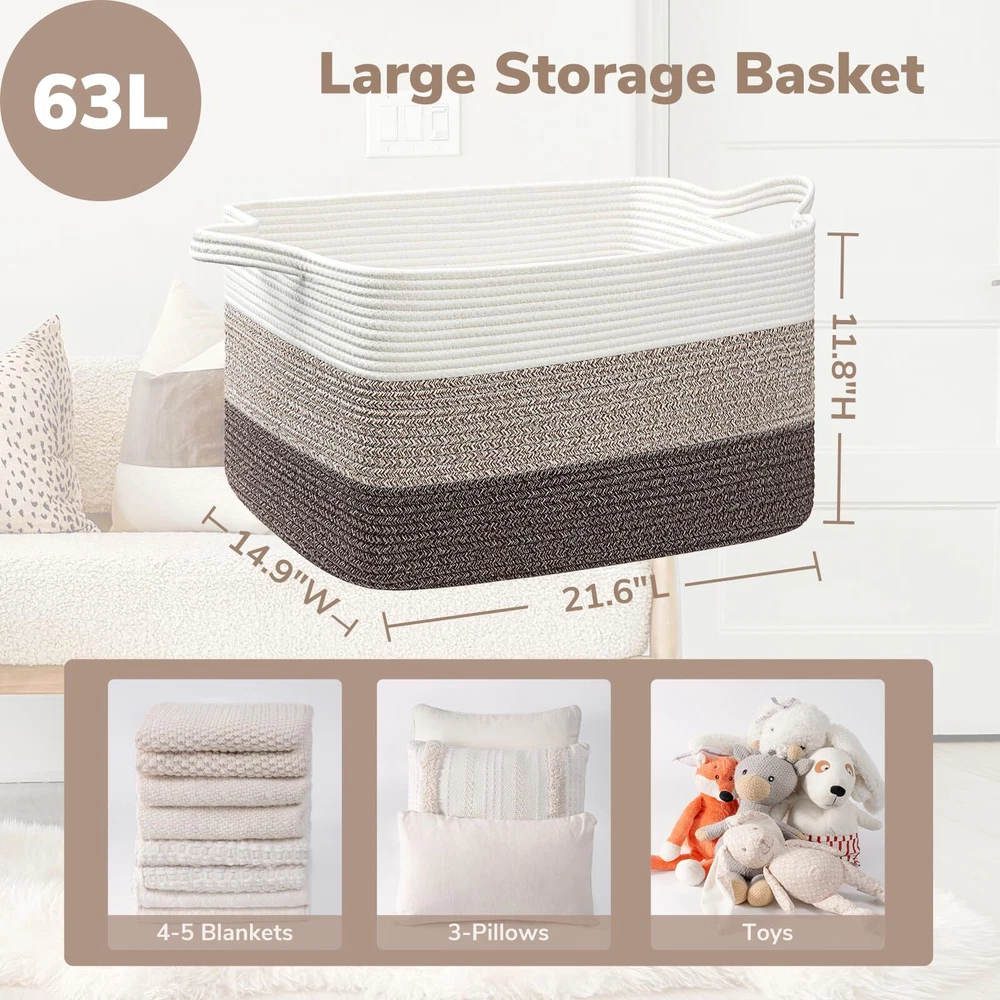 Extra Large Blanket Basket: measures 21.6" Lx 14.9" Wx 11.8" H, providing ample space for 4-5 throw blankets, 3 big pillows, or 2 throw-sized quilts. Keep your home organized and clutter-free with ease Rectangle Storage Basket Design: Say goodbye to round baskets that only occupy the floor. Our rectangular laundry basket can be placed on the floor or fitted onto a shelf, wardrobe, or closet. Perfect for organizing dirty clothes and keeping them out of sight Convenient and Easy to Move: Our large toy basket comes with handles, making it easy to move from room to room. With a height of 12 inches, it is also easily accessible for who want to reach in and grab their toys. And when not in use, it can be easily folded and stored to save space Multifunctional Storage Basket: With a neutral color scheme, our woven decorative storage baskets blend seamlessly with any room decor. Use them to extra throw blankets in the living room, ' stuffed toys in their room, towels in the bathroom, and clothes in the laundry room Durable and Soft Material: Our cotton rope basket is made of thick, durable fabric that is good for babies, , and pets to touch. It is also no smells, making it perfect for storing a wide range of items