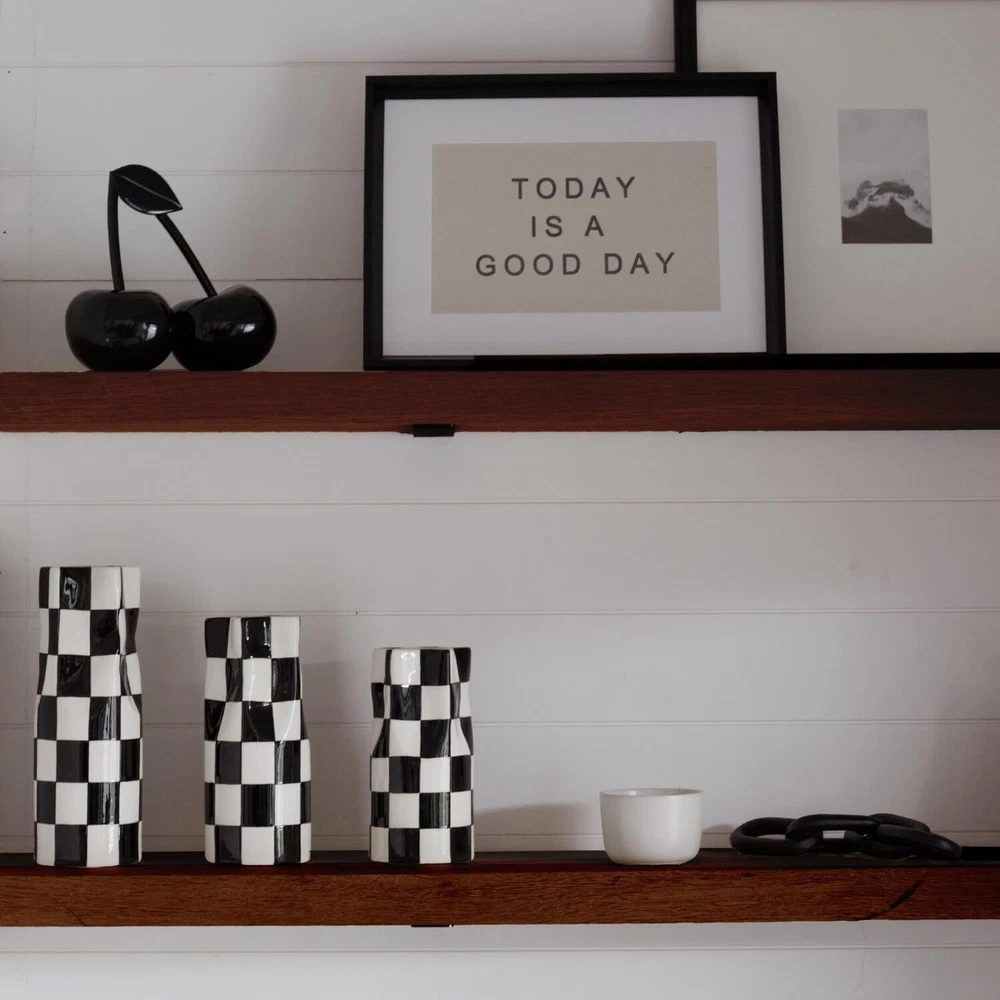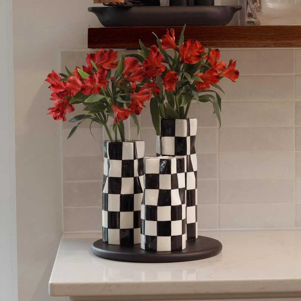 Large Checkered Vase, Modern Home Decor, Decorative 11" Tall, Product Details Material: Ceramic Color: Checkered Brand: Reimagine Discovery Product Dimensions: 3.75"L x 3.75"W x 11.25"H Shape: Oblong HAND PAINTED CERAMIC VASE: A traditional vase with a modern spin, our hand-painted black & white checkered vase will complement home decor and stand out across the rest of your room aesthetic. Our checkered vase is a tall cylinder vase with a squeezed look at the top that opens with a wide star-shaped mouth. Not only does this allow your vase to hold a large floral arrangement but it also helps fan your blooms and dried grasses beautifully. AESTHETIC HOME DECOR: Showcase timeless elegance that’s versatile enough to blend with decades of interior design trends. Display our checkered vases in your home office, bedroom or living room. Use them standalone depending on the size of your floral arrangement needs or pair in a set-of-3 for a gorgeous, explosive flower extravaganza. HOME DECOR GIFTS: Whether you’re shopping for yourself or looking for a unique gift for friends or family, these checkered vases will be sure to impress. The black & white color is universal enough to pair with a diverse range of botanical styles. Try dried grasses, silk flowers or treat yourself to a personal flower Friday! DESIGNED IN THE USA: Our team partners with exclusive ceramic manufacturers that have decades of experience making premium ceramic products. We bring unique goods to the market that are custom modeled by our team of RD Home USA expert designers. REIMAGINE DISCOVERY: In a world where basic home décor is abundant, we aim to elevate spaces with unique style featuring room décor that's aesthetic, modern, and trendy. Our exclusive collection of interior goods are statement pieces that will curate an environment you love.