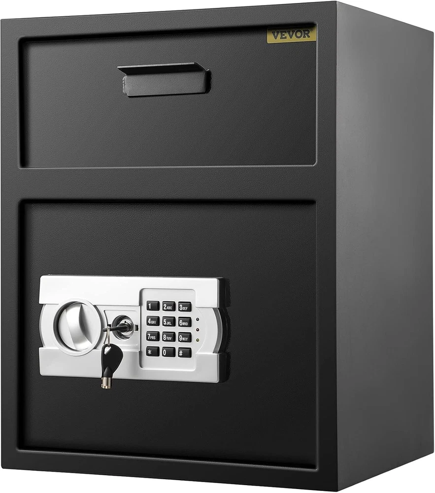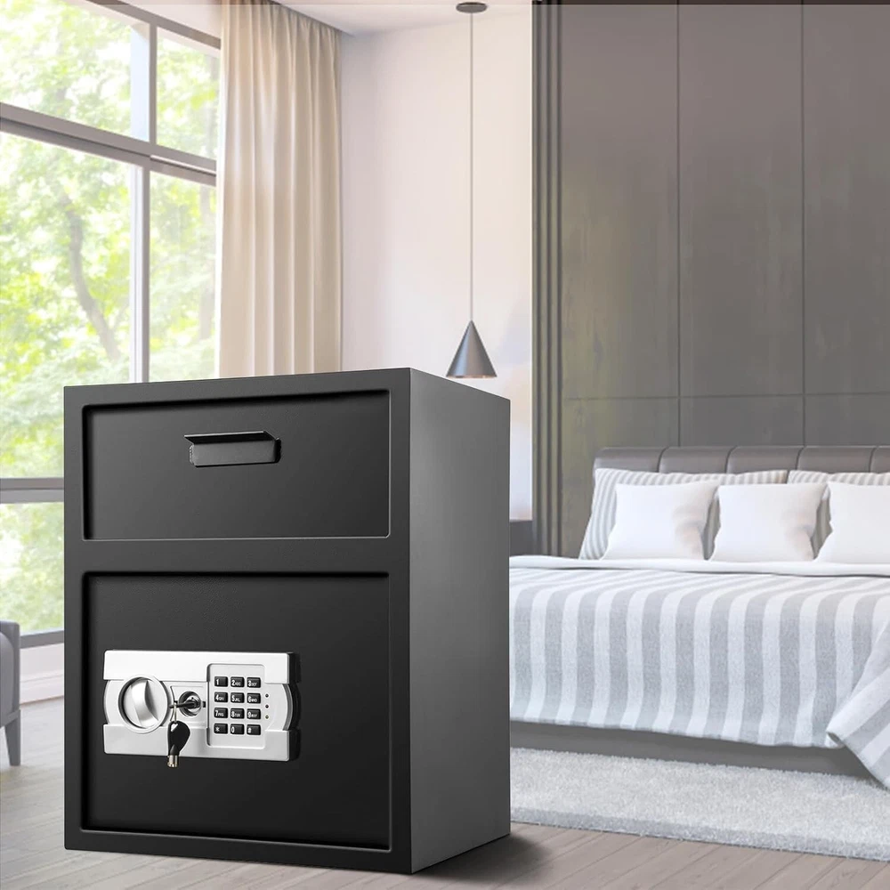 Product Dimensions 11.81"D x 14.17"W x 17.72"H Lock Type Electronic Color Dark Gray Capacity 1.7 Cubic Feet Material Carbon Steel Special Feature Waterproof Mounting Type Wall Mount Control Type Key Control Included Components 1 x Depository Safe 2 x Keys 4 x Expansion Screws 1 x Manual Durable Construction: This depository safe is constructed of heavy-duty carbon steel structure with a thickened front door and body, which can resist the impact of hands and mechanical tools. Sturdy bolts and hinges improve its theft-proof performance. Electronic Lock System: With a reliable electronic lock system, the deposit slot safe effectively keeps children and unauthorized users from gaining access. It can be programmed with two sets of codes and provides two override keys for emergency use. Deposit Slot Design: The safe deposit box cash deposit is designed with a deposit slot, making cash and documents storage a breeze. The front deposit drawer is fitted with a saw-tooth edge tilting baffle to ensure intruders cannot fish out contents. Additional Security: In addition to the advanced electronic lock system, the small drop safe is equipped with the pry-proof locking bolts to provide double protection for valuables. Extensive Using: Featuring stable construction and a secure lock system, this depository box is extensively applied in home, office, and other business places. With two mounting holes on the back, it can be easily installed on the wall, floo