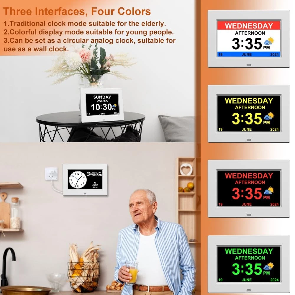 Note: To lower your purchase price, we have cancelled the power adapter. You can use any USB power adapter with an output of 5V/1A or 5V/2A, such as your idle phone charger, to power the clock by connecting our power cord Product Feature Non-Abbreviated Day & Month, Year, Week, Time, Illuminated, Alarm, Auto Dimmable, Calendar Display Latest 3 time display interfaces : Elderly clock; Wall clock; Colorful clock Power source: Corded Electric Package list: 1 pcs clock 1 pcs USB to DC cable ( Not power adpater!!) 1 pcs manual ⏰【No power adapter !!!】To lower your purchase price, we have cancelled the power adapter. You can use any USB power adapter with an output of 5V/1A or 5V/2A, such as your idle phone charger, to power the clock by connecting our power cord【Multi-Displays: Elderly Clock, Wall Clock and Colorful Clock】With 3 displays, each display meet the needs of different people: Elderly Clock is specially designed for our elderly, with [large non-abbreviated font] [Date, Year, Month and Time]display, which is convenient for the elderly to read; Wall Clock , Colorful Clock is a color display, suitable for young and small children ⏰【 Large Font and High Contrast Display】 very convenient for the elderly to read, Soft light, without blue light, no eye injury ⏰【Automatic Brightness Function】brighten during the day, display clearly under strong light, darken at night, avoid disturbing sleep ⏰【12 ALARMS and 3 Medication Reminder】Can be set up 12 daily alarms for daily meals,appointment,exercises,feed pets,go to the bathroom,drink water ,taking and 3 groups medications remainds.This dementia clock you can choose repeat or no repeat.It is Dementia clock,digital wall clock or digital clock ⏰【With Picture and Video Playback Function】 it can be used as a digital photo frame, always share beautiful pictures