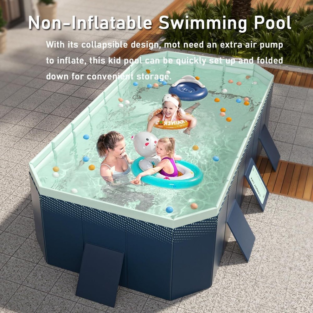 【Spacious and Versatile】 Our extra large foldable swimming pool is designed to accommodate both kids and adults, providing ample space for family fun and relaxation. 【Sturdy Construction】 Made with a hard plastic shell and premium PVC surface, and built-in NEW high-strength PP hard plastic shell to difficult to collapse and is resistant to punctures or leaks. Anti-skid bottom design makes your children safer when bathing or playing water. 【Easy Setup and Storage】 With its collapsible design, mot need an extra air pump to inflate, this kid pool can be quickly set up and folded down for convenient storage. Say goodbye to bulky, inflatable pools that take up valuable space when not in use. 【Quick drainage and Easy Clean】 Kid pool have 2 drains at the bottom and side for faster drainage, without leaving a lot of water in the pool, can save you time and easily clean the backyard pool. 【Refreshing Summer Fun】 Beat the heat and create lasting memories with our foldable non-inflatable swimming pool. Whether it's a playful splash for the kids or a relaxing soak for the adults, this pool is perfect for creating a refreshing oasis right in your own backyard. Color Blue Product Dimensions 116"L x 64.9"W x 21.6"H Shape Rectangular Material Polyvinyl Chloride (PVC), Plastic Age Range (Description) 3 years old + Frame Material Polyvinyl Chloride (PVC) Special Feature Cordless Target Audience Unisex-Kids Included Components Chlorine Dispenser