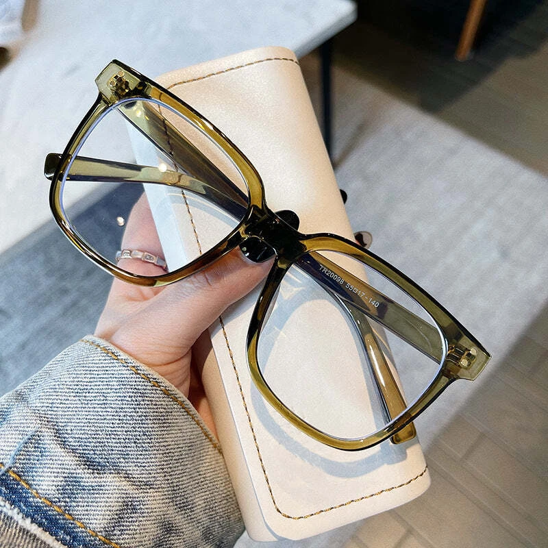 Product information: Applicable people: Adults Popular elements: point rivets Style: Versatile, casual style, stylish OL, simple, European and American, chic style, high sense Frame color: bright black-TR90, transparent-TR90, transparent gray-TR90, olive green TR90 Lens color; Anti-blue light Lens width: 54mm frame height: 55mm Nose spacing: 20mm Temple length: 144mm frame total width: 149mm Packing list: 1* glasses Product Image:
