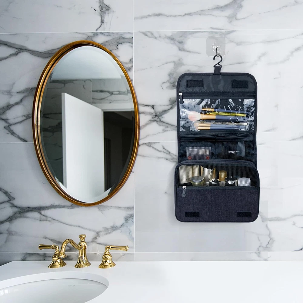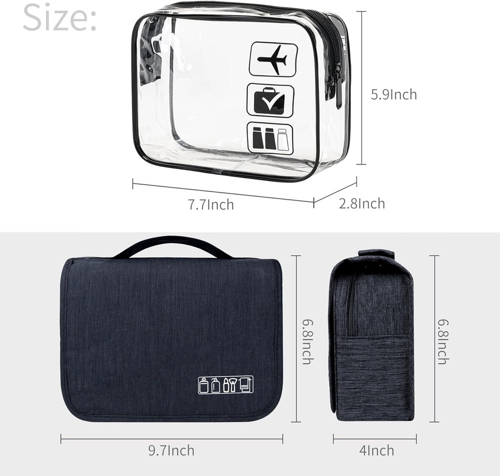 Large Capacity Toiletry Bag Travel with Hanging Hook A-Black+Clear Black Product Details Product Dimensions: 7.3 x 3.93 x 16.7 inches Item Weight: 5.5 ounces Manufacturer: Lcsmaokin Country of Origin: China Large Capacity:Lcsmaokin unfolded size of the toiletry bag is 9.7 x 4 x 16.7 inches,and it weighs 0.49 lbs.There is also a makeup bag with measures of 7.7 x 5.9 x 2.4 inches,which is suitable for your family trips to pack all kids,men and women toiletries Quality Fabric:The cosmetic bag is made of newly upgraded cationic 300D fabric,the surface is waterproof,wear-resistant and practical.Separate TSA-approved transparent toiletry bag strictly follows 3-1-1 regulation,for carry-on bags on all airlines Multiple Storage:It's easy to separate wet and dry items because of internal design waterproof compartment.Body washes,shampoos and other bulky items can be put right into the bag.Don't worry your items will spill,because there are dividers inside Practical Occasions:This toiletry bag is convenient to carry toiletries,cosmetics,daily supplies etc.It is suitable for business trips,home travels,gym showers,swimming,outdoor activities and so on Easy to Use:A large toiletry bag can help you categorize toiletries and cosmetics and separate them from other items.This travel toiletries bag is suitable for both men and women,and comes in multiple colors to choose from [HIGH-QUALITY FABRIC] The wash bag is made of newly upgraded cationic 300D fabric, the surface is four-level waterproof, wear-resistant and practical, rich in colors, suitable for all ages. [MULTIPLE STORAGE COMPARTMENTS] The large pocket is suitable for storing large items such as shower gel and facial cleanser, and the front zipper pocket can store toothpaste and toothbrushes. Two net bags put some small cosmetics and compressed towels. The transparent waterproof bag can store liquid-containing items, and the back pocket stores the Facial [CONVENIENT STORAGE] The hanging toiletry bag can be placed anywhere in the bathroom, making your toiletries and cosmetics clear at a glance and easy to grab [LARGE CAPACITY] The folded size of the toiletry bag is 9.7x4x6.8 inches, the unfolded size is 9.7x4x16.7 inches, and it weighs 225g [PRACTICAL OCCASIONS] Suitable for home furnishing travel toiletries cosmetic storage holiday gifts etc.