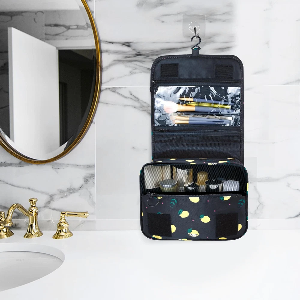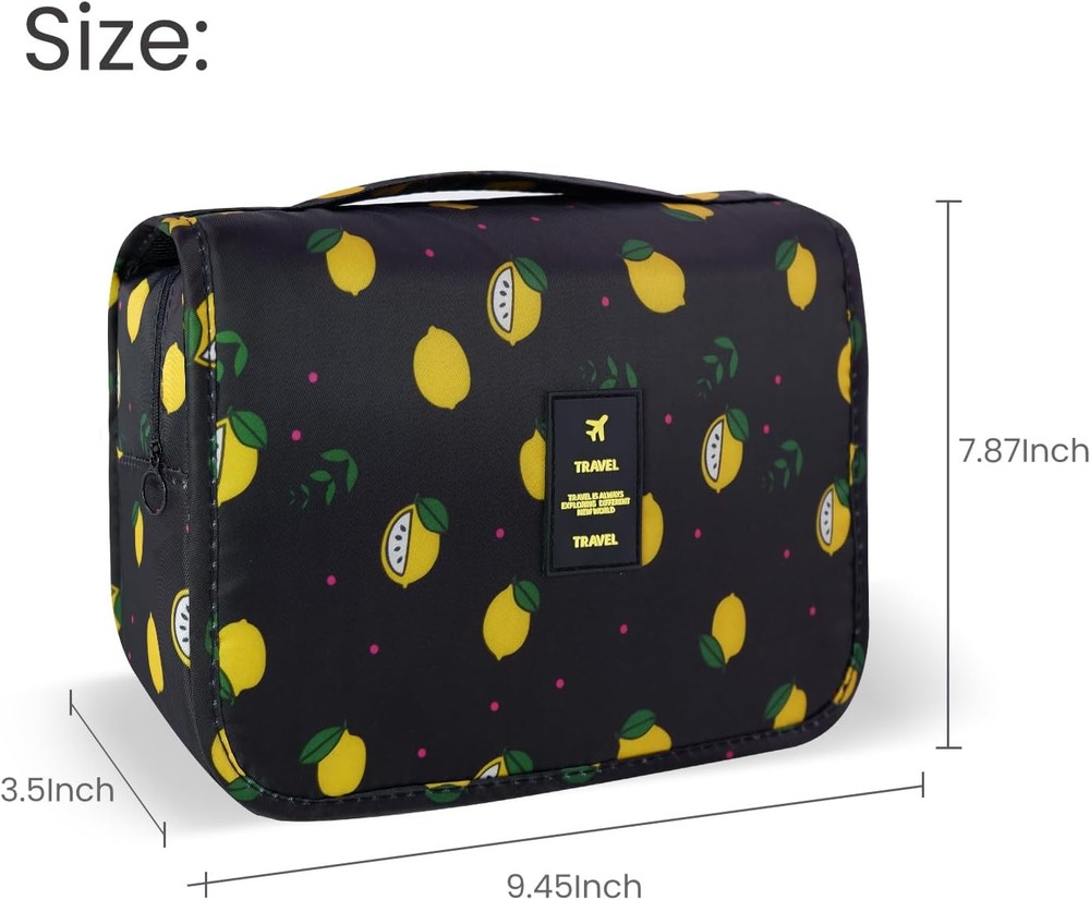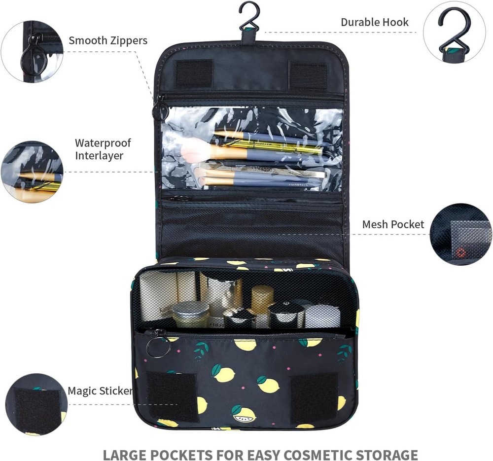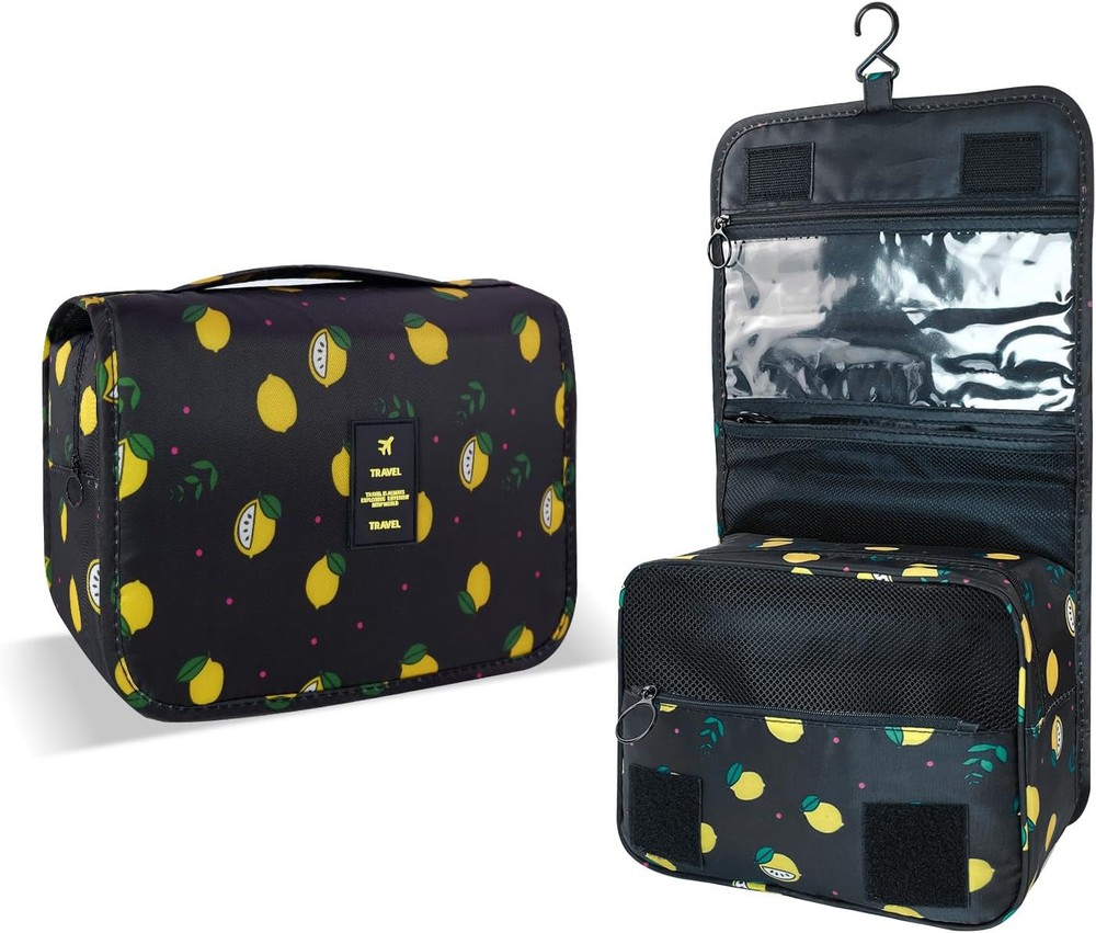 Large Capacity Toiletry Bag Travel with Hanging Hook for C-Lemon Black Product Details Product Dimensions: 9.45 x 3.5 x 16.1 inches Item Weight: 5 ounces Country of Origin: China Large Capacity:Lcsmaokin folded size of the toiletry bag is 9.45 x 7.87 x 0.39 inches,the unfolded size is 9.45 x 4 x 16.9 inches,and it weighs 0.33 lbs,which is suitable for your family trips to pack all kids,men and women toiletries Quality Fabric:The cosmetic bag is made of high quality oxford cloth,the surface is waterproof,wear-resistant,durable and practical.The shower bag can be hung on towel racks,coat racks and anywhere else available to save much space Multiple Storage:It's easy to separate wet and dry items because of internal design waterproof compartment.Body washes,shampoos and other bulky items can be put right into the bag.Don't worry your items will spill,because there are dividers inside Practical Occasions:This toiletry bag is convenient to carry toiletries,cosmetics,daily supplies etc.It is suitable for business trips,home travels,gym showers,swimming,outdoor activities and so on Easy to Use:A large toiletry bag can help you categorize toiletries and cosmetics and separate them from other items.This travel toiletries bag is suitable for both men and women,and comes in multiple colors to choose from [HIGH-QUALITY FABRIC] The wash bag is made of Oxford fabric, the surface is four-level waterproof, wear-resistant and practical, rich in colors, suitable for all ages. [MULTIPLE STORAGE COMPARTMENTS] The large pocket is suitable for storing large items such as shower gel and facial cleanser, and the front zipper pocket can store toothpaste and toothbrushes. Two net bags put some small cosmetics and compressed towels. The transparent waterproof bag can store liquid-containing items, and the back pocket stores the Facial [CONVENIENT STORAGE] The hanging toiletry bag can be placed anywhere in the bathroom, making your toiletries and cosmetics clear at a glance and easy to grab [LARGE CAPACITY] The folded size of the toiletry bag is 9.45x7.87 x0.39 inches, the unfolded size is 9.45x3.5x16.5 inches, and it weighs 0.4 lbs [PRACTICAL OCCASIONS] Suitable for home furnishing travel toiletries cosmetic storage holiday gifts etc.
