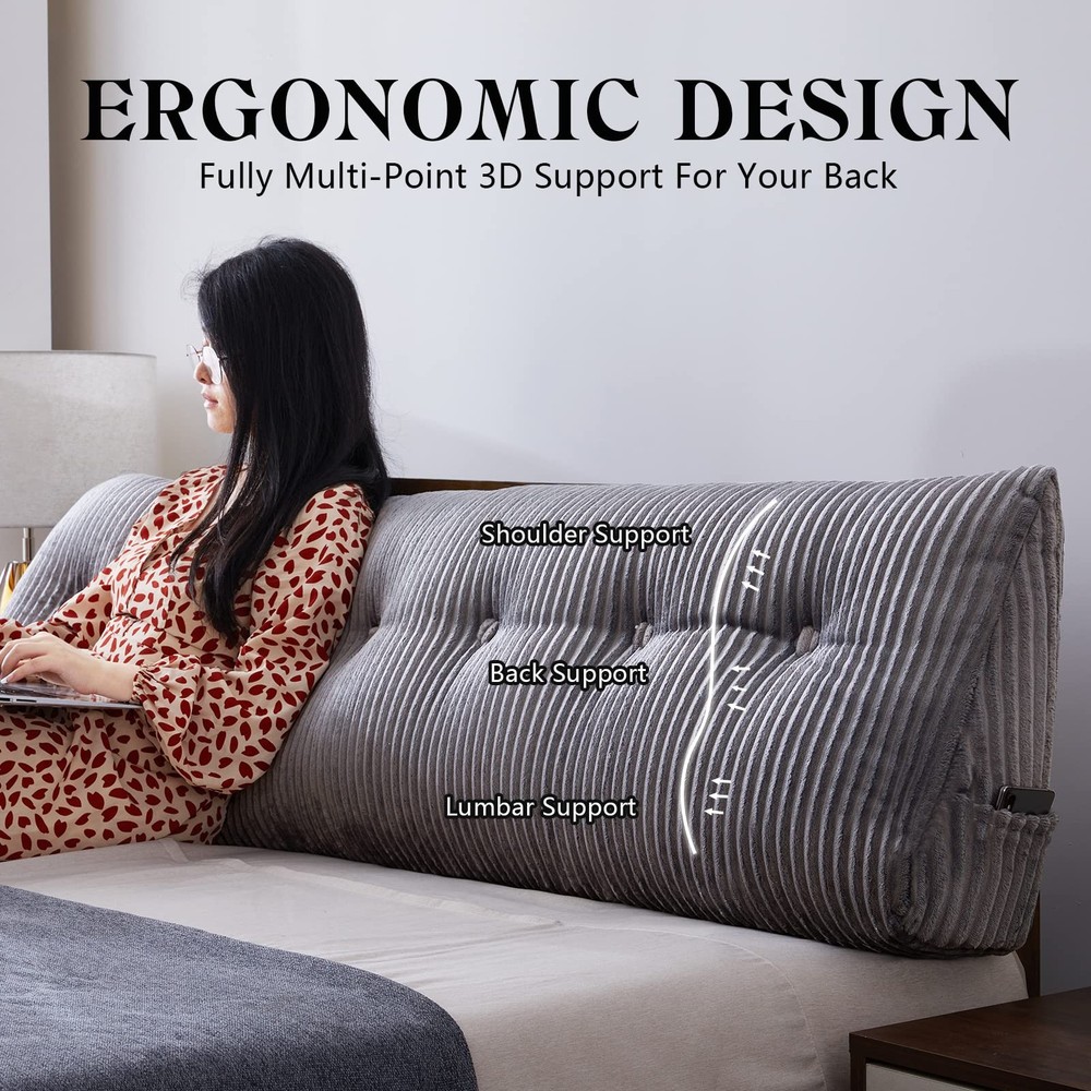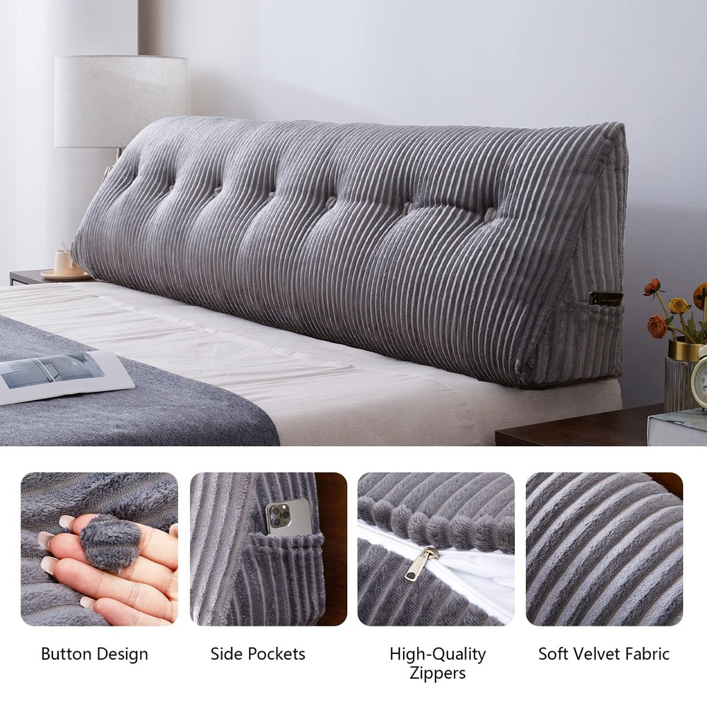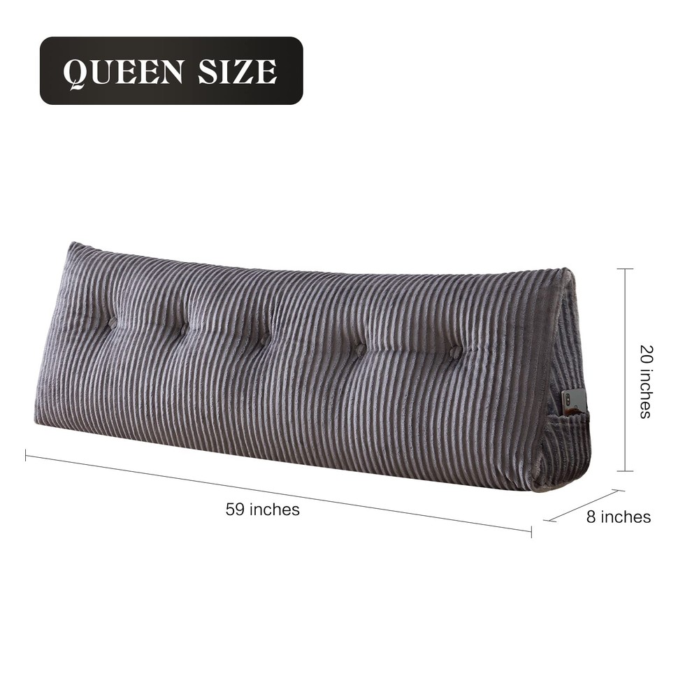 Large Headboard Pillow Headboard Wedge Pillow PERFECT READING PILLOW: Queen size, 59x8x20 Inches,the large triangular wedge headboard pillow fits perfectly to your mattress. ★NOTE: As the backrest is shipped compressed, please remove the vacuum bag,shake vigorously for 5 minutes, and allow 48 hours for the pillow to restore its original fluffy. PREMIUM QUALITY: The pillow cover is made of premium quality velvet fabric, insert is filled polyester fiber, excellent density and high resilience resilience can give you long-lasting comfort when leaning against the headboard.To remove the pillow cover, just un zip the pillow, take off the cover and unravel the buttons. GIVE YOU THE BEST USER EXPERIENCE: This large wedge headboard pillow is ergonomically designed to help to prevent many health conditions.,while still contouring to the body and providing excellent support for the back, arms, neck and shoulders. MULTIPURPOSE AND OCCASSIONS: The large bed wedge pillow for headboard can be used for many occassions. This rest pillow can work as couch pillow, backrest pillow, leg elevation pillow, knee pillow, headboard wedge pillow etc.Best used as a bed headboard for maximum comfort when working on a laptop, watching TV,sitting and playing games on bed. MACHINE WASHABLE: Our pillows features a convenient zipper closure and attached buttons, not only create a more dynamic pillow shape but also make the cover detachable and washable. When it comes time to clean, throw this set into the washing machine for a quick pick-me-up.