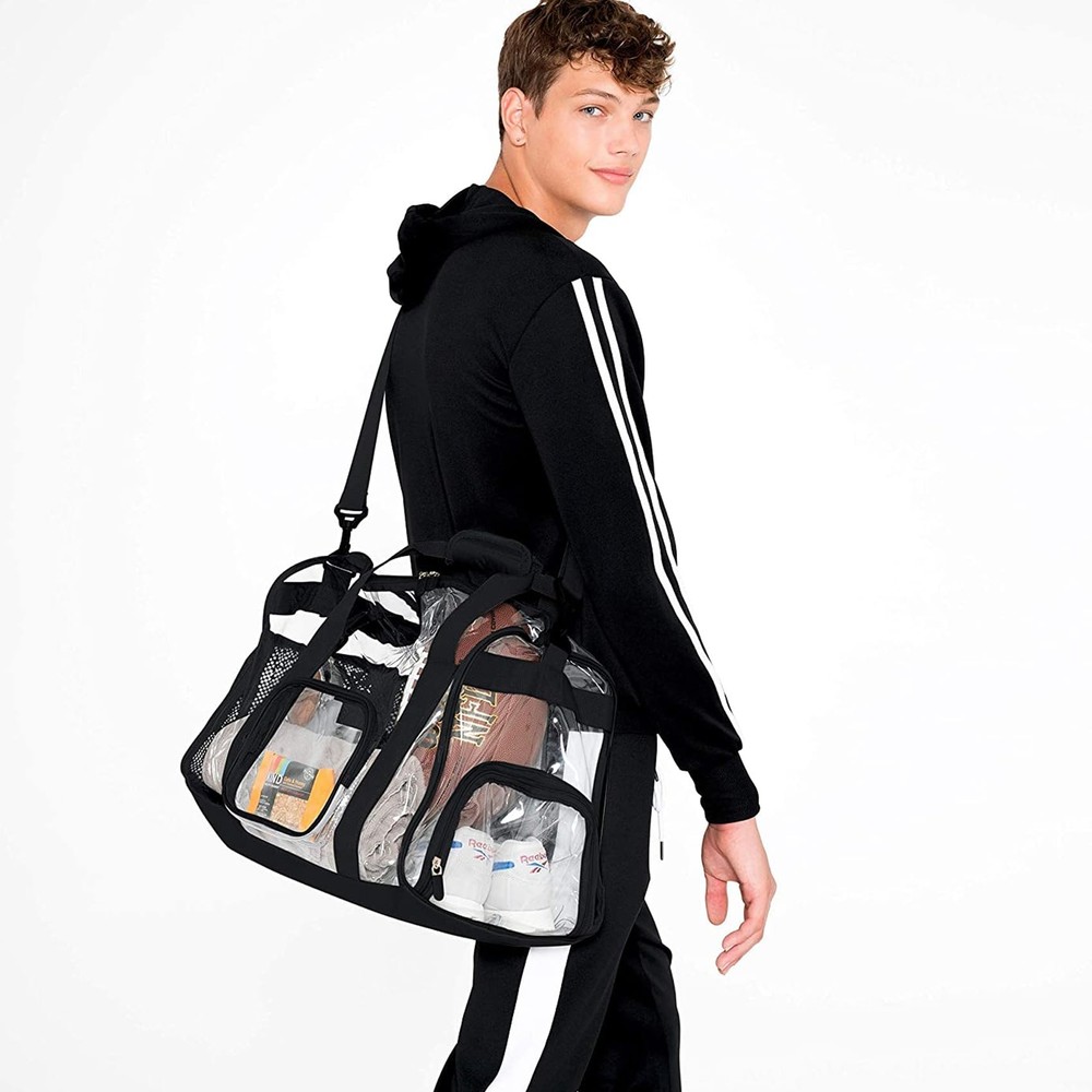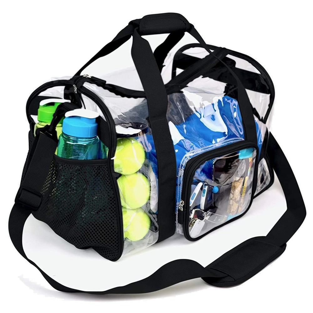 Size: biggest durable clear gym bag 17" x 12" x 12”(H x L x W) Strong Durable Heavy Duty Clear Material with Reinforced Double Stitching and Double Backed Nylon Webbing for game day, travel,and work Multifunctional compartments and large capacity: 1 large zippered main compartment for golf balls, sportswear, cosmetics, cell phones, etc., 1 separate inner pocket for sports shoes; 1 side mesh pocket for water bottles, 1 small pocket with zipper for tissues, keys The clear PVC package allows you to see exactly where everything is. You can easily get what you want in the first place Wide Usage: it is perfect for traveling, outdoor activities, baseball, football, basketball, and clothing storage. This large travel clear bag can be transformed into a sneaker bag, gym bag, sports bag, boxing bag, athletic bag