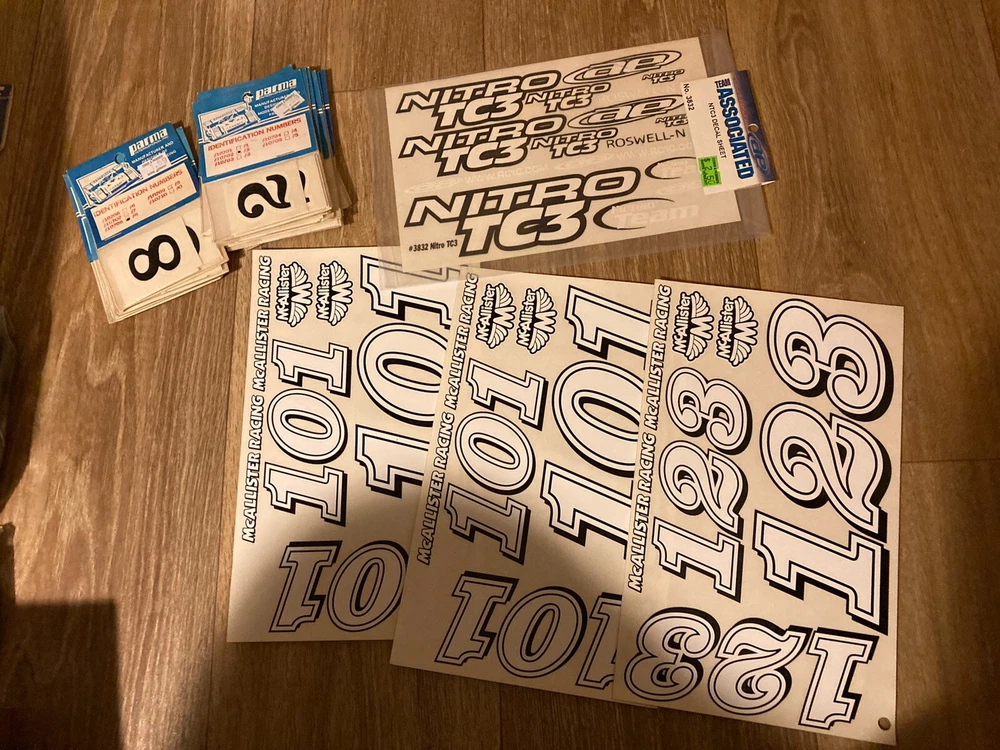 This is a large accumulation of Mostly 1/10 scale RC car numbers and there are a few other types as well. There a multiples of numbers in most of the numbers you can see that are sorted out. I think in a few cases there are 4 to 6 of some of the numbers. I counted 369 sheets or strips ranging in price from .79 to 2.25 plus there are a few (under 30) among the 369 that are priced $3.50 to $5.99. These are all adhesive type numbers and not decals. Not everything is well pictured but you can see the majority of the types that are included. The backs of a few of them have a small sticky spot where there was a price tag removed but does not hurt anything. These things have an approx. total retail value of $585.00 and my cost would have been about half of that or about $293. I’m asking a little better than half of what I paid which is $175.00. These are all old prices too so I suspect to buy them now would be a lot higher. I’ll consider offers but I won’t consider low ball offers unless these are on for a long time with no offers.