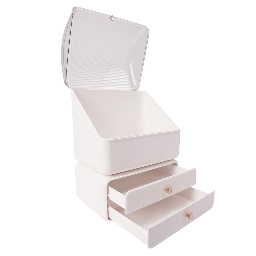 Cosmetic Storage Organizer Makeup Storage Box With Brush Holder Lid And Drawers Description The makeup organizer boasts ample space with its multi-compartment design, featuring a top compartment and 2 drawers, ensuring your cosmetics, skincare products, and jewelry are not only neatly arranged but also protected from dust. Complementing the set is a dedicated brush holder, with individual slots for each brush, it promotes quick drying after cleaning and easy selection during your daily routine, turning your morning prep into a breeze. Whether you're a professional makeup artist or a dedicated beauty enthusiast, this set will streamline your preparations and add a touch of sophistication to your vanity. Key Features Made to Last: The material of this makeup organizer is hard and durable plastic, which is environmentally friendly, non-toxic and odorless, and will not be easily deformed or damaged for long-term and safe use. Keep Tidy&Organized: It makes good use of the vertical space to store all kinds of cosmetics and skincare products neatly and it would be a great addition to your bedroom, bathroom, counter, dresser, and vanity to keep them a lot neater looking. Ample Storage Space: The 2 drawer can accommodate lipsticks, eyebrow pencils, face masks, and other items that can be placed flat. The top storage box can store most bottles on the market. Additionally, we also provide you with a rotatable makeup brush holder with 7 compartments to keep your makeup brushes standing upright, maintaining their shape and integrity and allowing for easy access. It can also be used as a pen holder to meet your diversified use needs. Thoughtful Helper: The makeup organizer features a thoughtful zoning design, so you can place products with different functions in the appropriate areas. The compartmentalized design not only makes full use of the space in the cosmetic case but also makes it easy to access. Considerate Design: The clear flip stays upright on its own to free your hands while the large opening of the box makes the retrieval and storage of cosmetics very convenient. It also adopts a dustproof cover and a closed drawer, which can effectively protect your cosmetics from water and dust. Wonderful Gift: The beautiful appearance and simple design make it a great gift. You can give it to your family members, colleagues, or friends to enhance their relationship with each other. Beautiful Appearance: The classic white color scheme with gold accessories highlights the product's unique image of luxury and vintage. Its simple and stylish appearance is generous, which is suitable for any decorative style of the room and is a good desktop decoration. Easy to Clean: Simple structure and smooth product surface make it easy to clean. You just need a dry/wet wipe to make it look new again. Installation-free : The makeup organizer you receive is already installed, you can get it and start using it right away. Details Pull-out Drawers: The bottom two drawers can be pulled out completely for easy access and cleaning. Exquisite Handle: The exquisite gold handle is not only a beautiful decoration but also makes the flip of the lid and the push and pull of the drawer more convenient. Non-slip Pads: They ensure the safety and stability of the cosmetic storage and display arrangement. Rounded Corners: The rounded corners can effectively avoid collisions and frictional injuries, thus providing you with a higher level of safety in use. Application It is suitable for use on the dressing table, bedroom, bathroom, bedside table, or living room to place your various cosmetics, such as water lotion, sunscreen, blocking cream, jewelry, lipstick, foundation, makeup brushes, eyeliners, eye shadow, nail polish, perfume, and other cosmetics. Specification Color: White Style: Modern Material: Plastic Process: Injection Molding Assembly Required: No Number of Pieces: 2 Mounting Type: Tabletop, Freestanding Gross Weight: 1.5kg/3.31lbs Net Weight: 1.3kg/2.87lbs Brush Holder Size (D*H): 13*24cm/5.12*9.45inch Cosmetic Case Size: 27*18*35cm/10.63*7.09*13.78inch Package Size: 35*26*18cm/13.78*10.24*7.09inch Package Included 1* Makeup Organizer 1* Brush Holder Notes Please pay attention to avoiding the makeup case from being scratched by sharp objects, or hit by heavy objects. Please avoid exposing it to the sun for a long time. Please allow the slight color difference caused by the shooting light and 1-3cm error due to manual measurement, and make sure you do not mind before ordering. Payment Delivery details Terms of sales About us Contact us Payment We accept ebay payment γ Fees such as import duties, taxes are not included in the item price or shipping costs. These charges are the buyer's responsibility. Delivery details Shipping: 2-9 working days to: USA Terms of sales We maintain high standards of excellence and strive for hundred percent customer satisfaction. Feedback is very important to us. We hope that you contact us immediately before you give neutral or negative feedback, so that we can address your concerns. It is impossible to address issues if we do not know about them! About us Your satis faction is our ultimate goal. We work hard to earn your trust and future business. Our certified technicians have tested each item before shipping. The unit comes with 1 year limited warranty on all manufacturing defects. a) If you receive a defective item, you may return it or ask for a discount. Please contact us within 14 days after you receive the package. b) What you returned must be intact and in its original packaging as re? u. Customer is responsible for shipping costs of the returned item. c) We will cover the cost of shipping back t with the shipping rate indicated in the registration page. We will send you a new unit or refund the full payment you paid. Thank you. Contact us Business Hour Business Hour: Monday To Friday: 8:30 AM to 5:00 PM (Beijing China time) Due to time zones, our reply to your questions may not be immedi