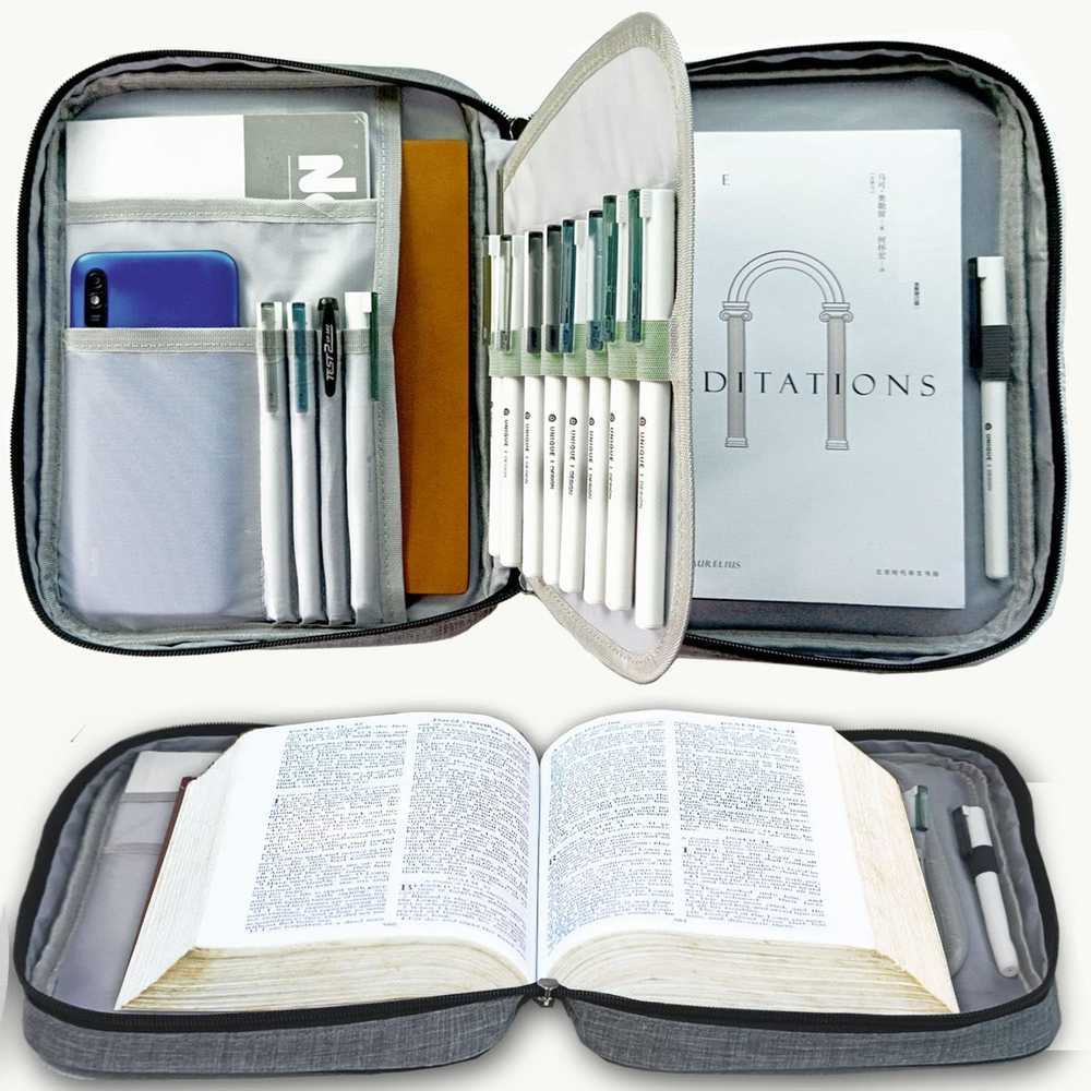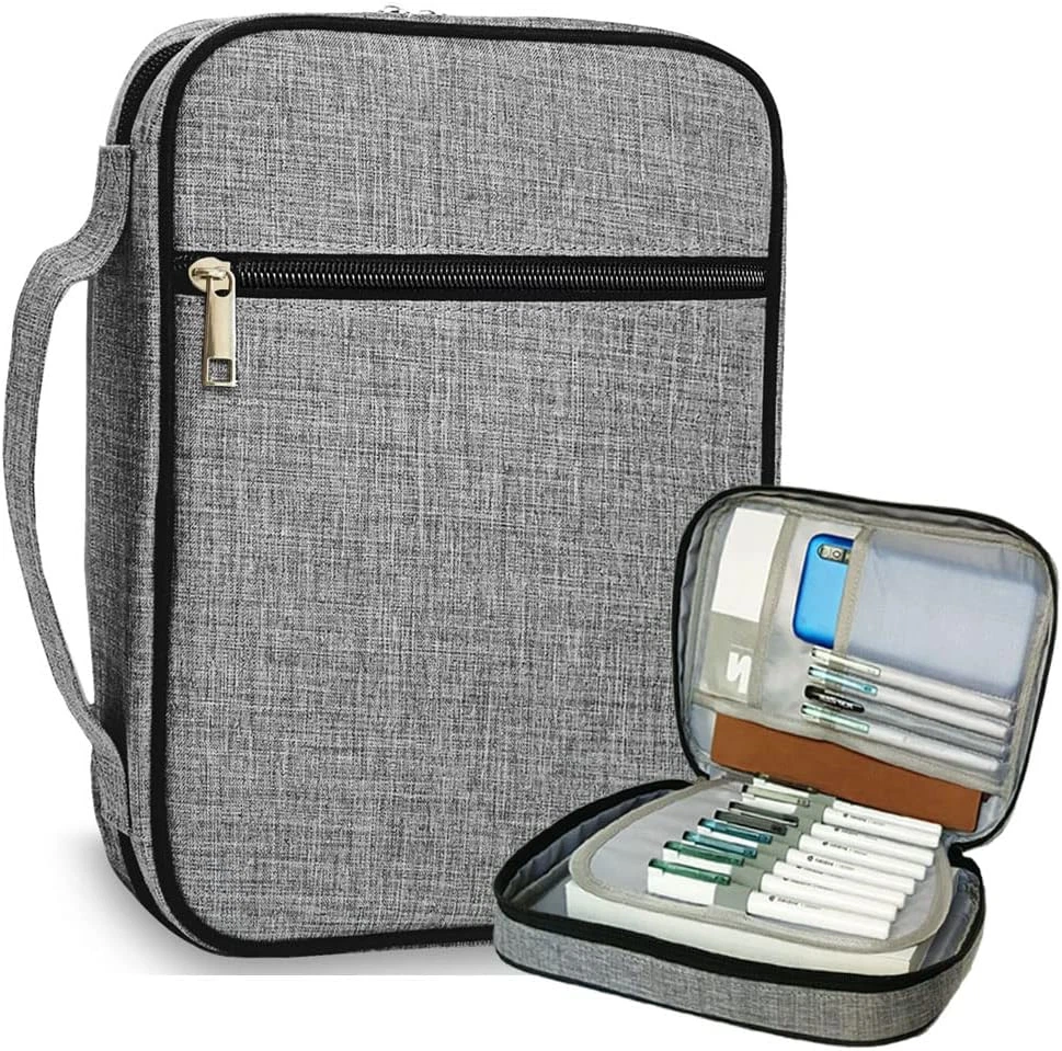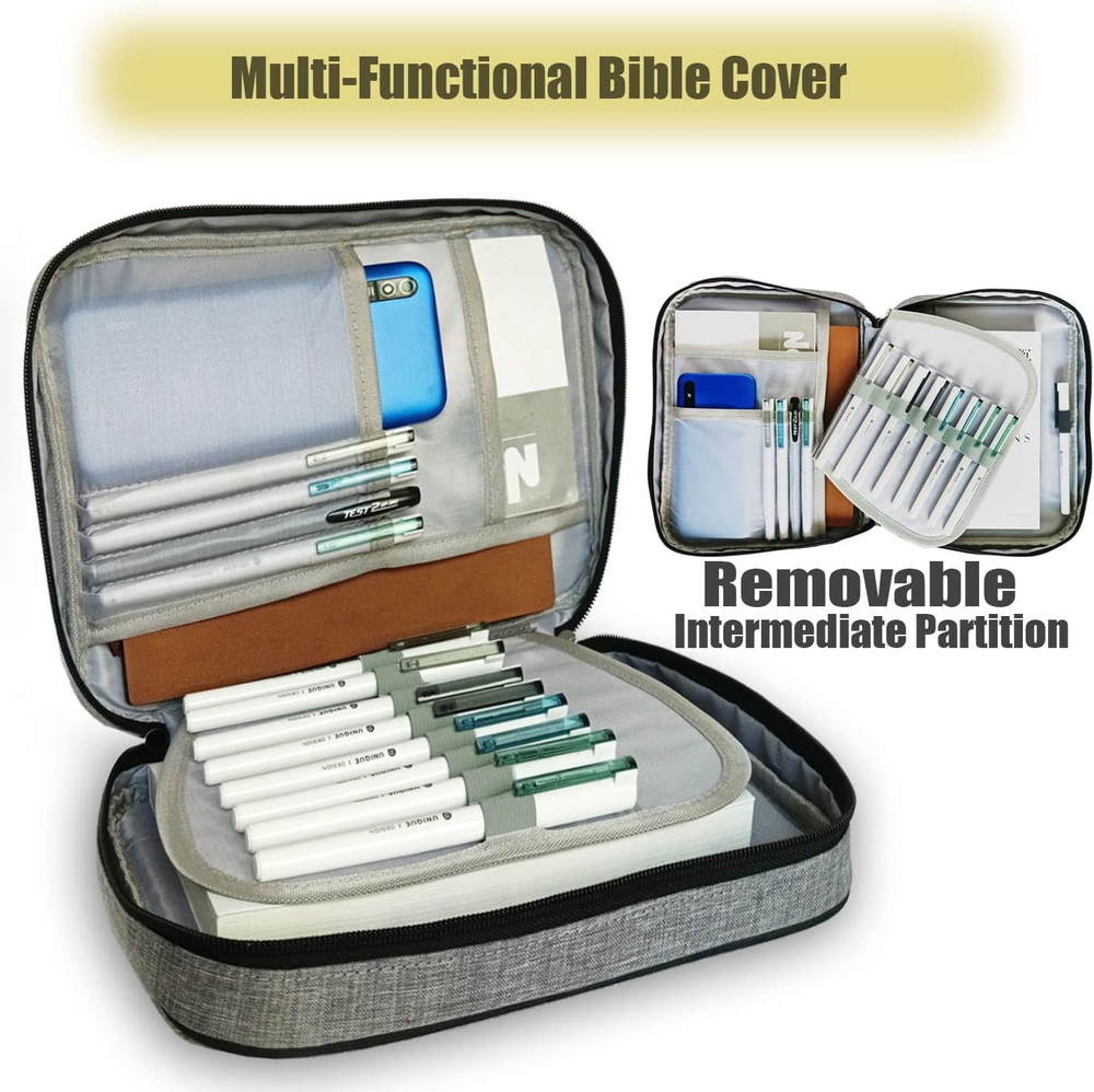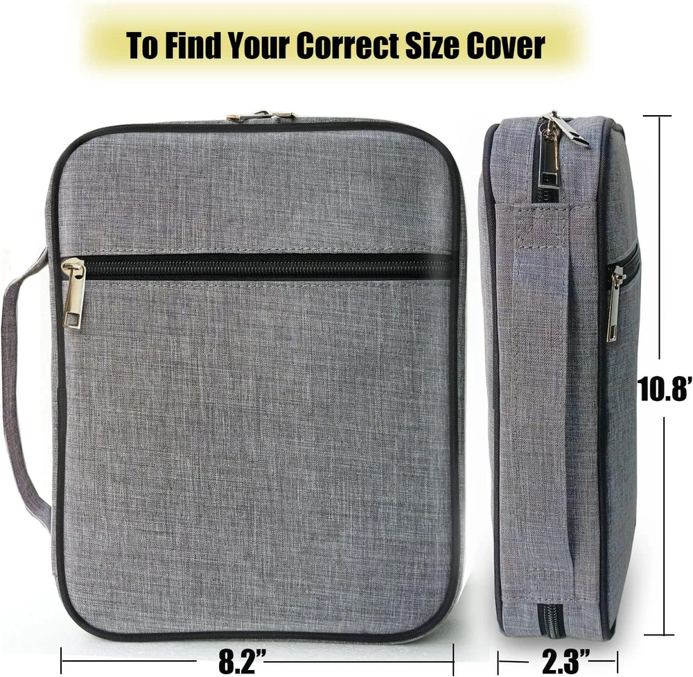 Large Capacity - 10.5×8×1.9inch Very suitable for most sizes of bibles/Book/Ipad, And it has a front pocket and multiple inner organizing pockets. The detachable layer in the middle, Make you more organized! Multi-functional - This Bible Organizer has many uses, you can use it as a document bag, briefcase,Pen Organizer,iPad bag.They are both good choices and have a wide range of uses. Durable Material - The Bible cover is made of premium canvas,Both sides have thickened foam cotton filling that durable enough to protect your heavy Bible Convenient Design - Double metal zipper and detachable layer,it is easy to open and close. Great for long-term use. A convenient handle at the spine makes it easy to just grab and go Perfect Gift - It's nice to gift for your lovers, children, friends,It’s also a good choice as a gift on birthdays, Christmas ,mother's day,father's day Product Description High Quality poly-canvas material Be made from durable poly-canvas material and high-quality metal zipper.Easy to clean, wipeable and hand washable.The elastic ring can hold each pencil or pen firmly and prevent them from falling. This bible case can protect your bible or iPad from scuffing Durable Material - The Bible cover is made of premium canvas,Both sides have thickened foam cotton filling that durable enough to protect your heavy Bible