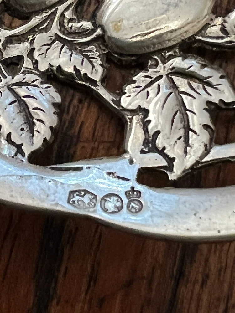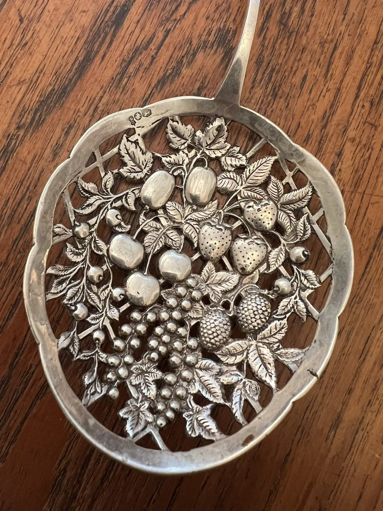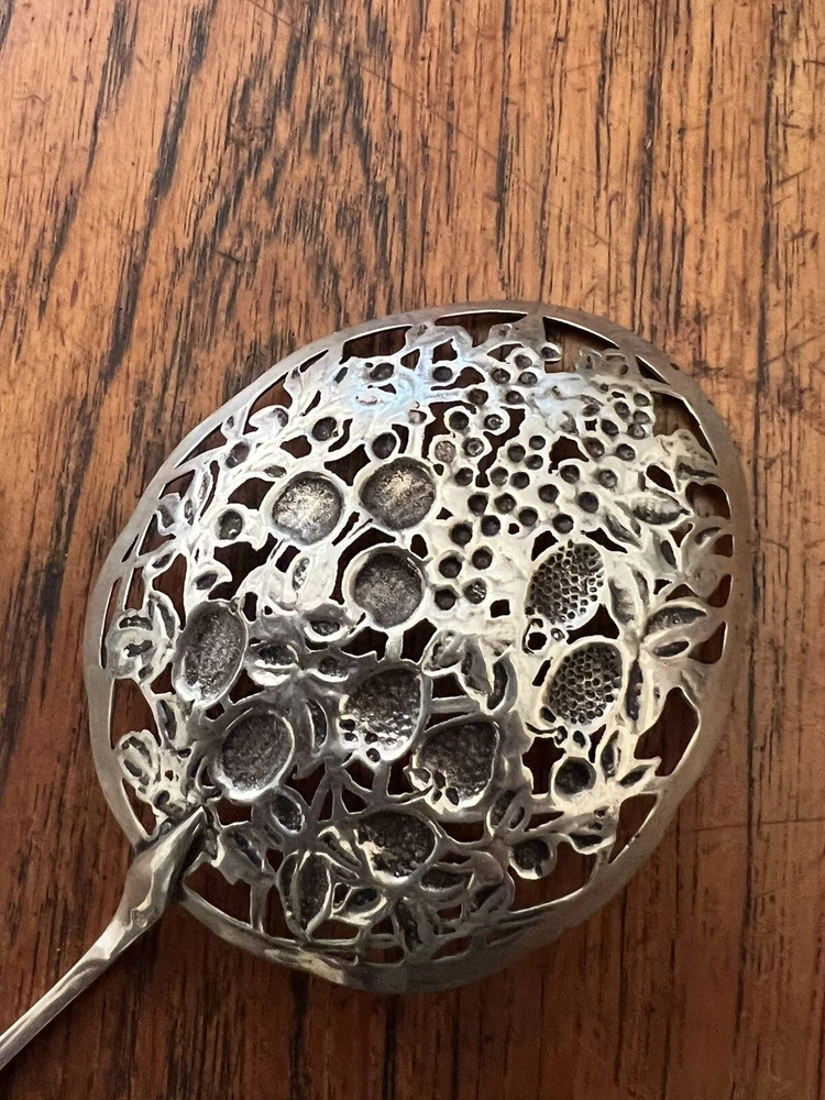 Large Ornate Antique Dutch hallmarks berry fruit pattern pierced serving spoon. Beautiful spoon measures 9” long. Bowl of spoon measures 4” by 3 1/4”