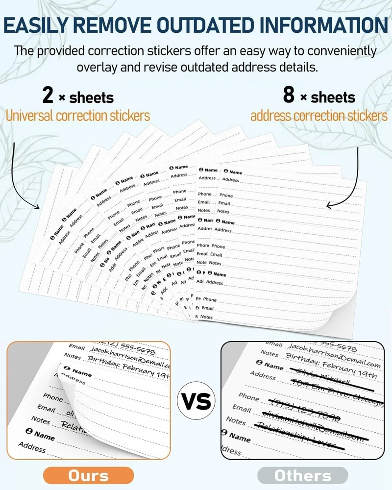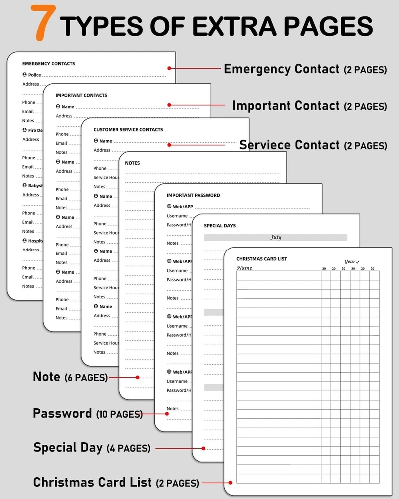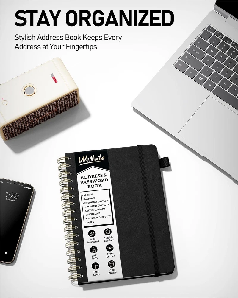 WEMATE Spiral Address Book with Alphabetical Tabs, Leather Password Book, Address Organizer Telephone Notebook Journal Keep Contact Safe Hardcover Large Print for Seniors Home Office 5.8″×8.2″, Black About this item : ALL-IN-ONE: This telephone address and password book measures 8.2 × 5.8 inches, offering 144 pages in total. Its convenient size allows for easy storage in handbags or desk drawers. It accommodates a total of 582 entries telephone and address information, with an additional 40 entries passwords. The book also includes 4 pages 12-month special dates, 2 pages emergency contacts, 2 pages important contacts, 2 pages customer service contacts, 2 pages Christmas card list, and 6 extra note pages. EXTREMELY USEFUL STICKERS: Comes with 8 sheets of address labels and 2 sheets blank correction labels, A unique way to update my old address different, Just apply a label over any address you need to change for effortless updates. ALPHABETICAL A-Z TABS: With separate tabbed sections designated for every letter of the alphabet, you can effortlessly locate the exact information you're searching for. Each section is designed to hold up to 24 addresses, and the book provides ample writing space to help you update and securely store your contact details with ease. PREMIUM QUALITY: Durable Vegan Leather, Exquisite Texture. 100 GSM Paper Resists Ink Bleed-through, Ensuring Long-lasting Value. Elevate Your Address Management. Enjoy 180° Lay Flat for effortless writing, 360° Flipping for comfortable reading from any angle. With added functionality of Sturdy Pen Loop & Elastic Band, Inner Pocket. SUPER NICE GIFT: A practical gift for family, friends, and partners. A great choice for seniors or individuals who favor a clean and easily legible design. With large print - easy readability