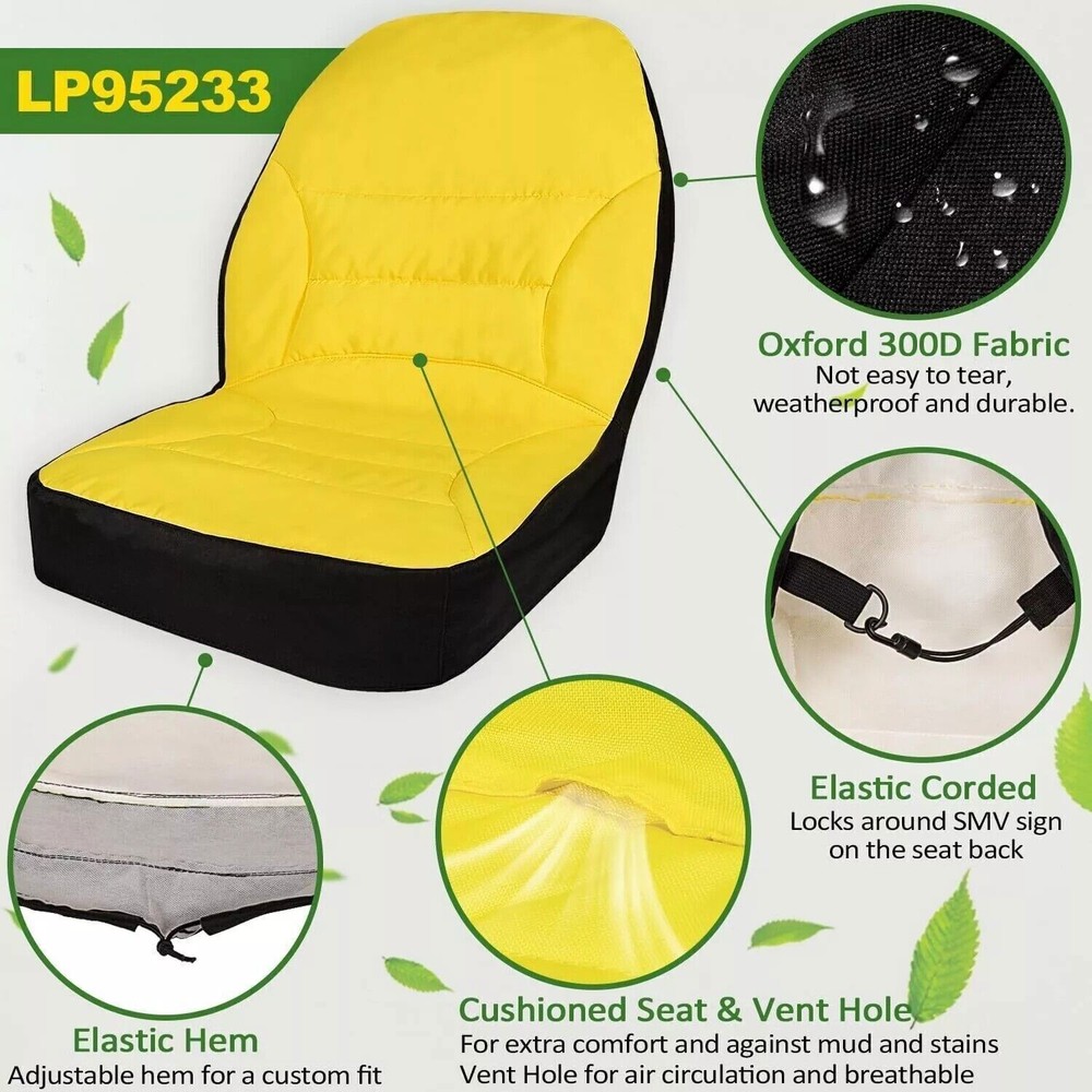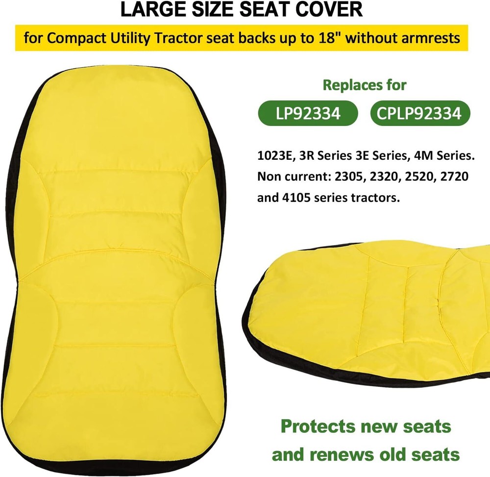 For John Deere 3E/3R/4M Series Compact Utility Tractors Large Seat Cover LP95233 Replace for LP95233 Large size perfect fit for John Deere Compact Utility Tractor seats with seat backs up to 18" WITHOUT armrests; 1023E, 3R Series, 3E Series, 4M Series. Non current: 2305, 2320, 2520, 2720, 4105. Superior Material Cushioned seat for extra comfort. Vent Hole for air circulation and breathable. Made of superior 300D Oxford fabric. Not easy to tear, elastic, abrasion resistant, scratch resistant and durable. Provide Proctection Renews old seats and Protects new seats from cracking due to weather and UV damage (such as sun, rain and dirt). Not only extending the life of the new seat is also a great solution to a cracked vinly seat. Easy to Install First, place the upper part of the seat cover over the seat-back, then wrap the lower part of the seat. Adjust the elastic cord tension around the safety sign on the seat back for a custom fit. It can stay firmly in place on and off the seat. Package included 1 * LP95233 Seat Cover. Payment Delivery details Returns Contact us Payment 1. All major credit cards are accepted through our secure payment processor Payoneer . 2. Please make sure your Shipping address is correct before you pay, cause it cannot be changed once the order shipped out. Delivery details Please read the shipment and payment detail carefully before you bid. Returns 1. Return to us within 60 days from the delivery date for exchange or refund. Refund will be given as Money back or item exchange (buyer's choice). 2. Return shipping fee is the responsibility of buyer unless the return is a result of our mistake. 3. If you need return, please contact our customer service representative, let us know the detailed problem and send us some pictures for confirmation. Contact us We apologize for the late reply during the holidays.Please contact us via ebay using" Contact member ". We will respond within 1 business day or less. Please include your ebay item number or order number in all communications.