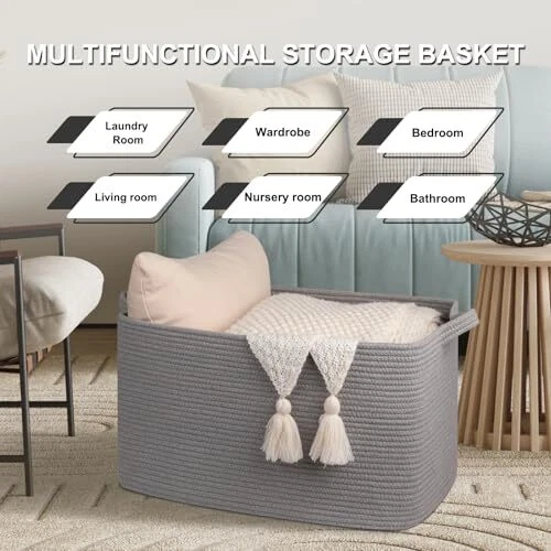 Return Policy Fast Delivery Trusted seller 65L Large Storage Basket, Cotton Rope Woven Blanket Basket, Toy Basket for Baby Room, Basket for Storage in Living Room, Grey Product Description Large Storage Basket: 65L large storage basket, perfect for throwing pillows, cushions, blankets, comforters, toys, and clothes. Keep the toy basket in the kid's room, family room, or any room in the house that could use extra storage: fits on a closet shelf, bookshelf, etc Natural Cotton: high-quality large blanket basket is made of cotton rope, No Nasty No Disgusting Smell, safe for Intimate Clothing. In addition, this woven basket for storage has no sharp edges and a hard surface, safe for kids, elders, and pets Double Sturdy Handles: We use high-grade cotton rope as raw material, which makes the storage baskets better wear resistance; In addition, the handle of this large basket has a unique design and is wrapped around with thick double-layer suture rope Collapsible Baskets: These rectangular storage baskets for organizing are foldable, which is easy to move and take away, simply fold the blanket basket down flat for space-saving storage when not in use or to transport Important Note: The premium woven storage baskets are packed compact for shipping, you may find some crease on the item, you can fully stuff the pillow basket with towels or clothes to restore shape. Or fast smoothing the creases by steaming or Ironing Shipping Returns Payment Shipping Shipping is FREE to all addresses other than APO/PO boxes in the lower 48 states. All our stock ships from US-based warehouses. Shipped via USPS or UPS (depending on location and package weight) Unless stated otherwise, all orders will ship within 24-72 hours of your payment being processed. Check our feedback to see the great reviews of FAST shipping we offer. Returns Seller does not accept returns Payment We currently accept payment via eBay managed payments only. Once payment is cleared, we will dispatch your shipment within 1-3 business days. Please refer to the "Shipping" tab for more information regarding shipping speed to your destination.