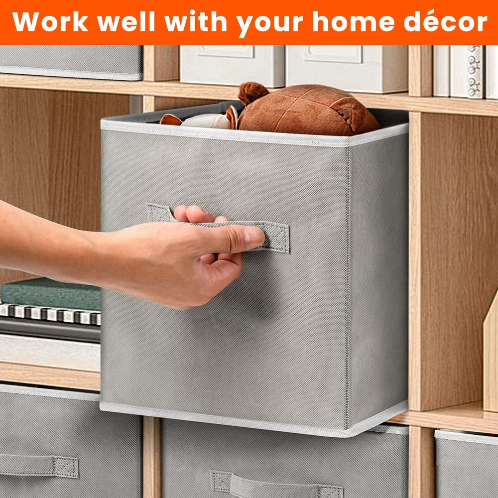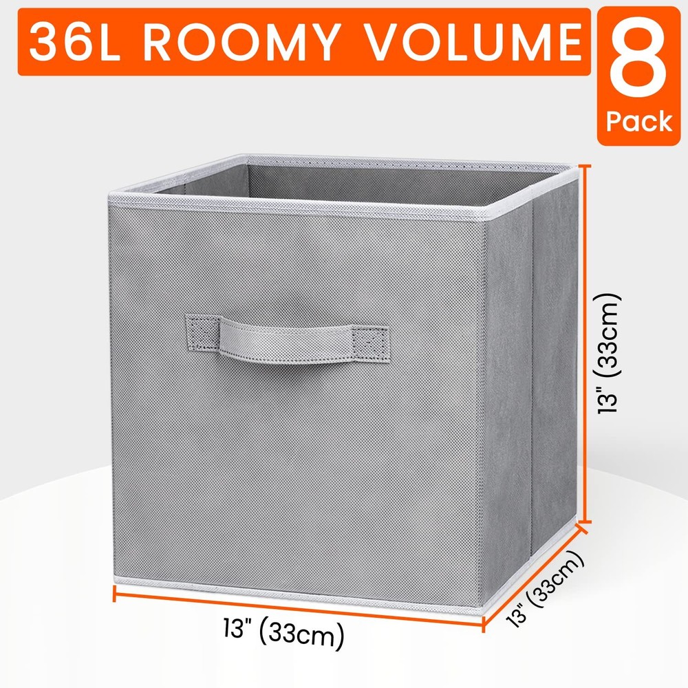 【QUALITY STRUCTURE】These cubby storage bins are made from tough non-woven fabric with excellent sewing to make them last, heavy cardboards added at the sides and bottom to make this storage bins rigid enough to hold a heavy load. 【FIT WITH MOST OF FURNISHING】Measuring 13x13x13 inches, our 8 pack Grey clothes storage bins could fit perfectly with most of cube organizer, shelf, closet, from bedroom to playroom to laundry room, to store clothes, linens, toyes, books etc. Great for dorm room. Color: Grey. 【EASY GRIP】These fabric storage cubes have two sewn-in handles on the sides for easy room-to-room carrying or removing on a shelf. With the reinfored handles, they could work well as drawers, open-top bins, or storage baskets for shelves. 【COLLAPSIBLE DESIGN】These cube storage bins could be fold flat for compact use when not in use. 【SPACE SAVING】These square storage bin is dorm room essentials and apartment essentials for closet storage and organization, making all rooms neat and clean.