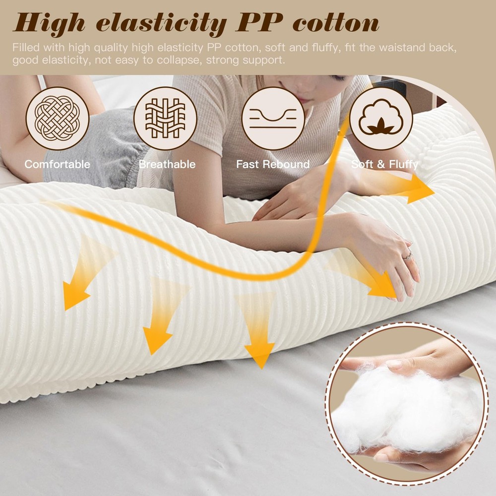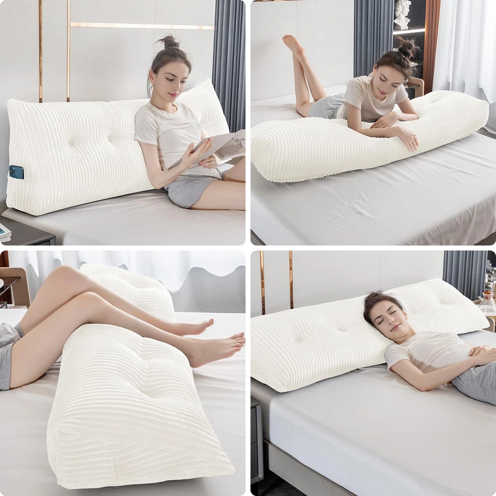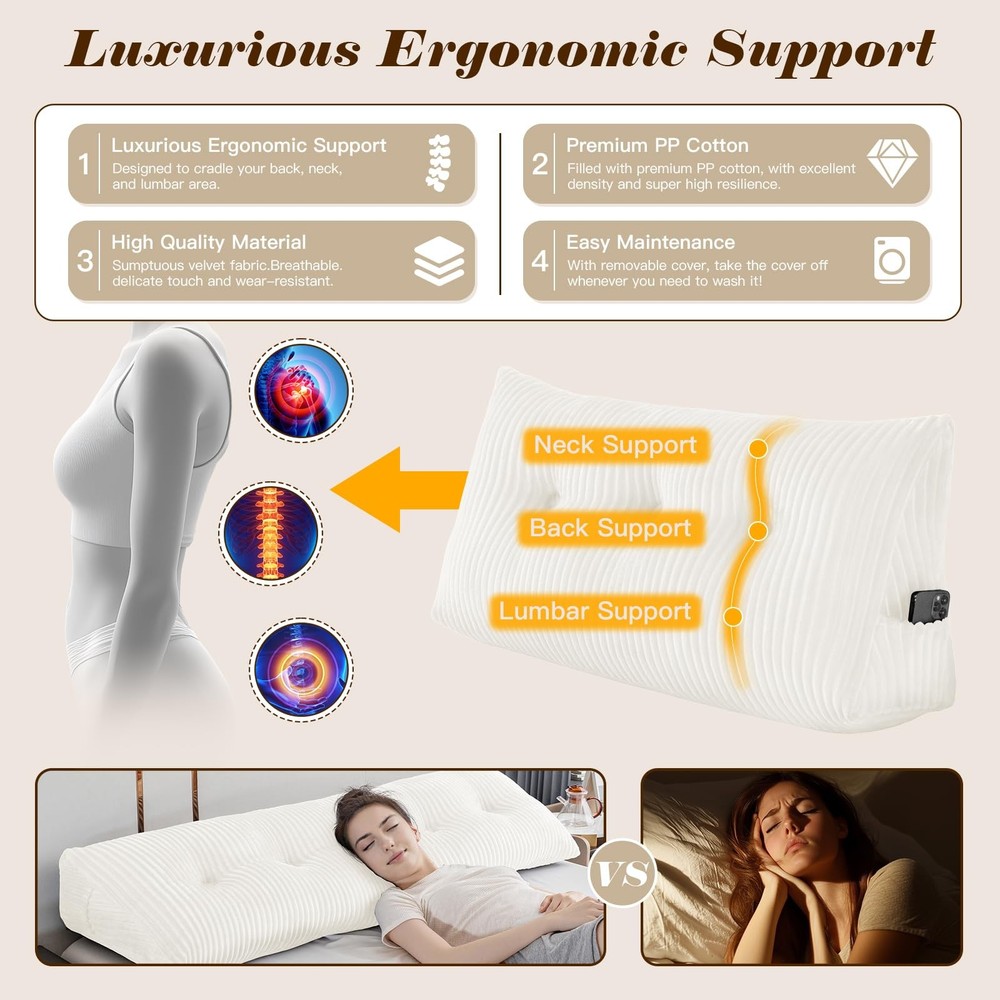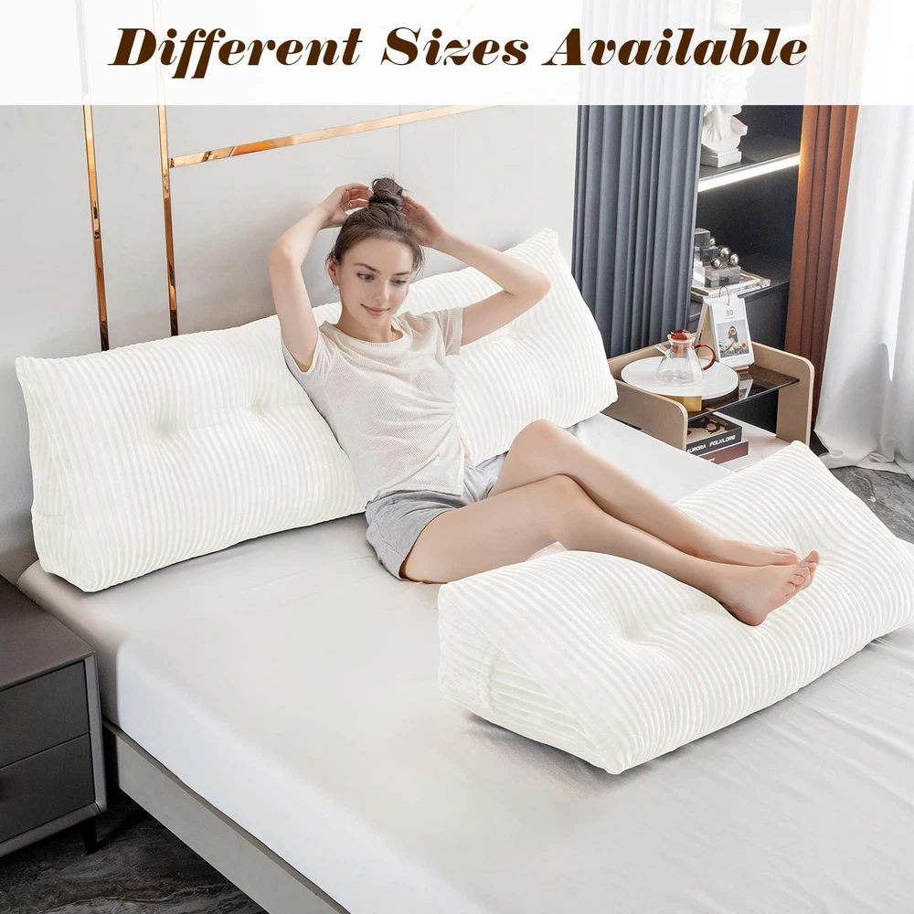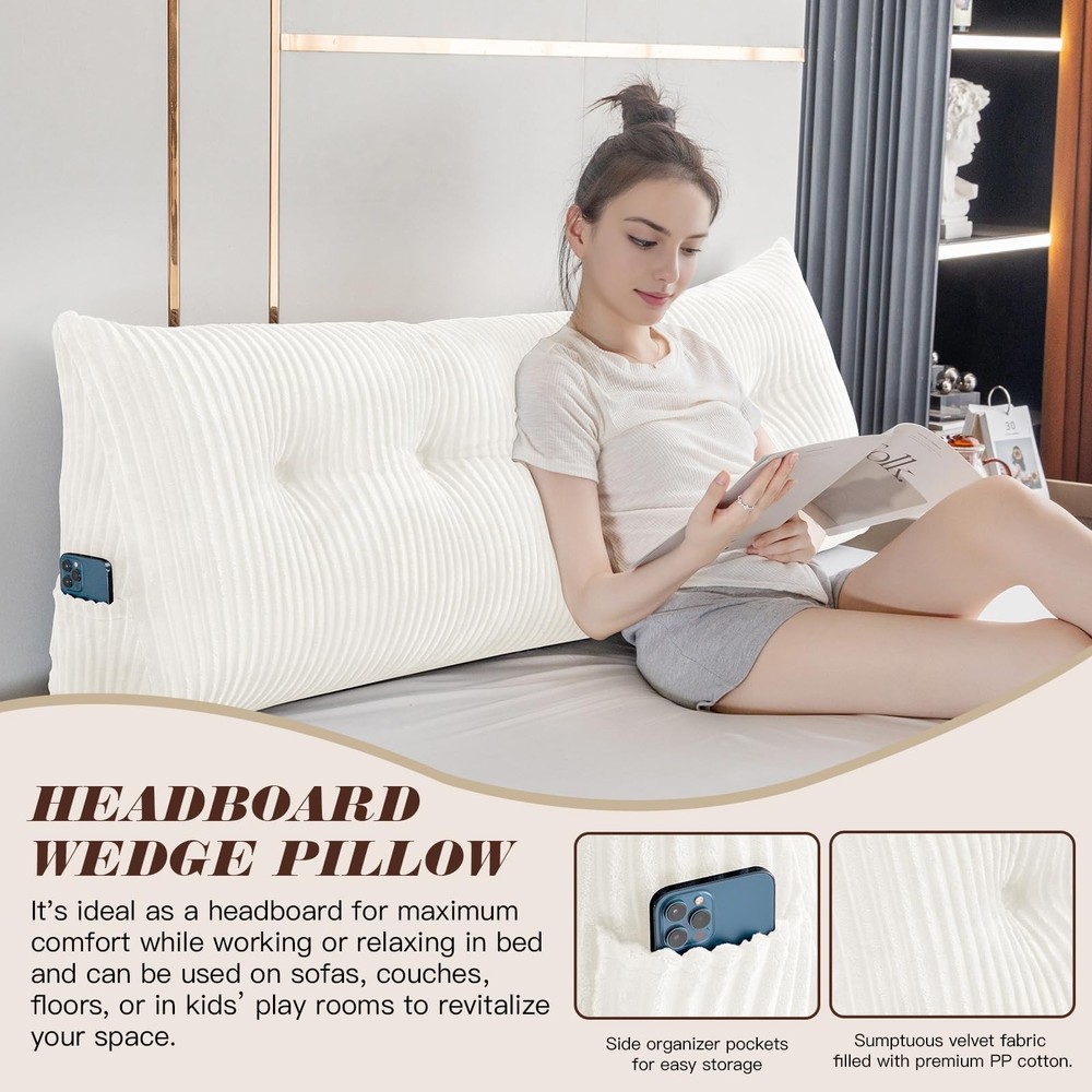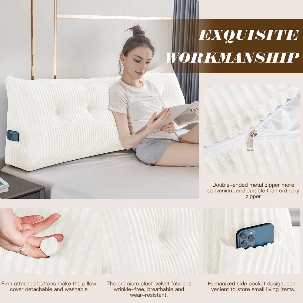 Large Triangular Bed Rest Reading Wedge Pillow Headboard Backrest Positioning Support Bolster Lumbar Cushion with Removable Cover 【SIZE】 Queen size, 59x8x20 Inches, the large triangular wedge pillow itself aligns with the width of the mattress, alternative as a headboard. ★NOTE: As the backrest is shipped compressed, please remove the vacuum bag, shake vigorously for 5 minutes, and allow 48 hours for the pillow to restore its original fluffy. 【HIGH QUALITY MATERIAL】 Made of premium three-dimensional velvet fabric, the triangular backrest pillow’s cover is breathable, delicate touch and wear-resistant; filled with upgraded environmental-friendly 15D polyester fiberfill, with excellent density and super high resilience. To remove the pillow cover, just unzip the pillow, take off the cover and unravel the buttons. 【ERGONOMICALLY DESIGNED TRIANGLE SHAPE】 This large triangular pillow is ergonomically designed to support the natural curvature of the back and provide optimal elevation for the upper body. It can reduce your back and shoulder stress and provide proper support while you are reading and resting. 【MULTIPURPOSE】 Allows maximum back support for upright activities such as working on a laptop, watching TV, play games or reading in your bed. You can also lay down the wedge pillow for a different angle and lie on it while reading a book or using your cell phone. 【DECORATIVE PILLOW】 The large headboard backrest pillow is a fashionable home decoration, suitable for bed, sofa bed, tatami, iron bed, recliner, window seat, bedroom, bay window, all seasons rooms, dormitory bed student bed children's bed headrest, etc.