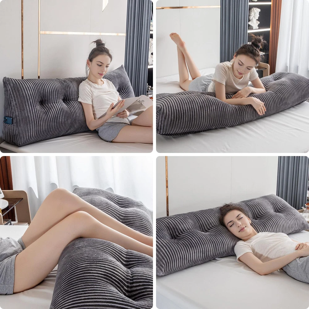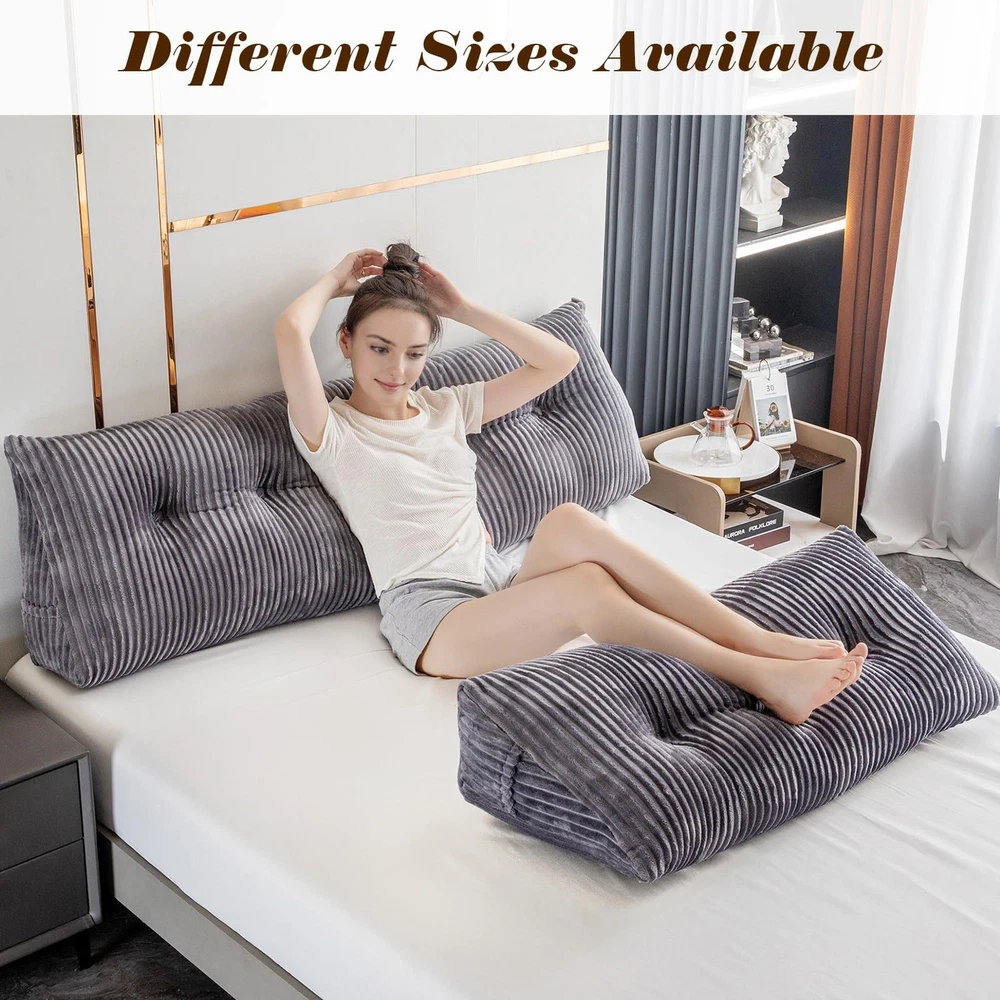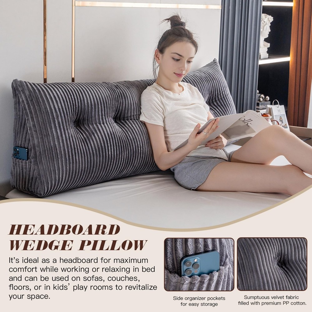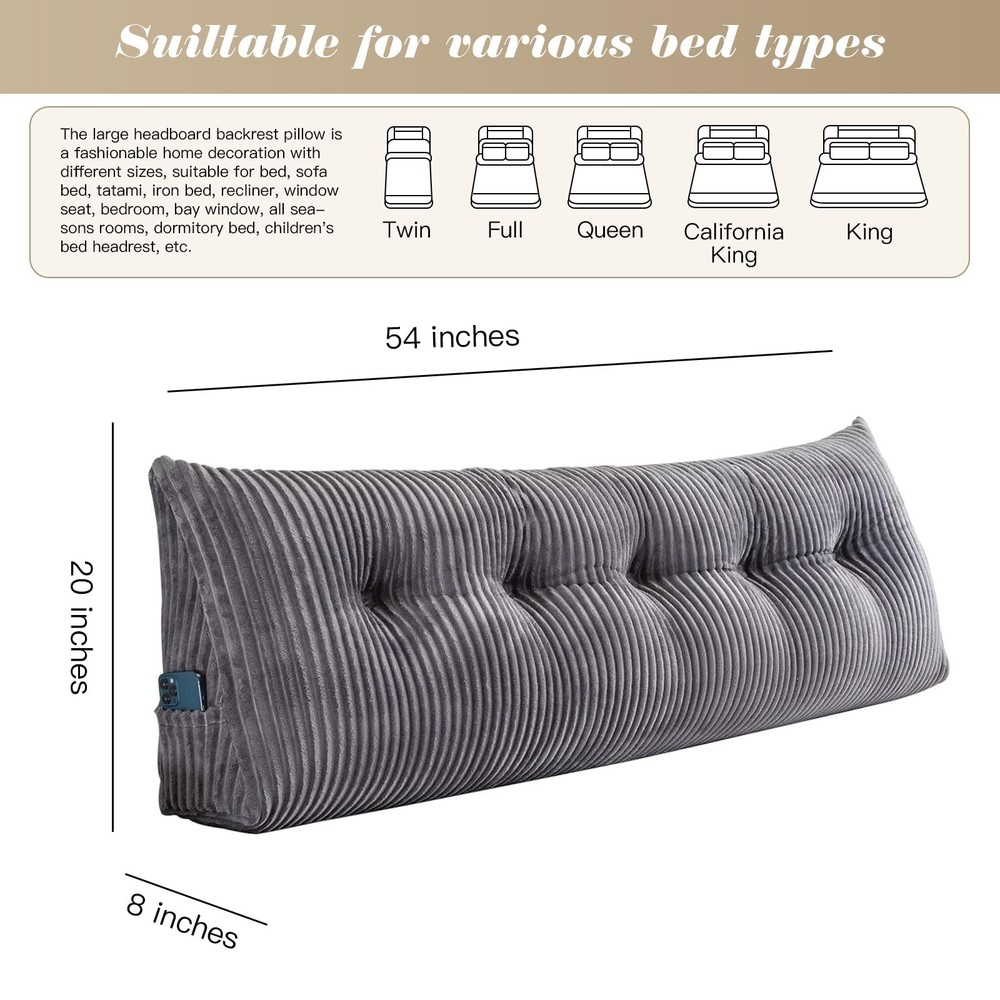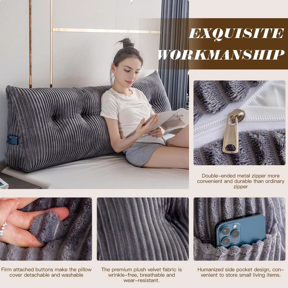 Large Triangular Bed Rest Reading Wedge Pillow Headboard Backrest Positioning Support Bolster Lumbar Cushion with Removable Cover 【SIZE】 Queen size, 59x8x20 Inches, the large triangular wedge pillow itself aligns with the width of the mattress, alternative as a headboard. ★NOTE: As the backrest is shipped compressed, please remove the vacuum bag, shake vigorously for 5 minutes, and allow 48 hours for the pillow to restore its original fluffy. 【HIGH QUALITY MATERIAL】Made of premium three-dimensional velvet fabric, the triangular backrest pillow’s cover is breathable, delicate touch and wear-resistant; filled with upgraded environmental-friendly 15D polyester fiberfill, with excellent density and super high resilience. To remove the pillow cover, just unzip the pillow, take off the cover and unravel the buttons. 【ERGONOMICALLY DESIGNED TRIANGLE SHAPE】 This large triangular pillow is ergonomically designed to support the natural curvature of the back and provide optimal elevation for the upper body. It can reduce your back and shoulder stress and provide proper support while you are reading and resting. 【MULTIPURPOSE】 Allows maximum back support for upright activities such as working on a laptop, watching TV, play games or reading in your bed. You can also lay down the wedge pillow for a different angle and lie on it while reading a book or using your cell phone. 【DECORATIVE PILLOW】 The large headboard backrest pillow is a fashionable home decoration, suitable for bed, sofa bed, tatami, iron bed, recliner, window seat, bedroom, bay window, all seasons rooms, dormitory bed student bed children's bed headrest, etc.