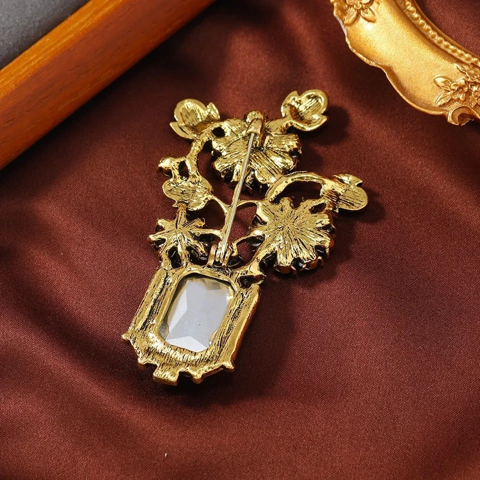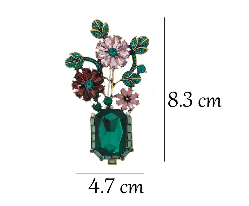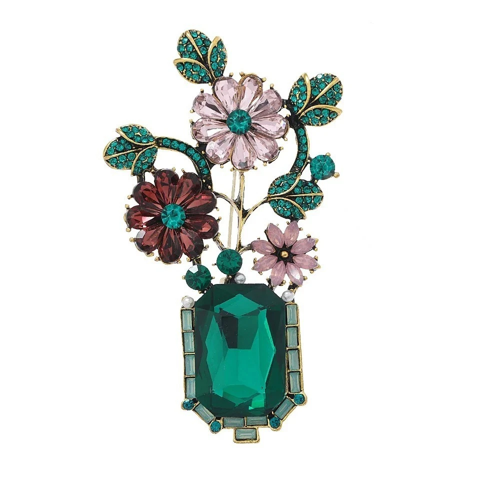 Large Vintage Crystal Rhinestone Flowers in A Green Vase Brooches Pins for Women
